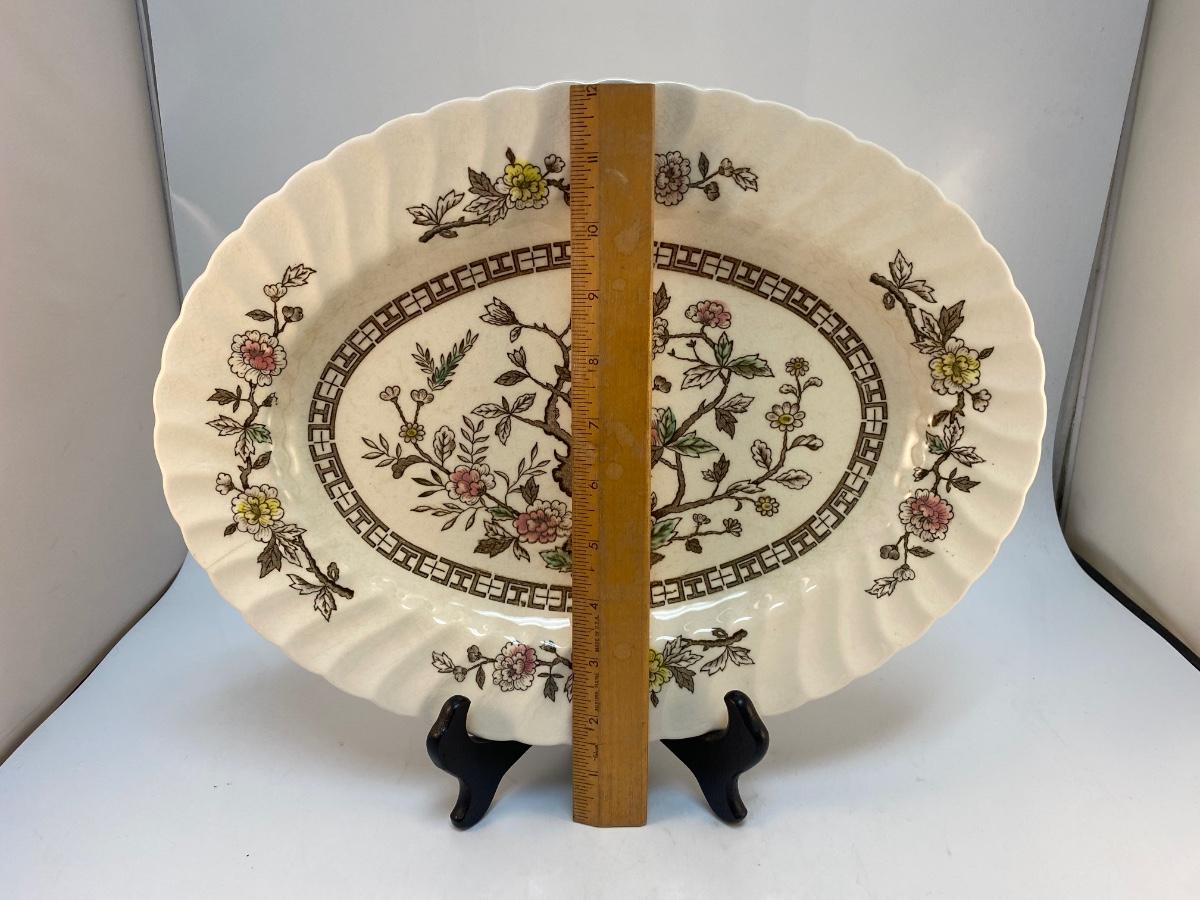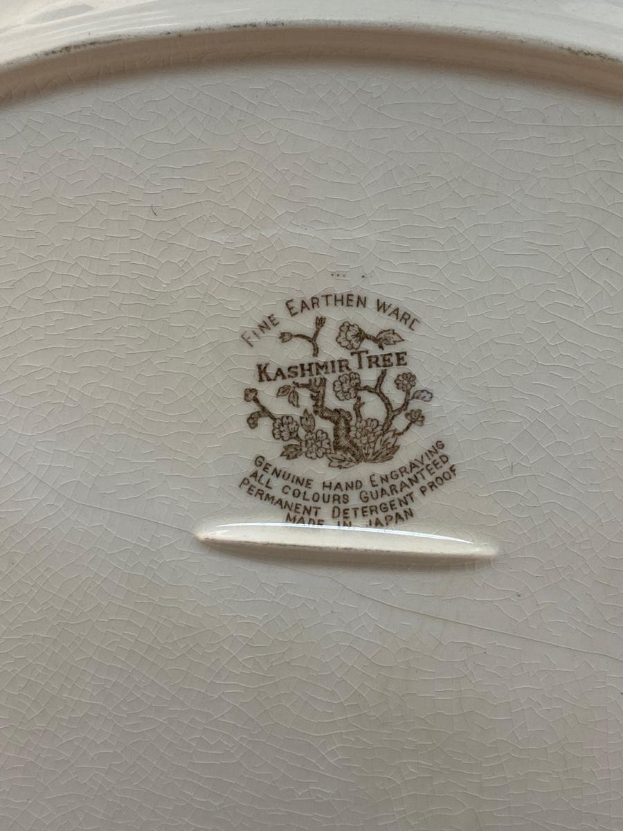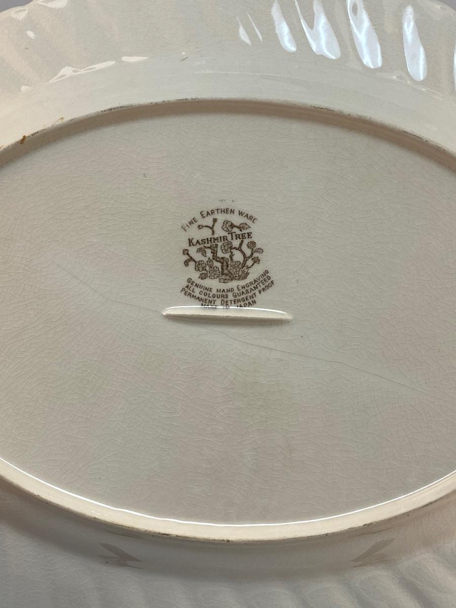 Vintage Earthen Ware Kashmir Tree Hand Engraving Scalloped Edge Serving Platter. Made in Japan. Displays nicely, does have crazing all over. On the back there is a fine line crack in the center, but it does not seem to go all the way through the plate. Roughly 15"x11" size. Despite the crazing there are no chips.