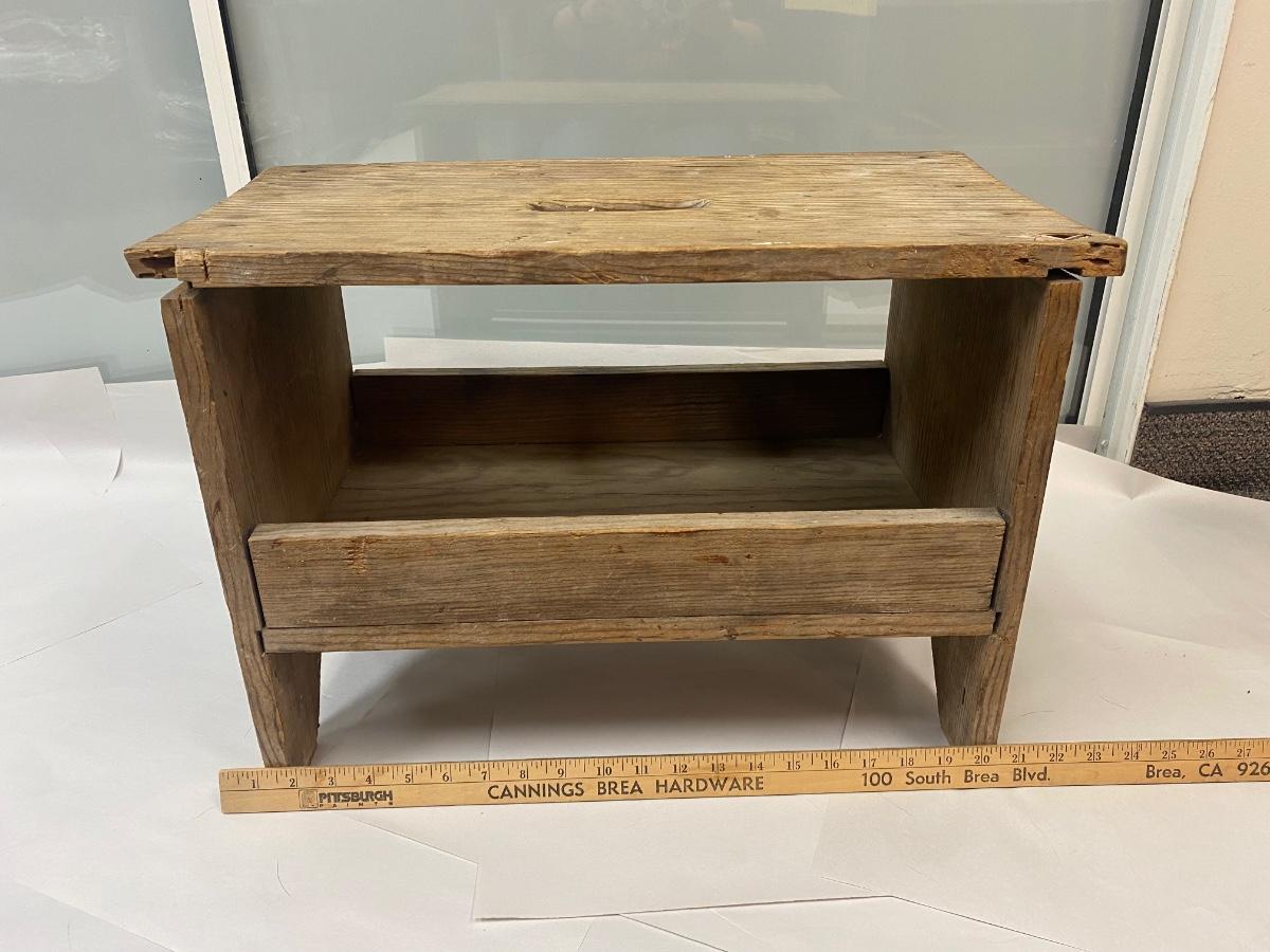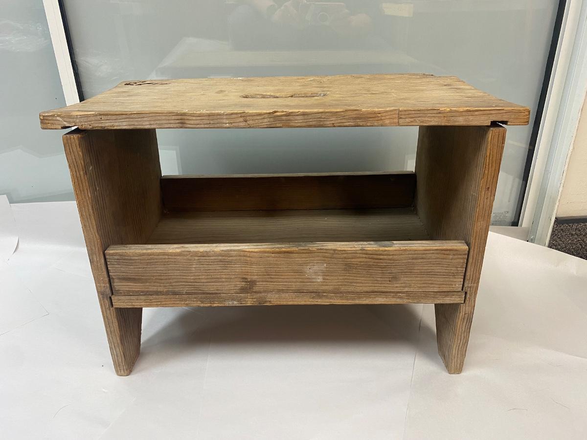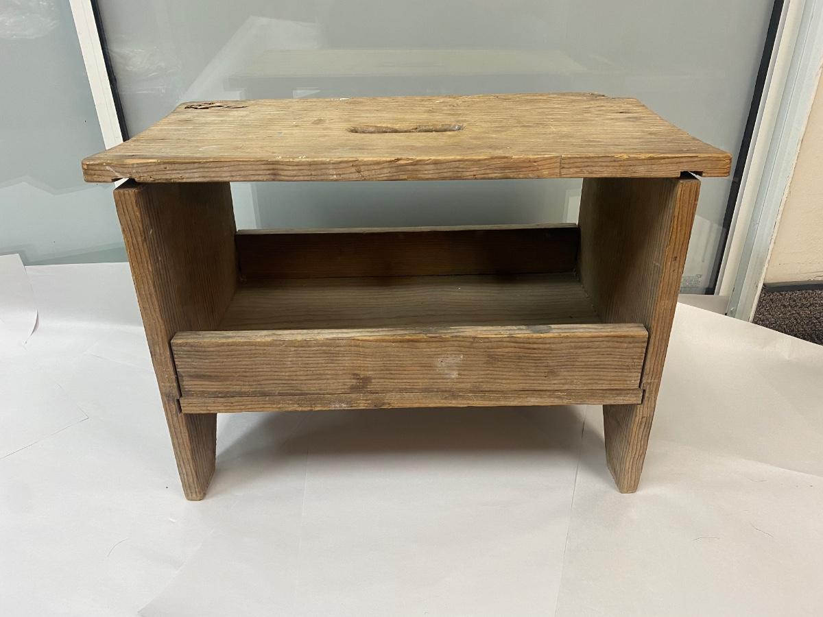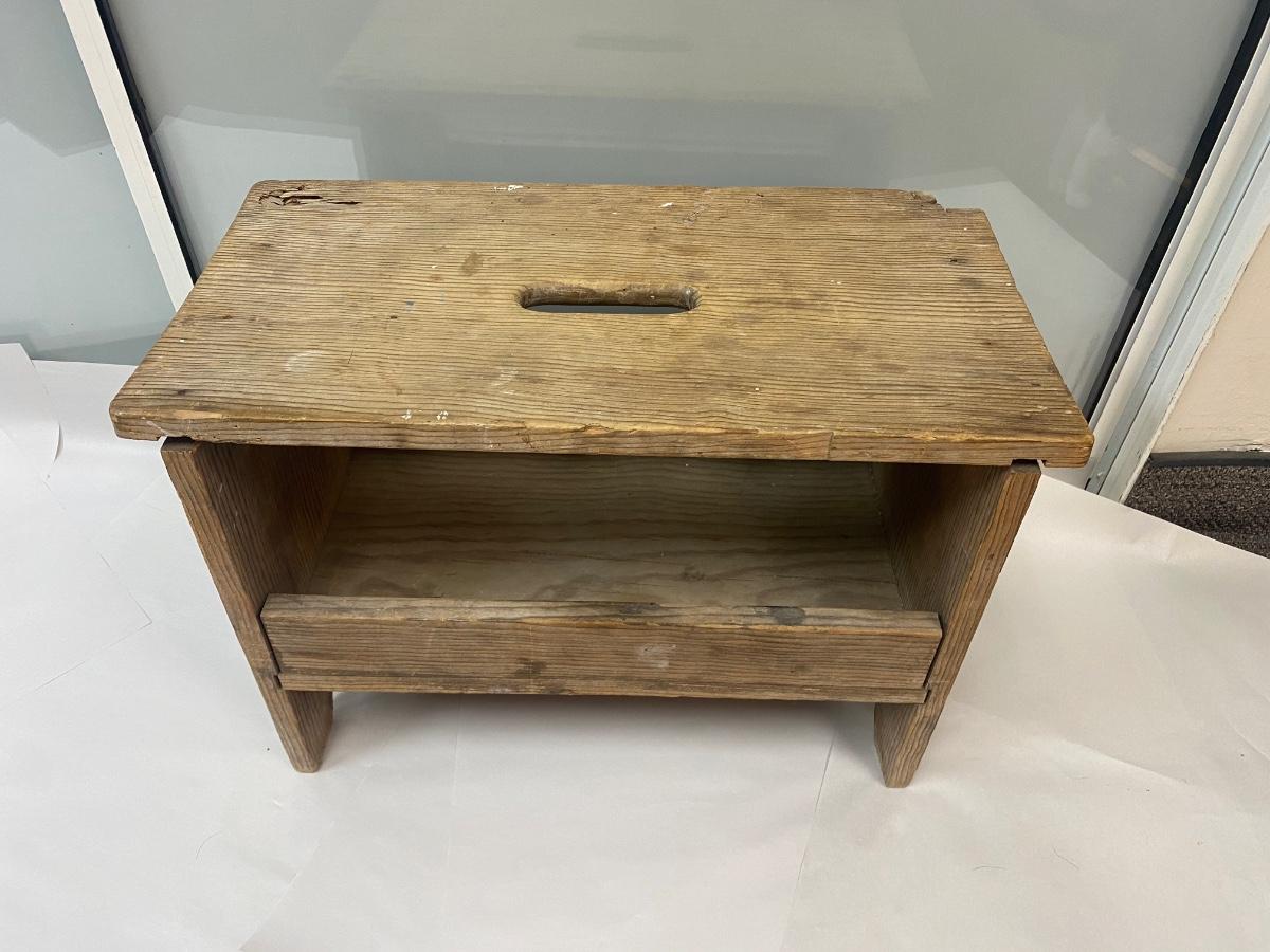 Vintage Wood Stool Bench Seat with Under Storage and Hand Hole for Carrying. In weathered condition. Sturdy but the wood has warped a little. Great rustic look.