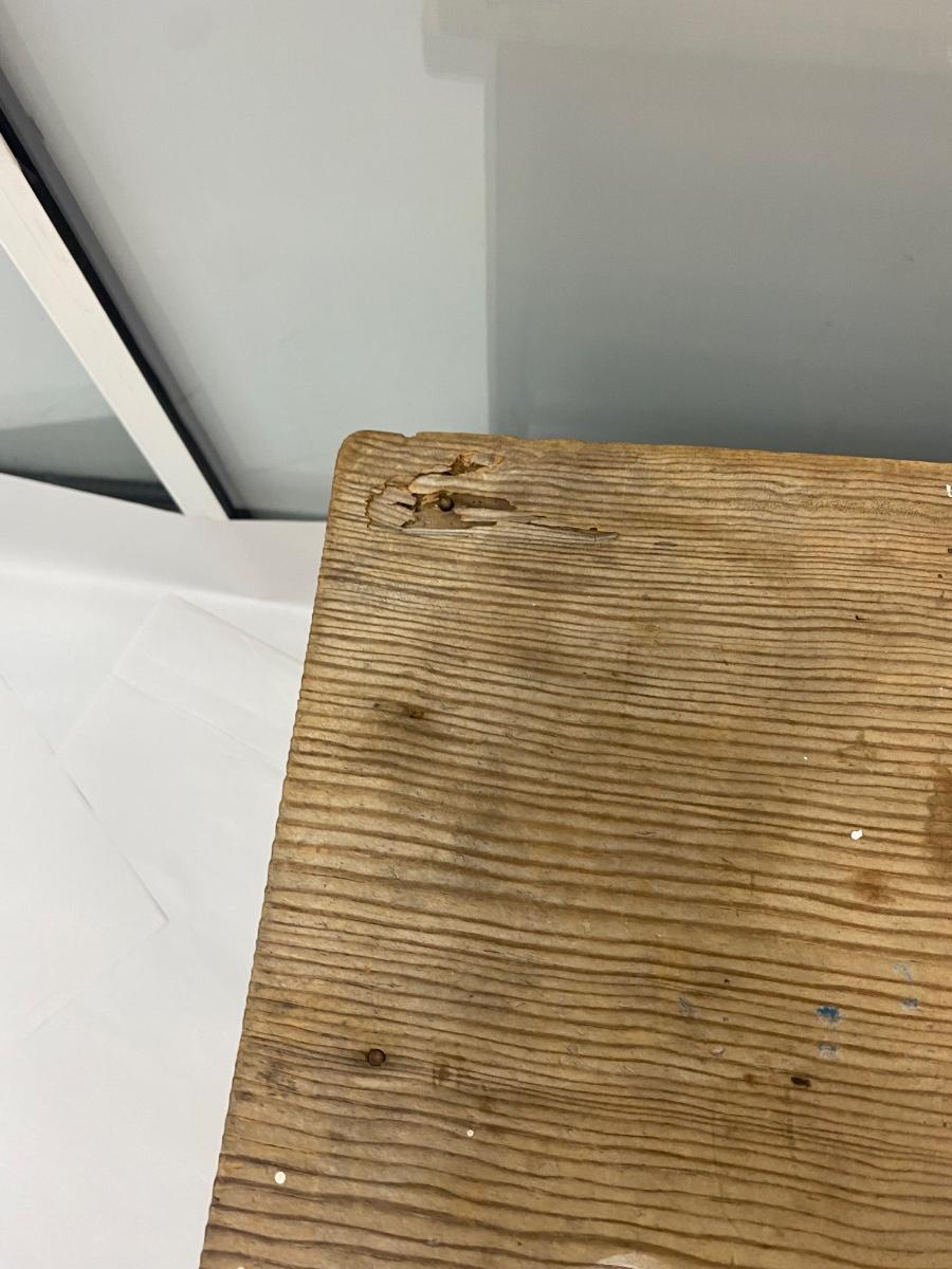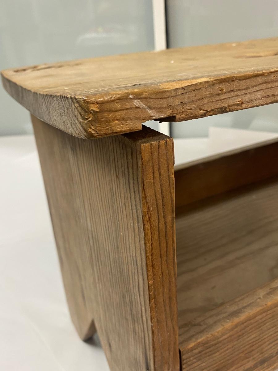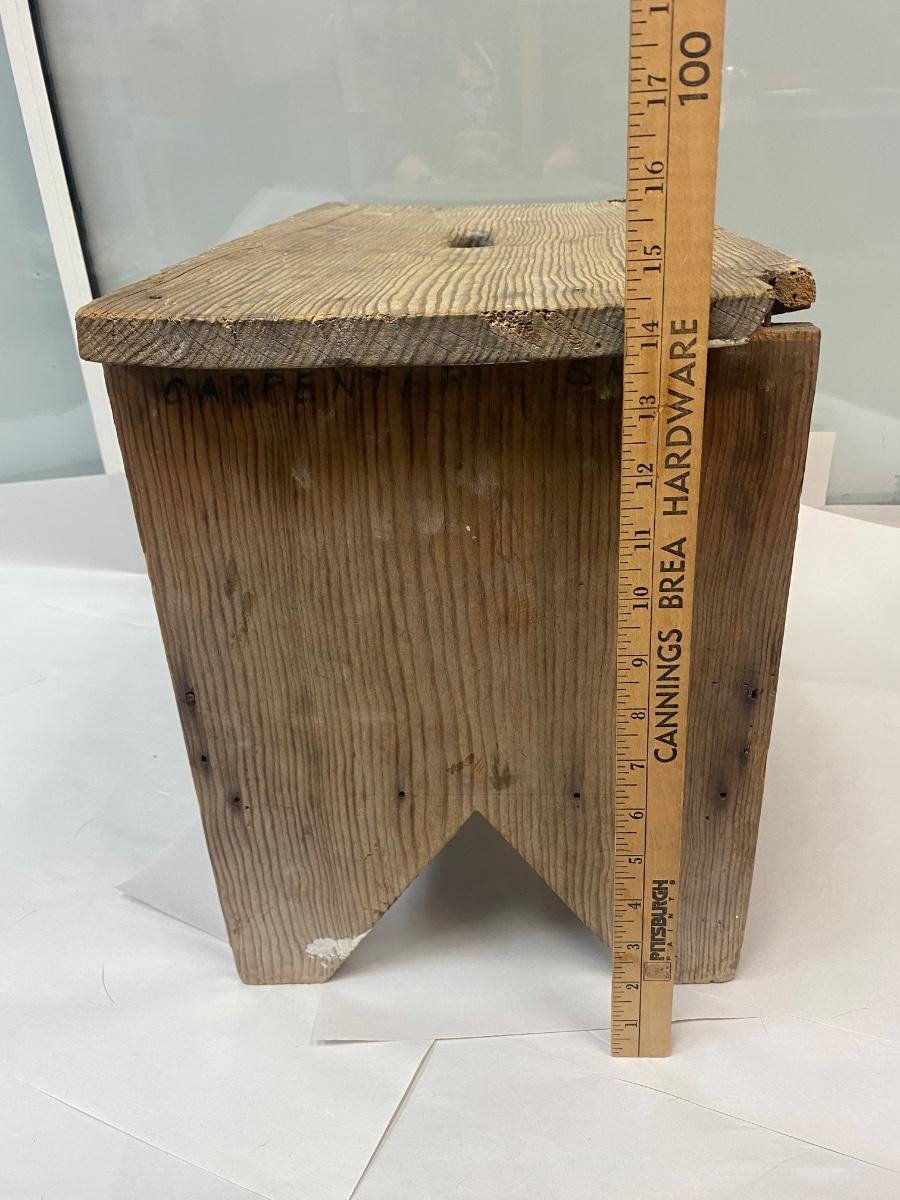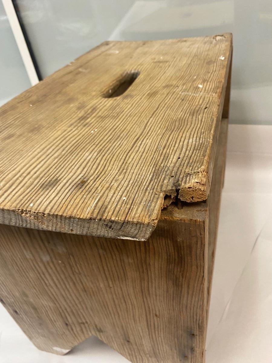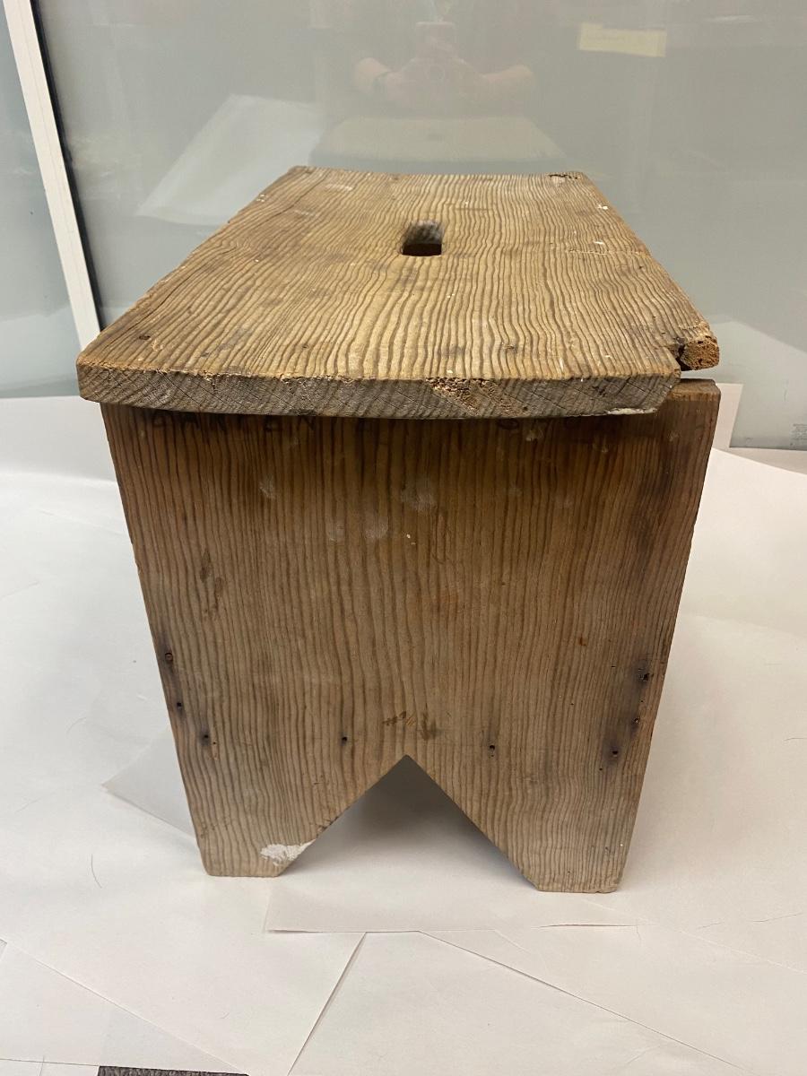 Vintage Wood Stool Bench Seat with Under Storage and Hand Hole for Carrying. In weathered condition. Sturdy but the wood has warped a little. Great rustic look.