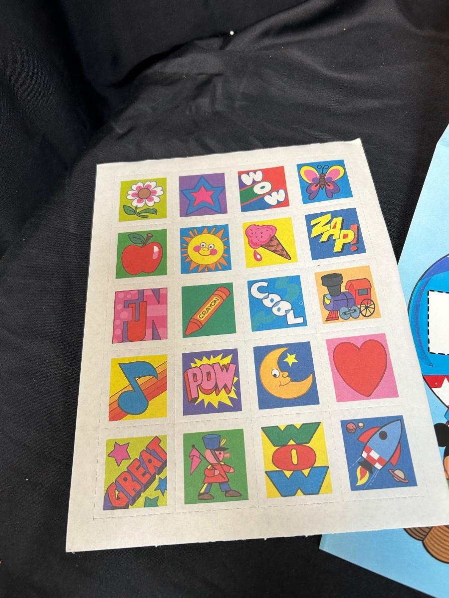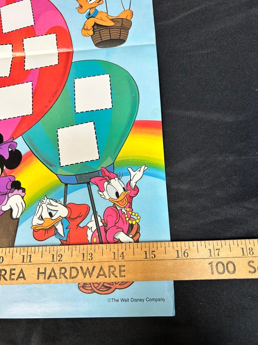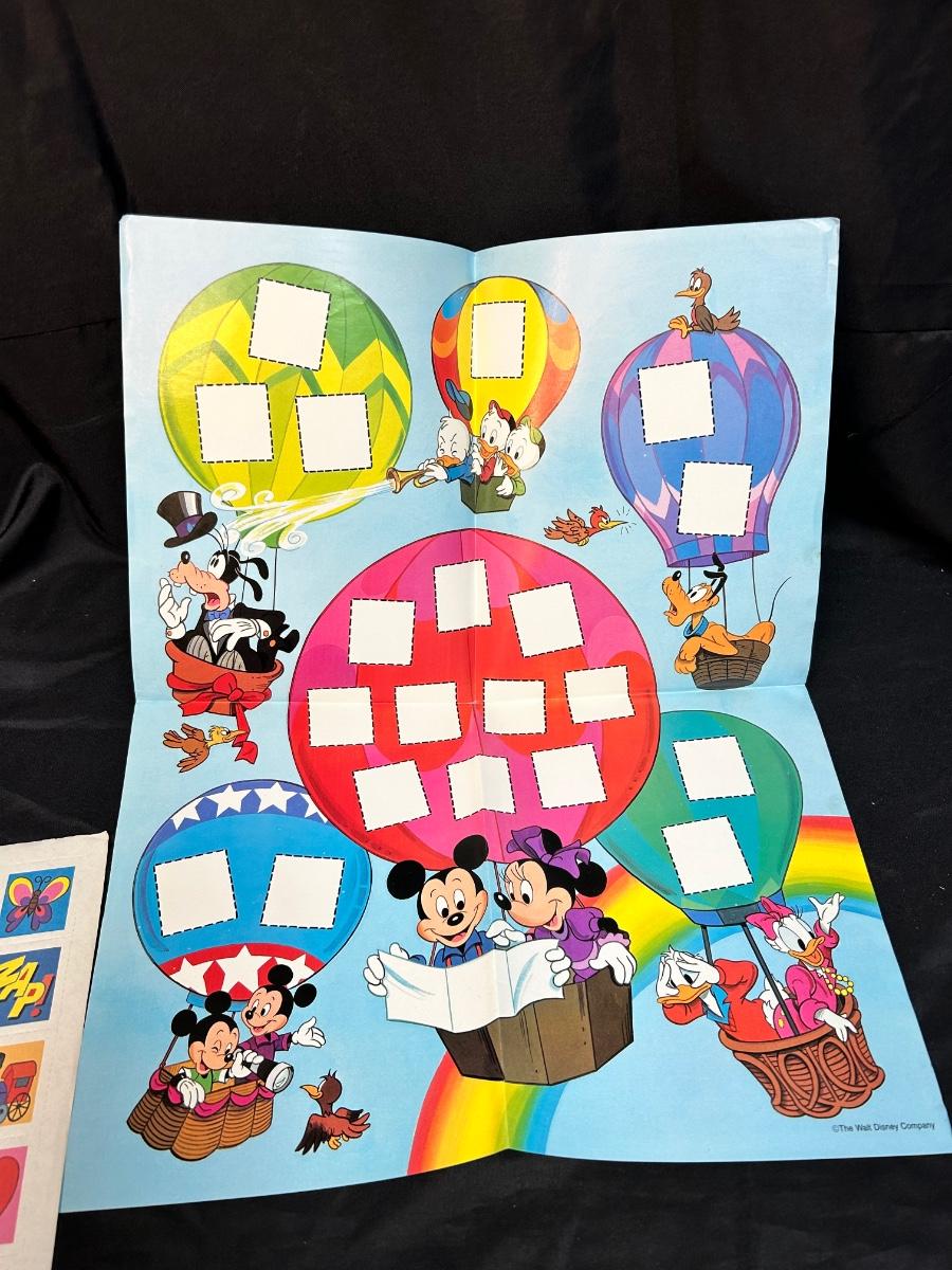 Disney Poster with Colorful Stamps Mickey Minnie Donald Goofy Pluto in Hot Air Balloons. Not sure what it came with as there isn't any name on it. Stamps are the kind with glue on back that you have to moisten.