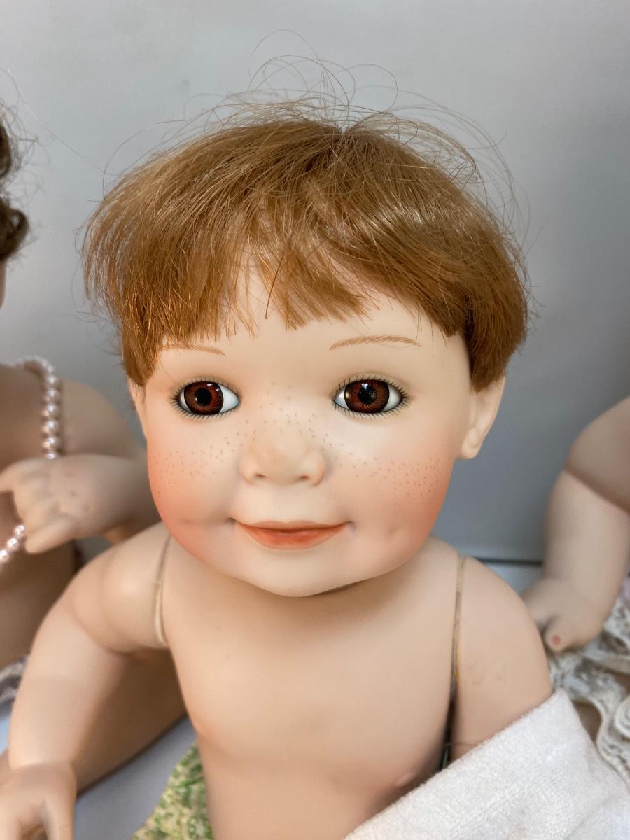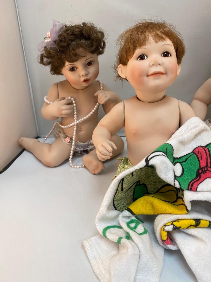 Lot of Three Cute Porcelain Bisque Jointed Body Baby Dolls Ashton Drake. In good condition. Were previously displayed and may be dusty.