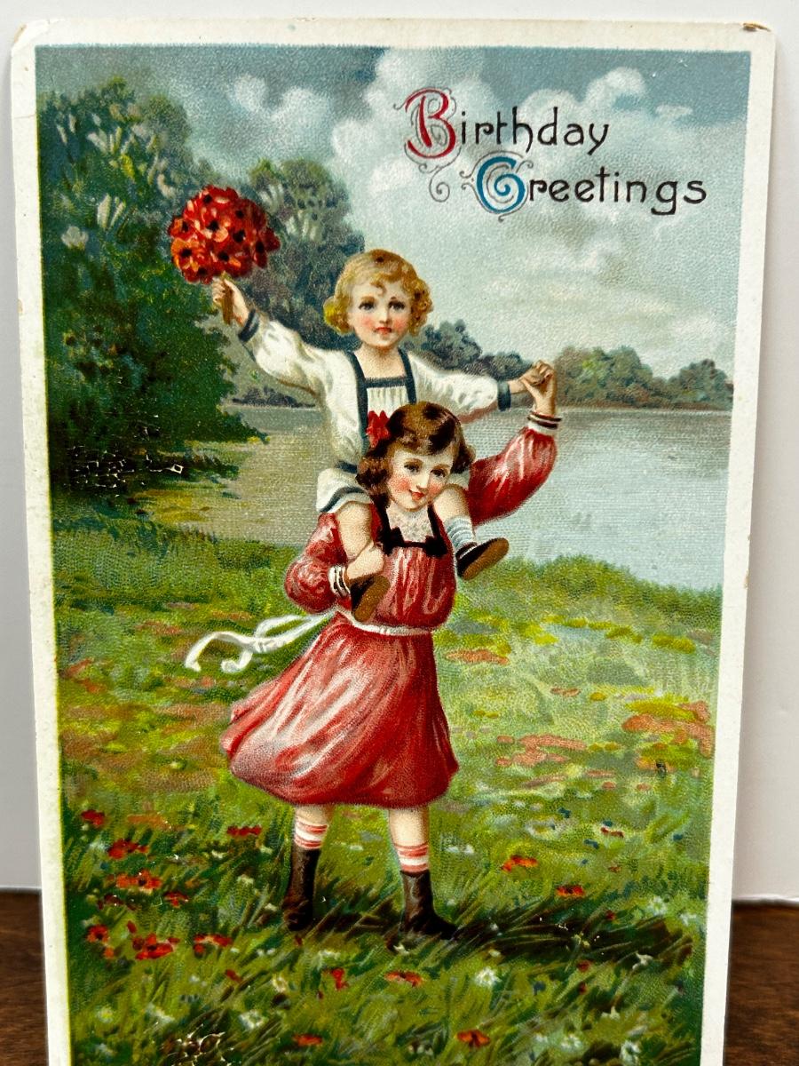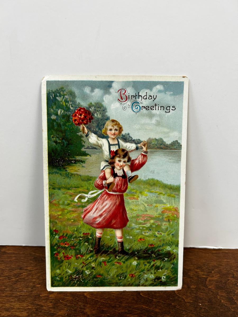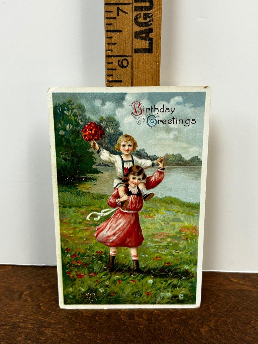 Vintage Antique Birthday Greetings Post Card Germany. No writing on back but looks like it may have been in a scrapbook at one time. In good aged condition.