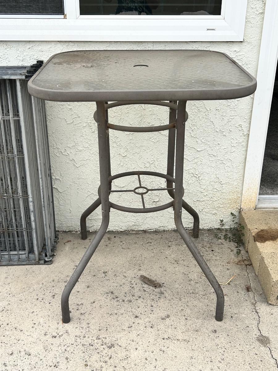 Bar Height Glass Top Square Patio Table with Umbrella Opening. In good condition, just a little dirty from outside use. Under 4' tall and 30" square top. **WEEKEND OR AFTERNOON PICK UP IN GARDEN GROVE, ARRANGE WITH JENN2**