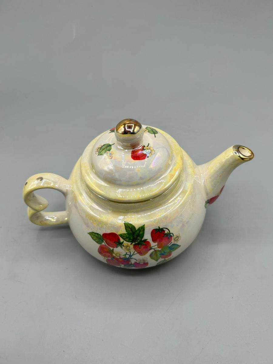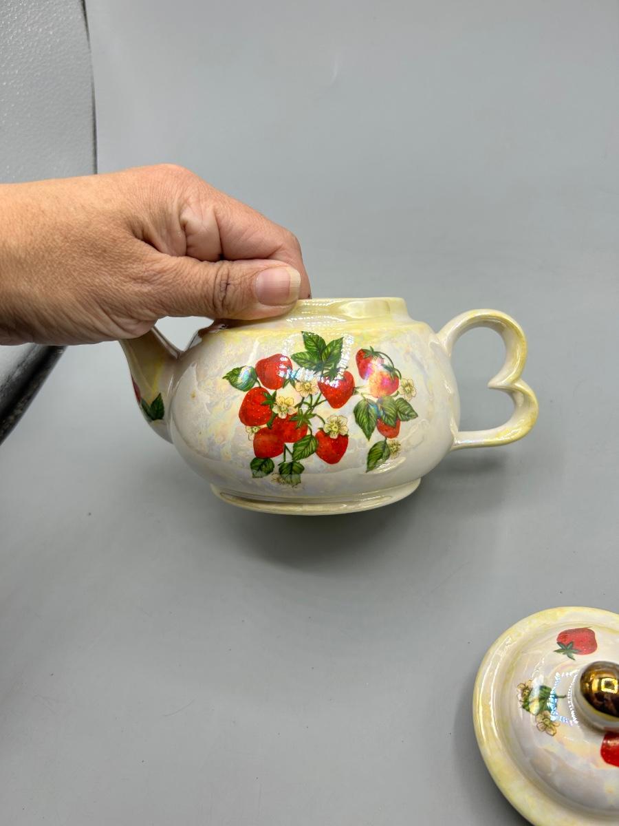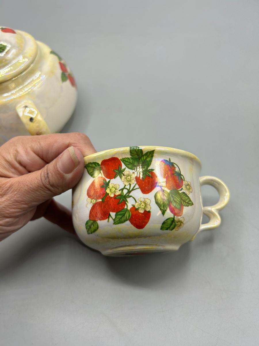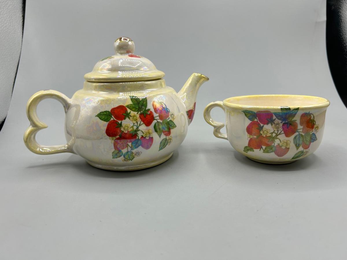 Vintage Nag Original Handmade Handpainted Iridescent Strawberry Pattern Teapot and Matching Teacup