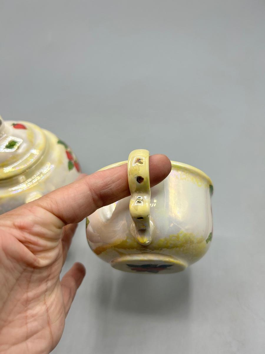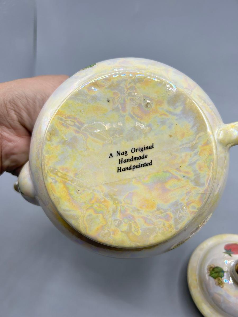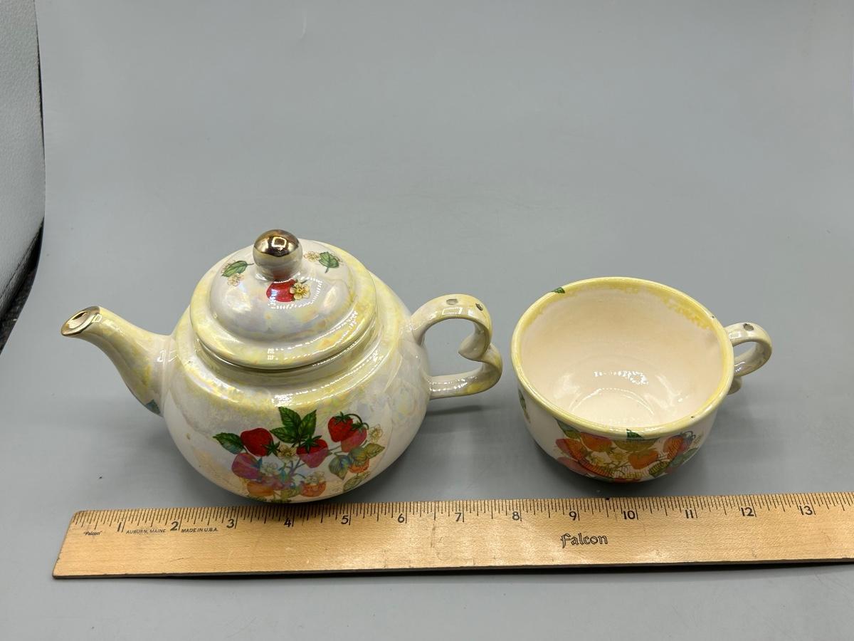 Vintage Nag Original Handmade Handpainted Iridescent Strawberry Pattern Teapot and Matching Teacup. In good vintage condition. Has a yellow trim with iridescent finish. Some light wear but no chips found.