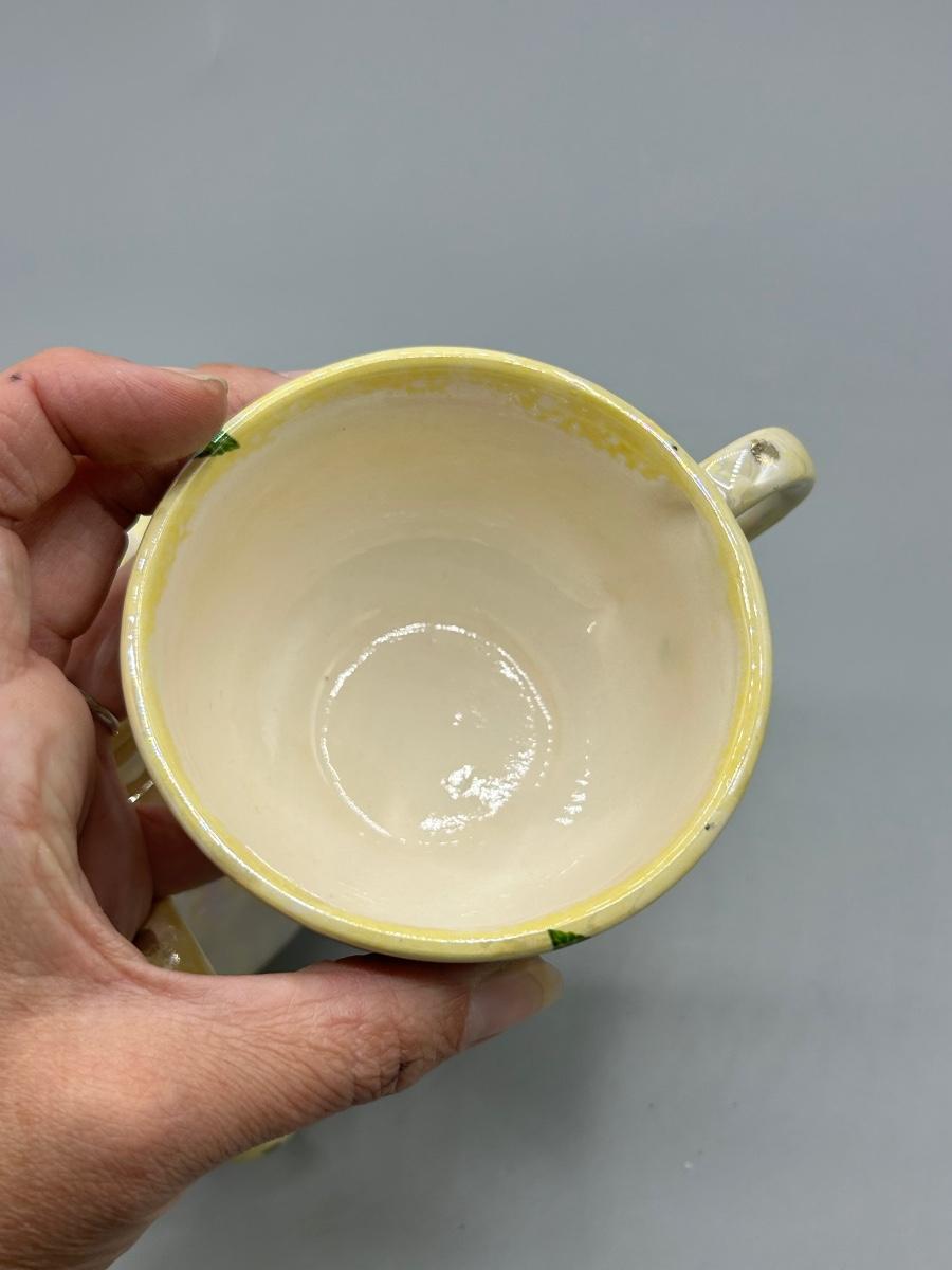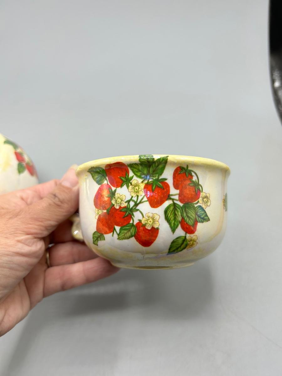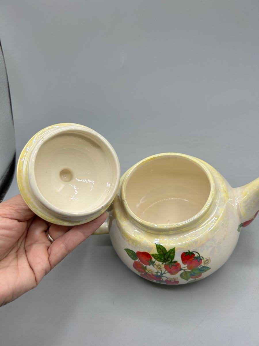 Vintage Nag Original Handmade Handpainted Iridescent Strawberry Pattern Teapot and Matching Teacup. In good vintage condition. Has a yellow trim with iridescent finish. Some light wear but no chips found.