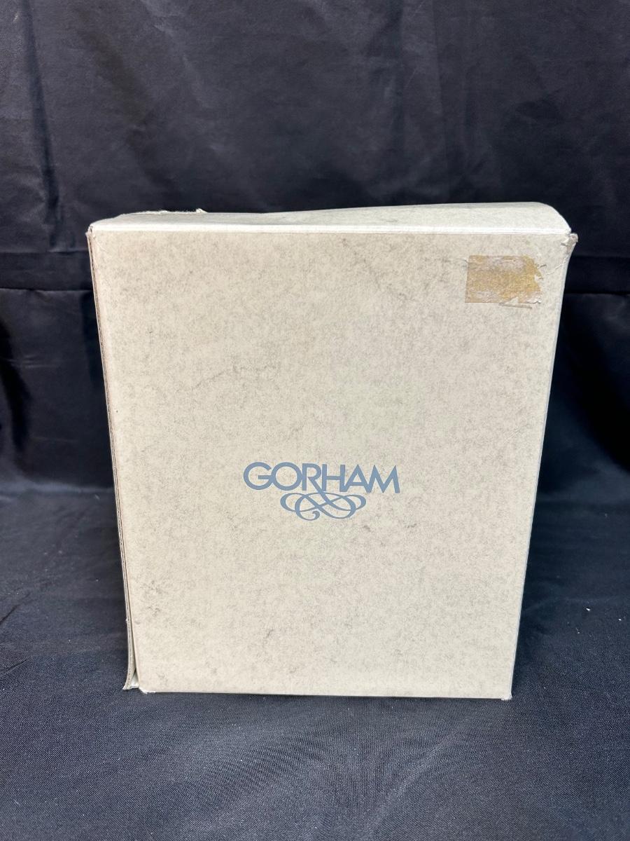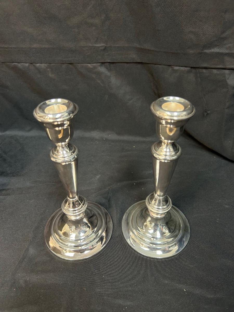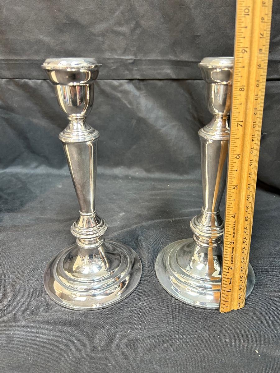 Pair of Heavy Gorham Silver Plate Candlestick Holders with Original Box. In good condition. The felt bottom needs to be glued back into place but no damage or dents. About 9" size.
