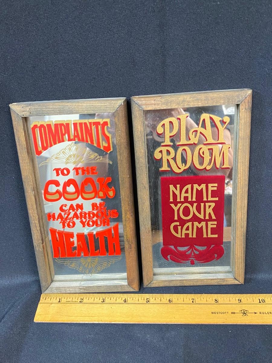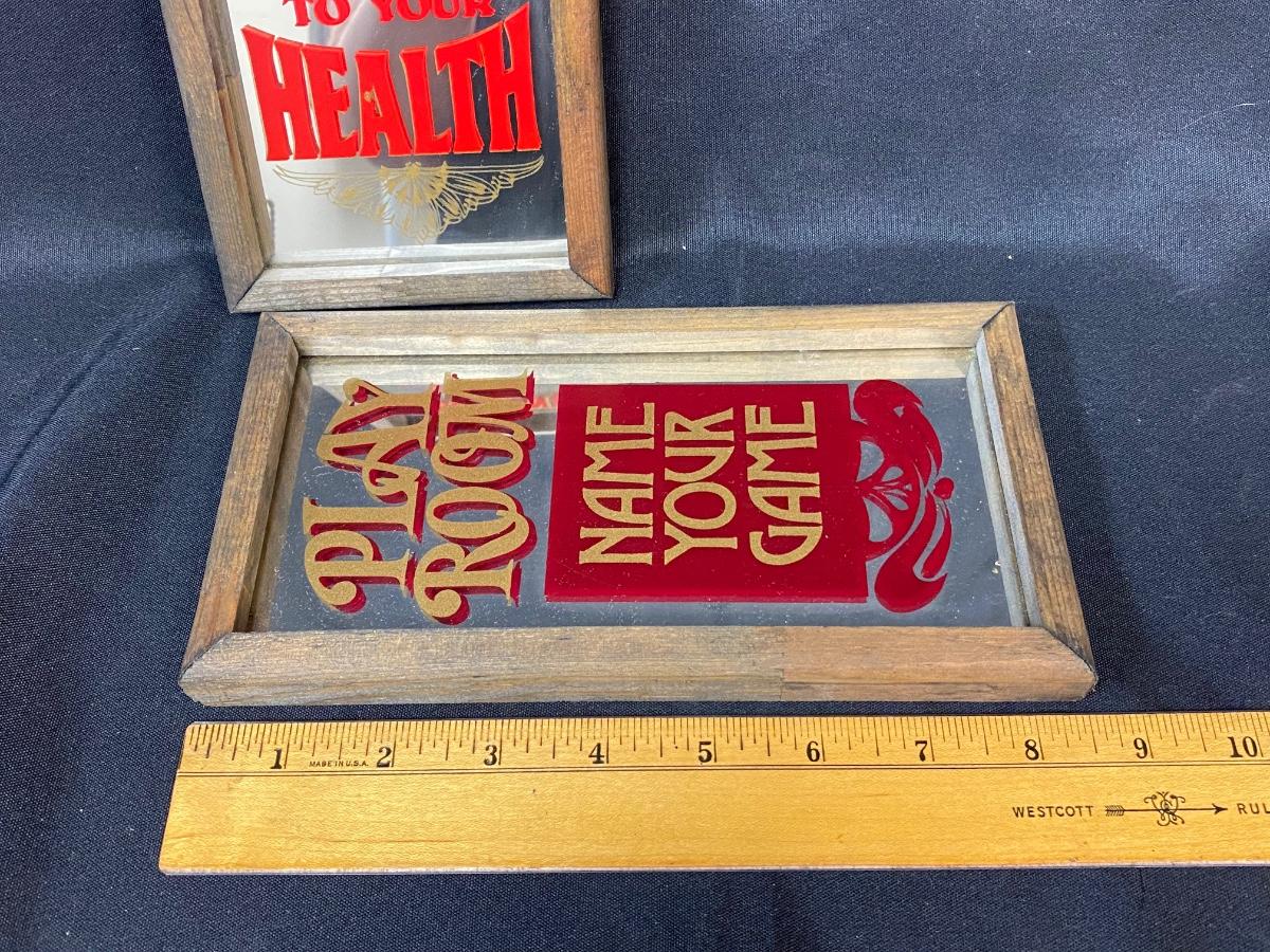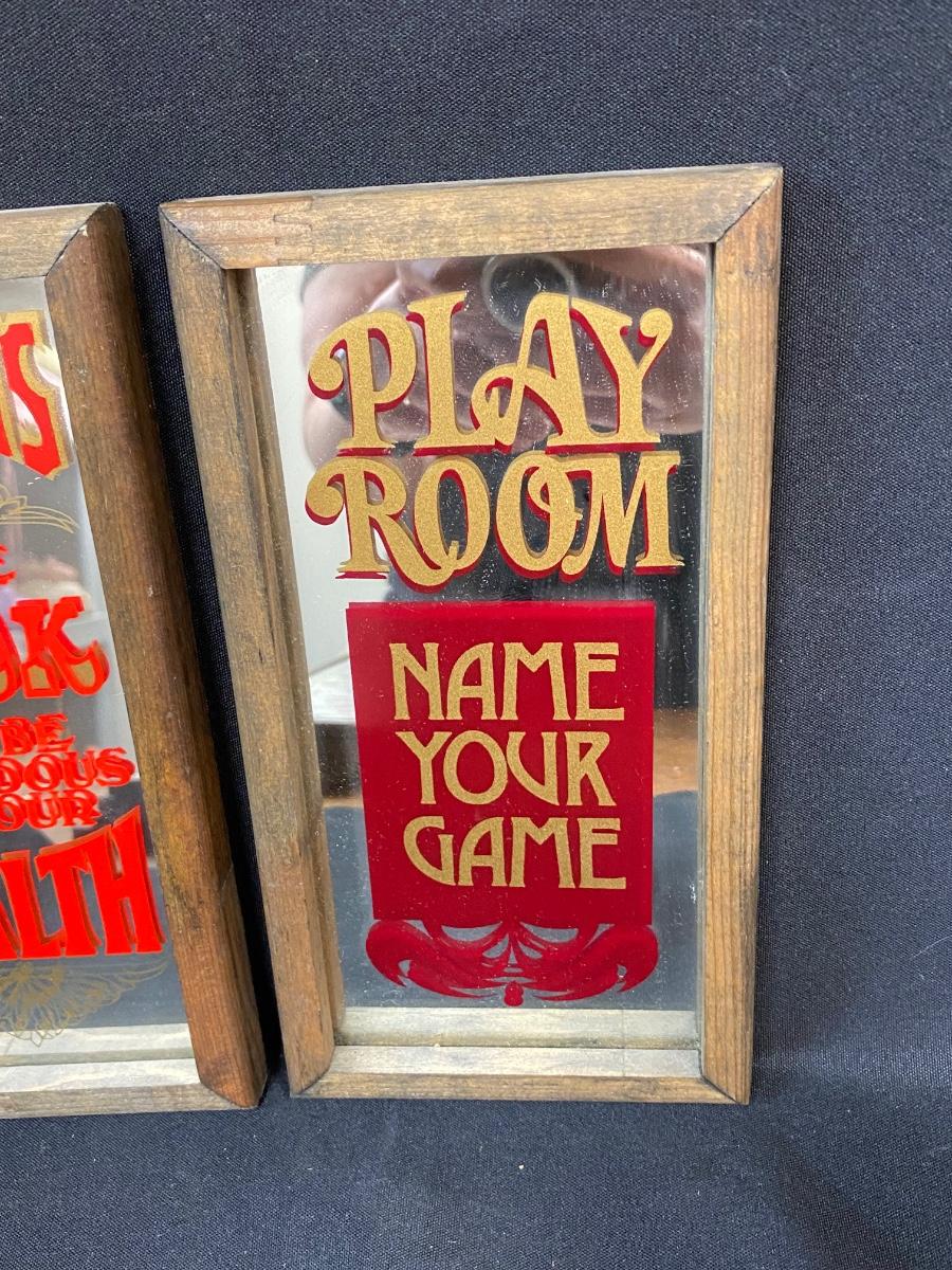 Pair of Novelty Mirrored Bar Room Pool Hall Vintage American Wall Signs. In good condition, just dusty. About 8.5"x4" size.