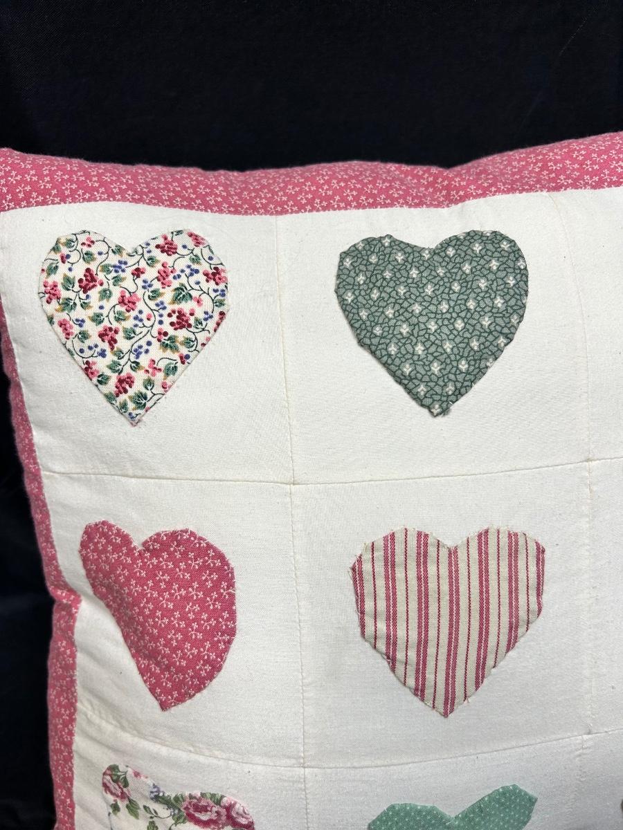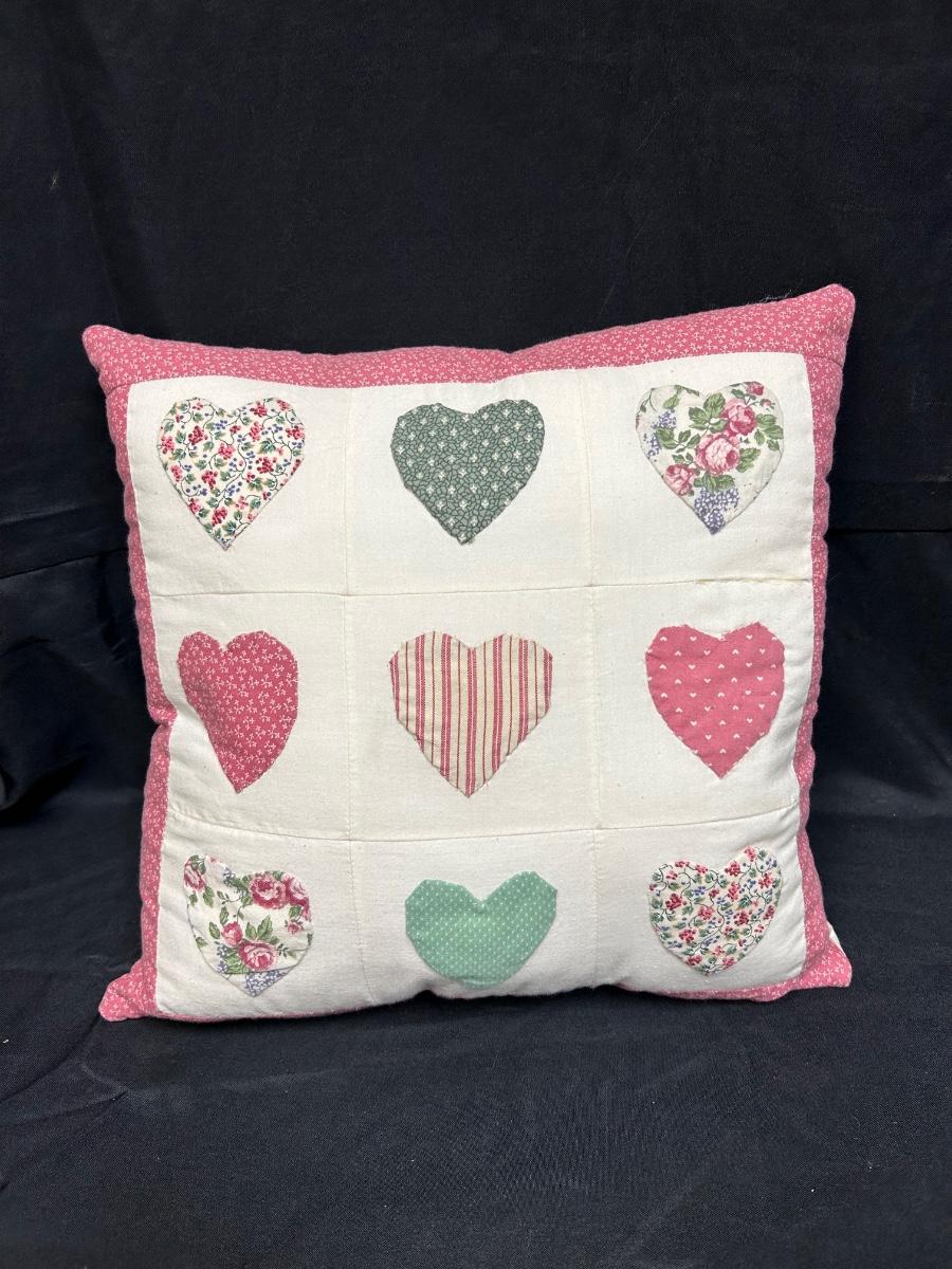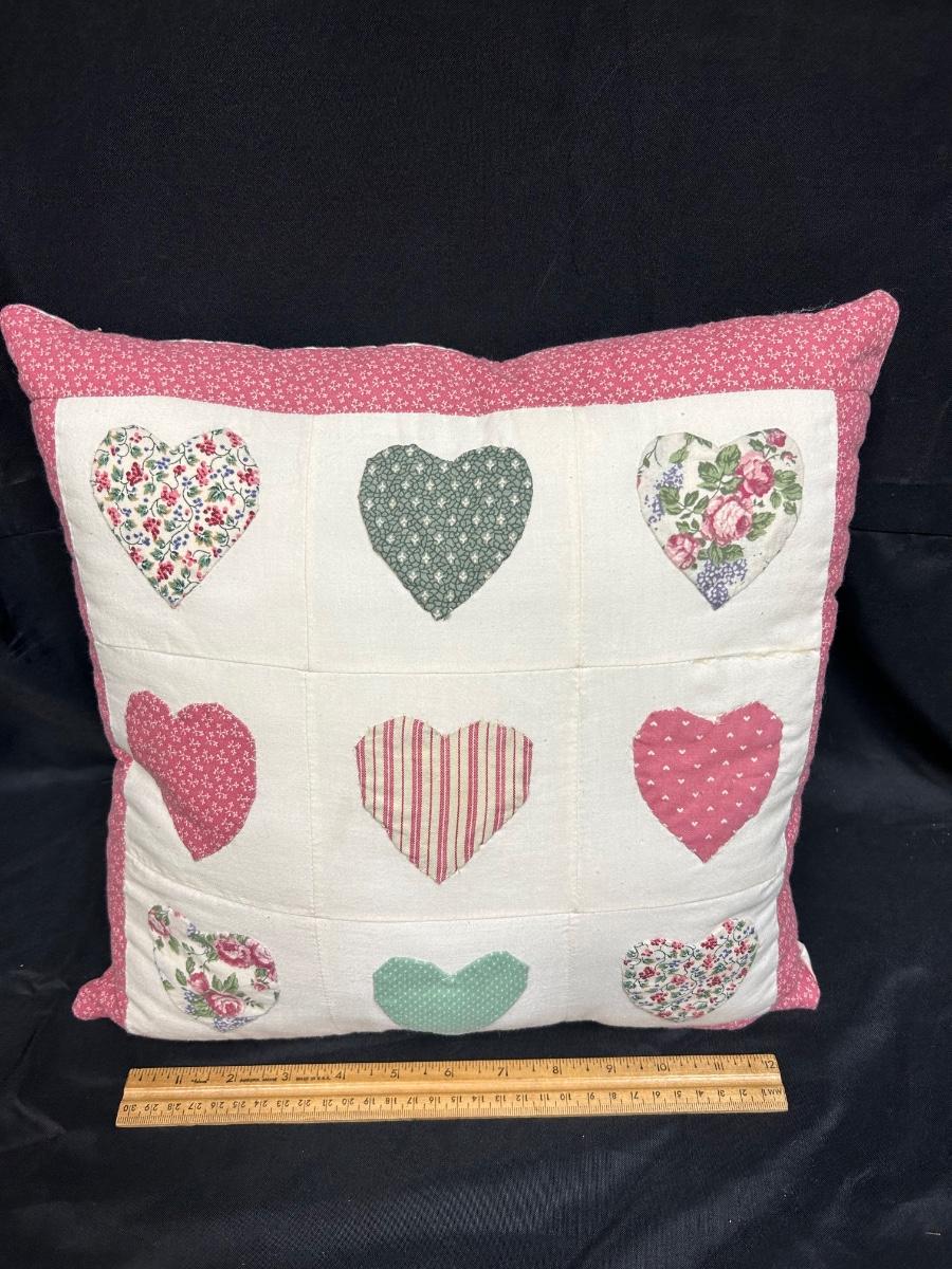 Shabby Chic Cottagecore Heart Patchwork Applique Throw Accent Pillow. In good condition. Hearts are individually sewn on. About 14" size.
