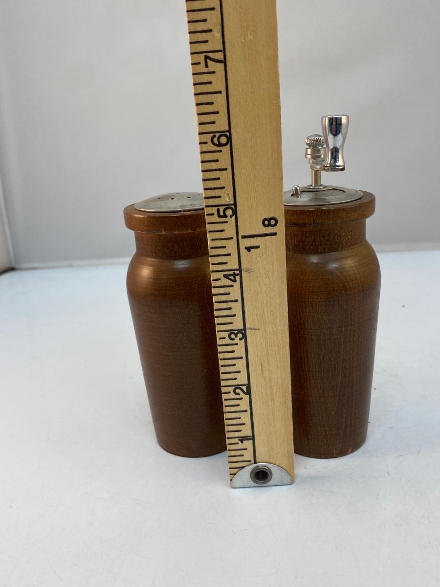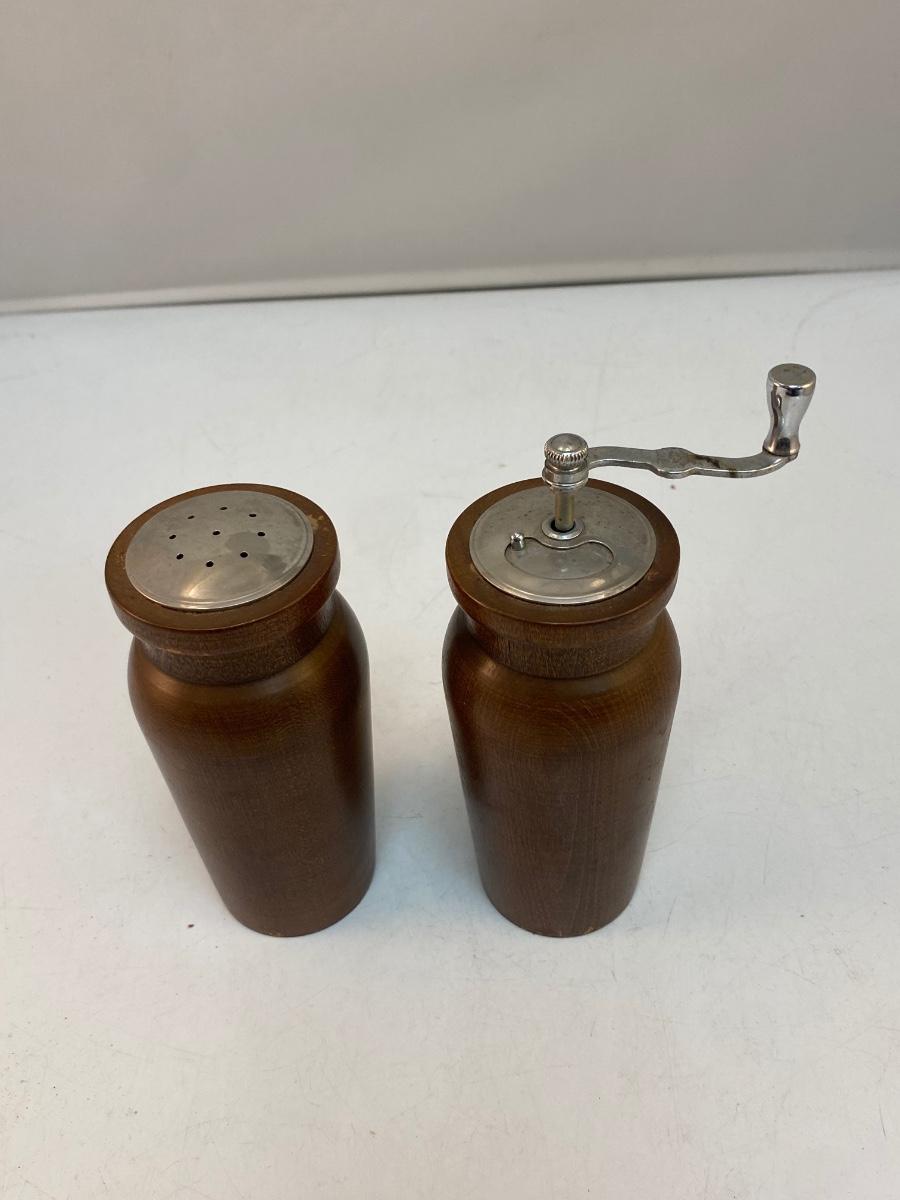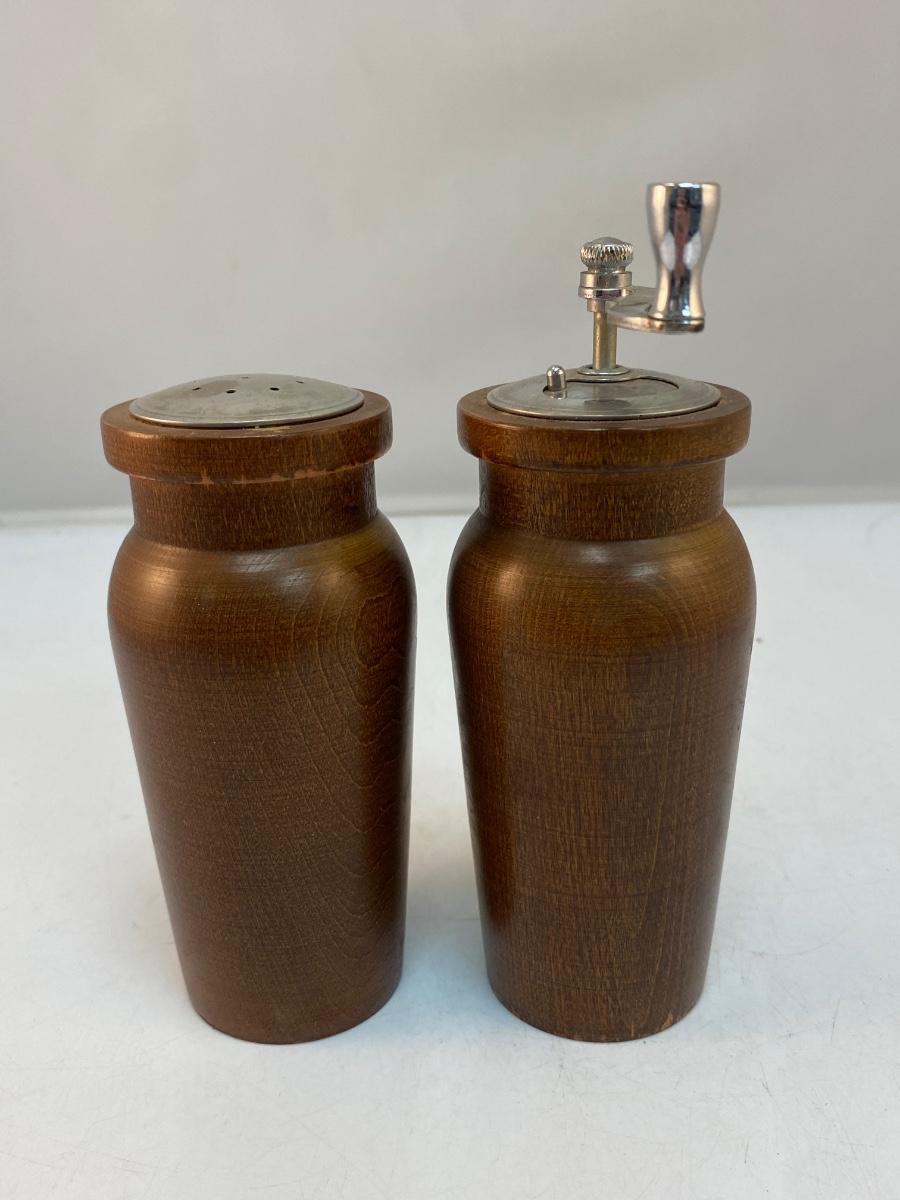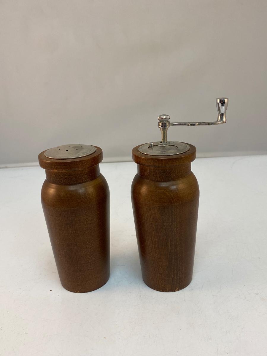 Vintage Retro Wood Salt & Pepper Grinder Shaker Set. In good used condition. About 5" size.