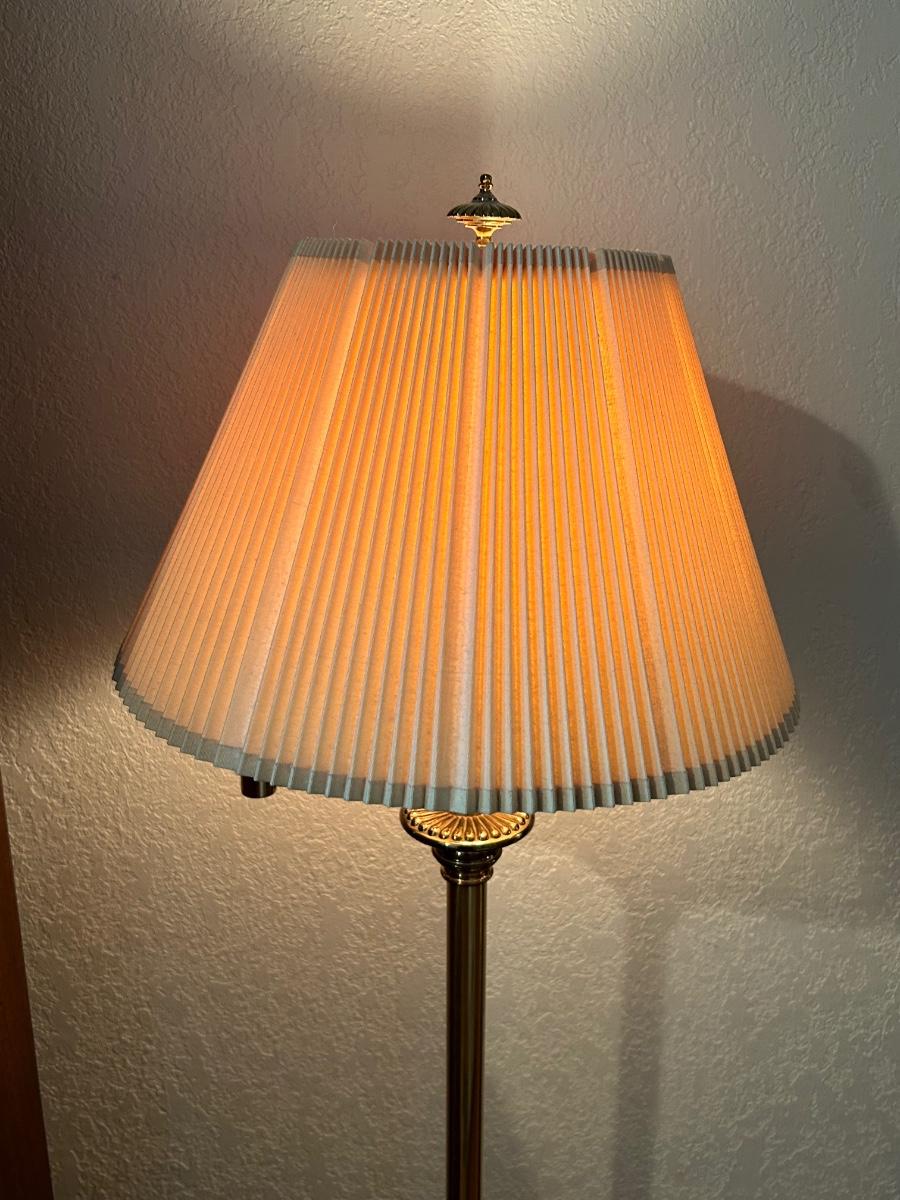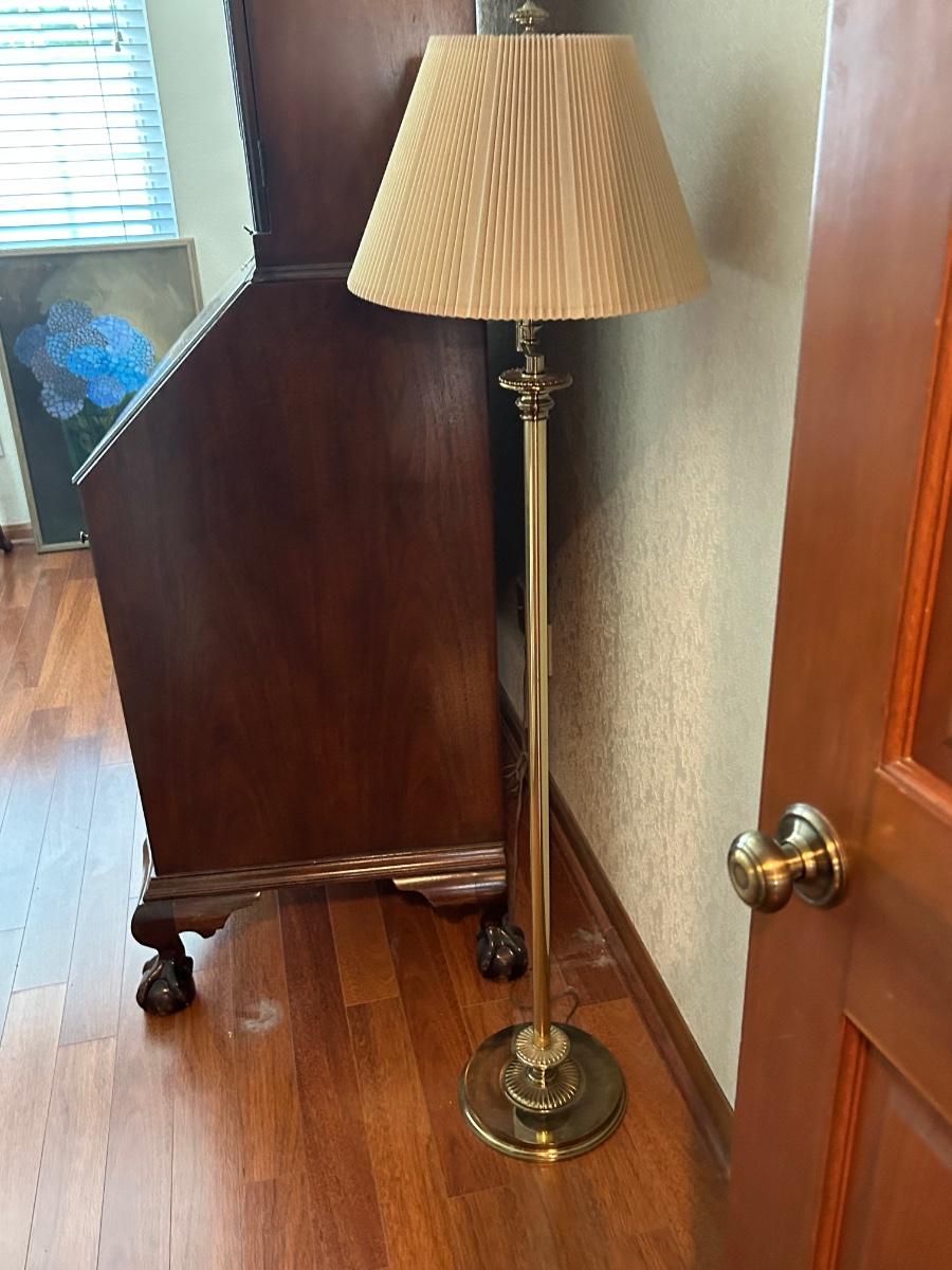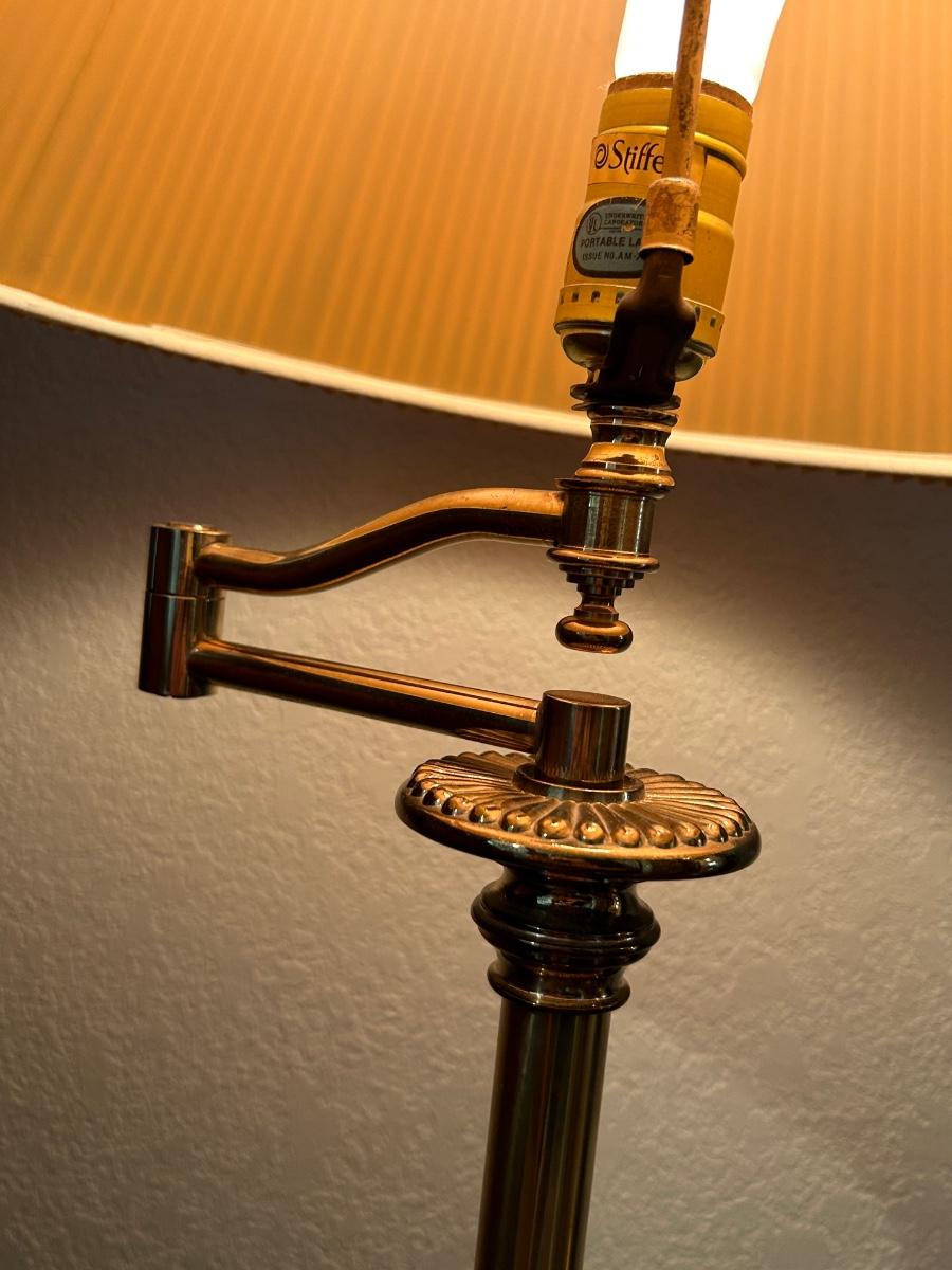 Brass Adjustable Swing Arm Floor Lamp. About 5' tall, works.