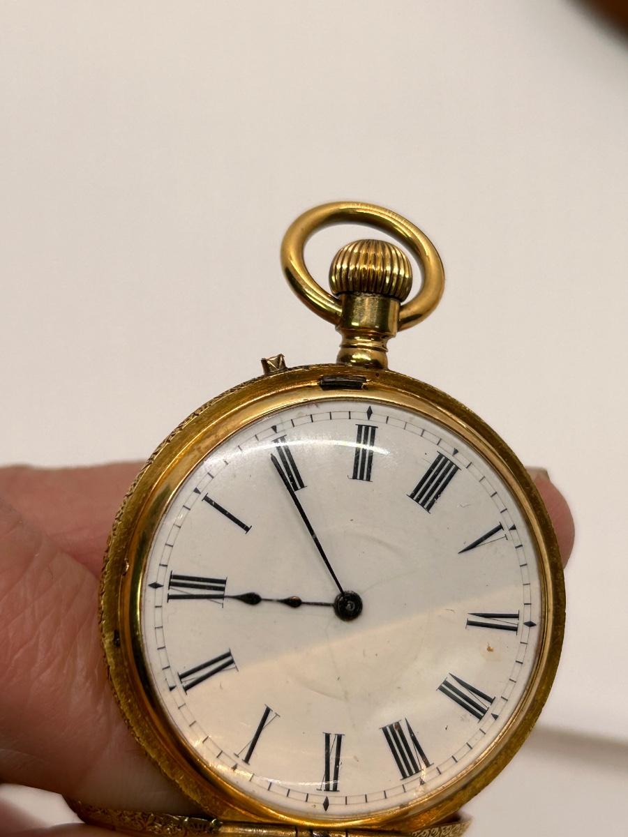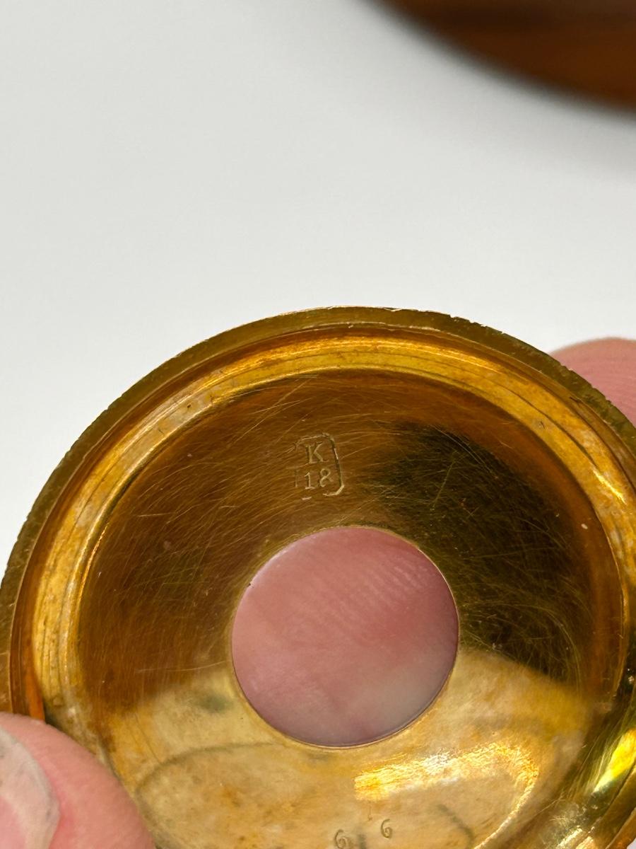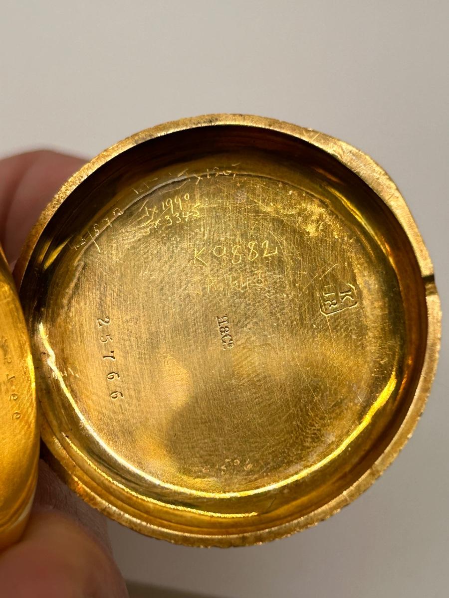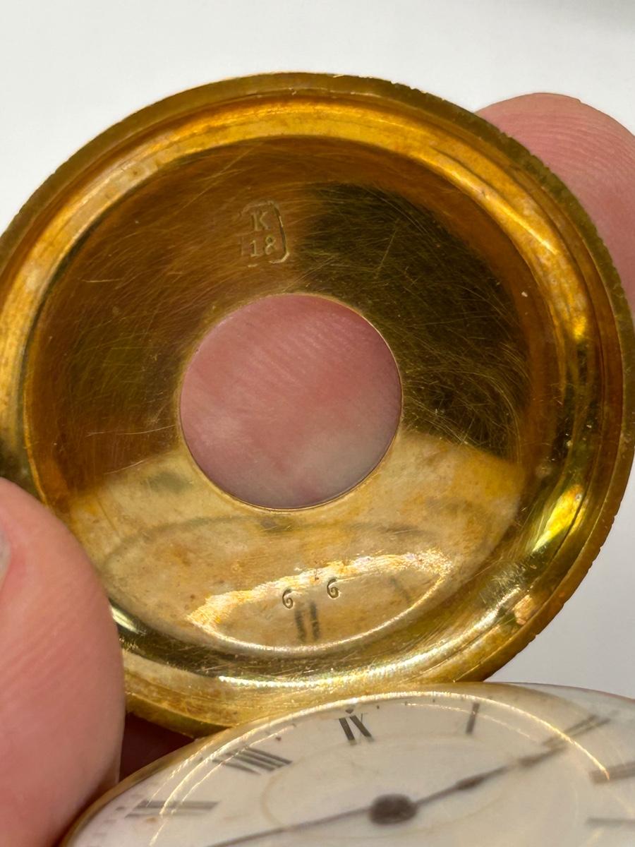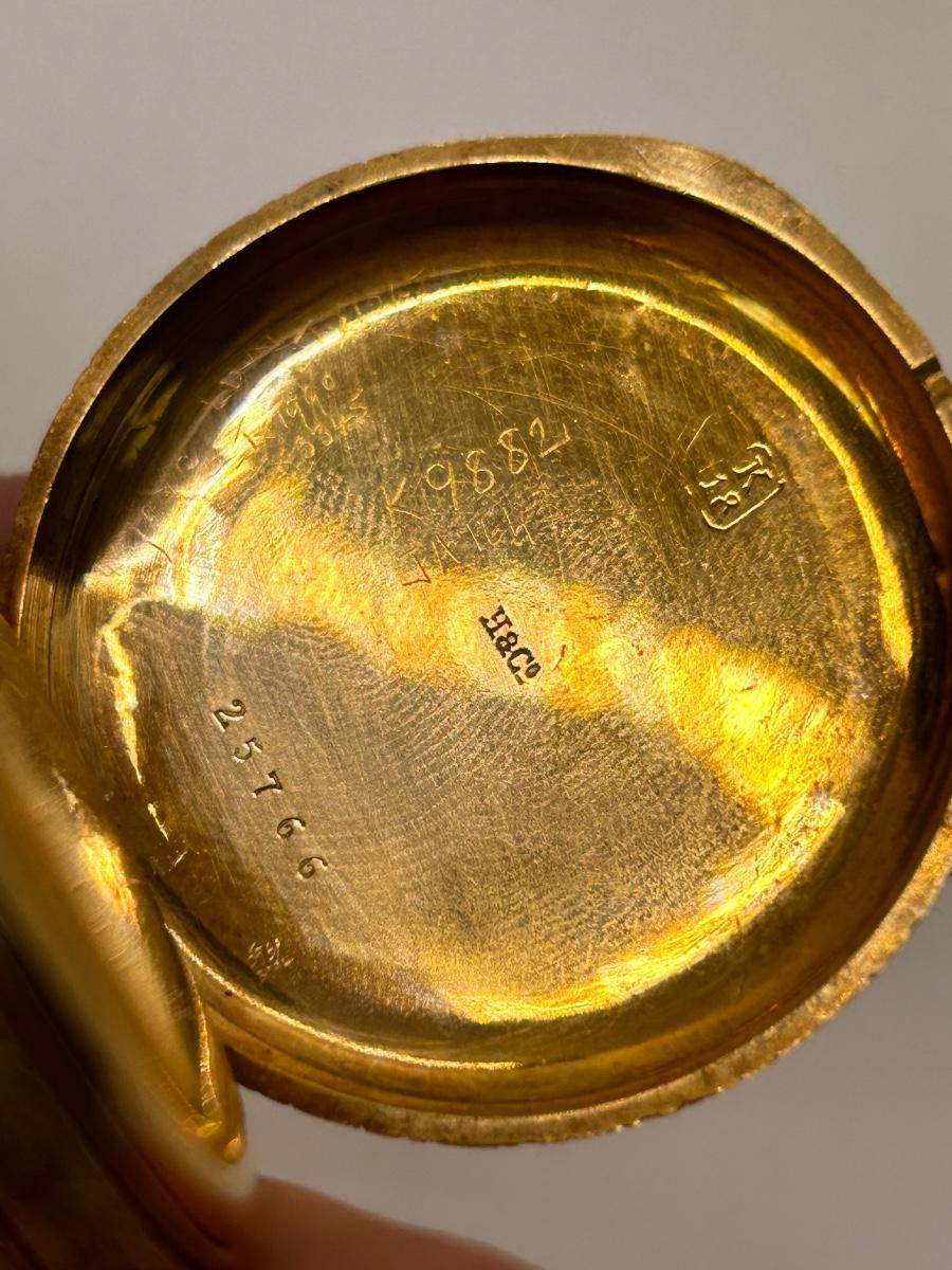 Vintage 18k Yellow Gold Small Pocket Watch with Display Holder H & Co Numbered Works. Beautifully crafted hunter's watch. Roman numerals on outside of case for quick glance but case does open. Works, not sure how well it keeps time, small button near top allows for the hands to be moved to adjust the time. Back cover was able to be opened. There are serial numbers etched along with other numbers. H&Co stamped in center with K18 at top. Also etched is a jeweler's name that examined the watch I guess after it was made. No branding or words on watch face. Small sized about 2" total. Comes with glass dome display case.