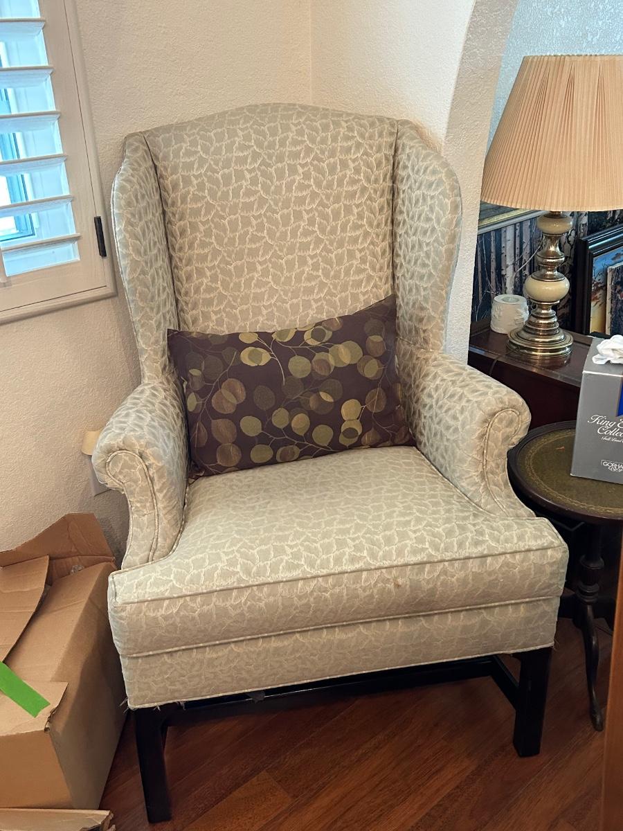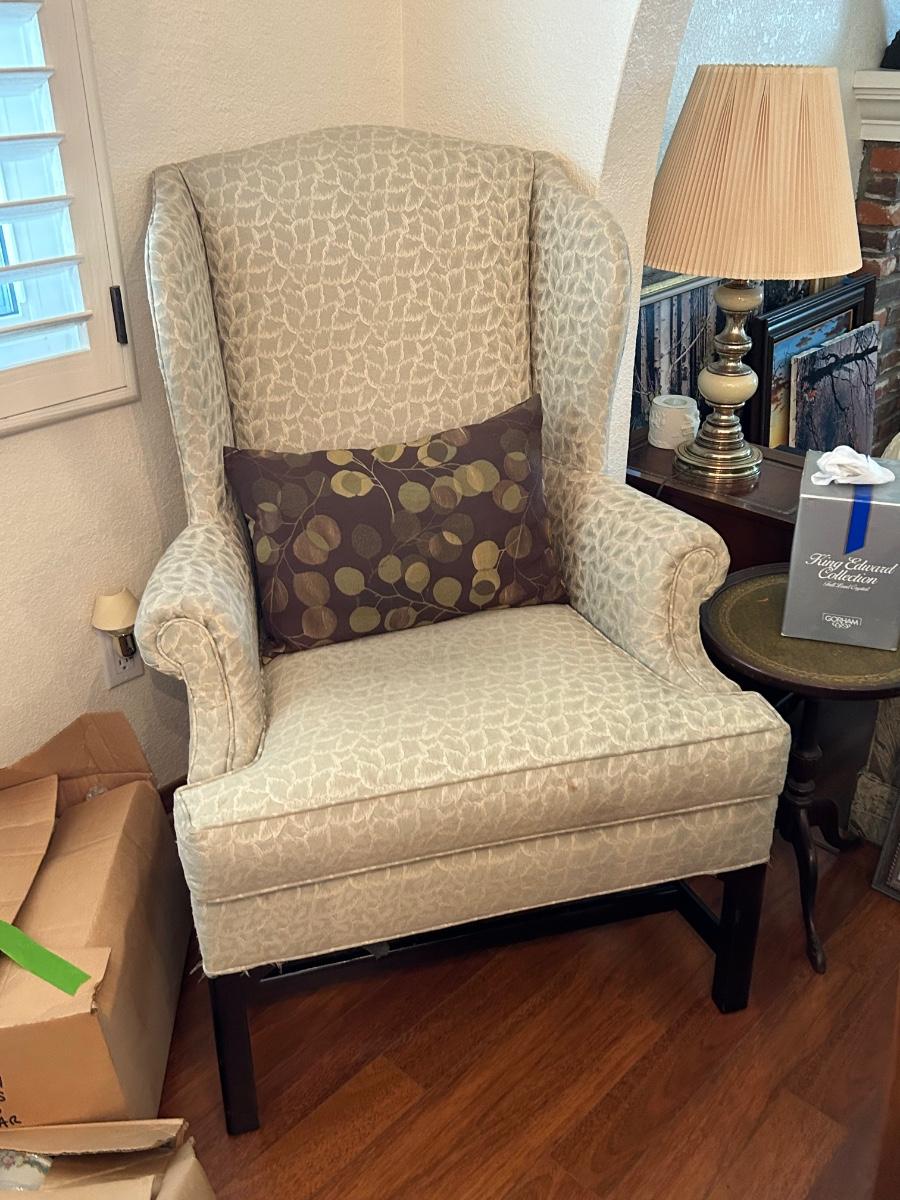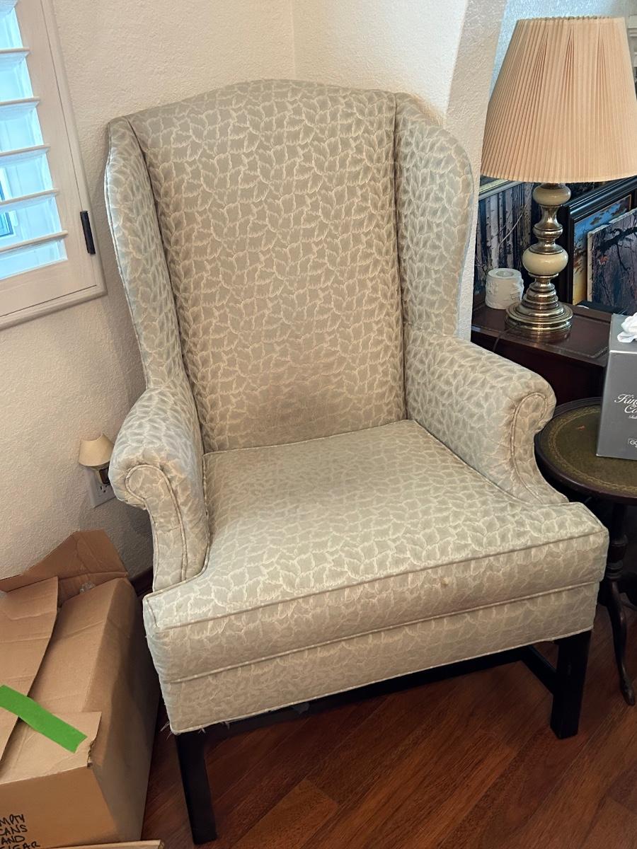 Light Colored Wing Back Fireplace Side Chair. In previously used condition, some discoloration from use.