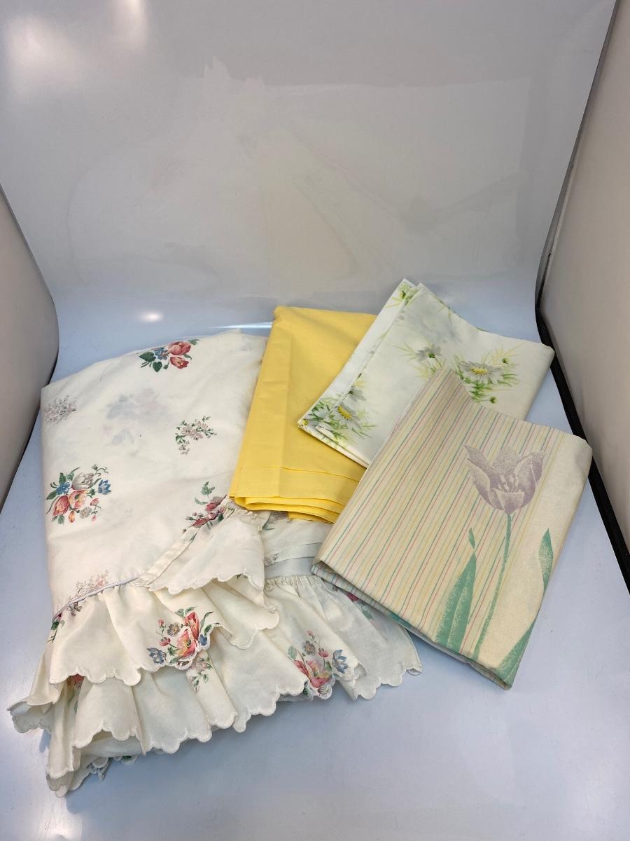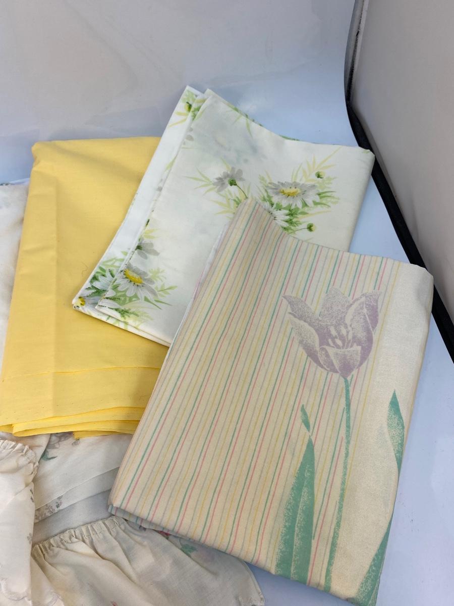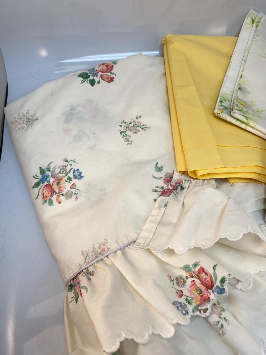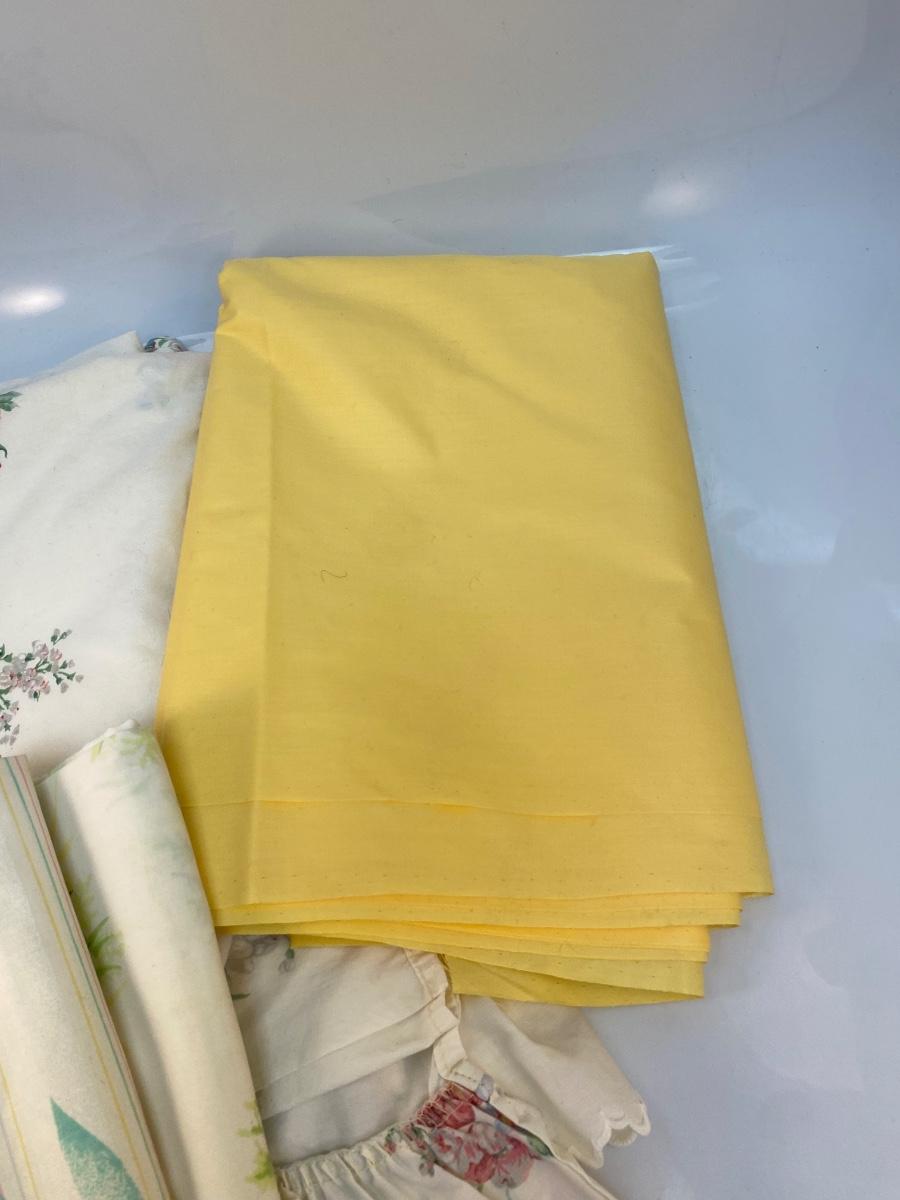 Vintage Queen Size Ruffled Sheet Pillowcases and Yellow Fabric. Some light discolor from age. The yellow fabric is good size, feels like cotton or cotton blend.