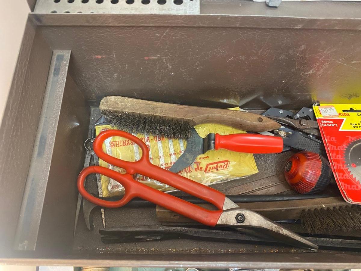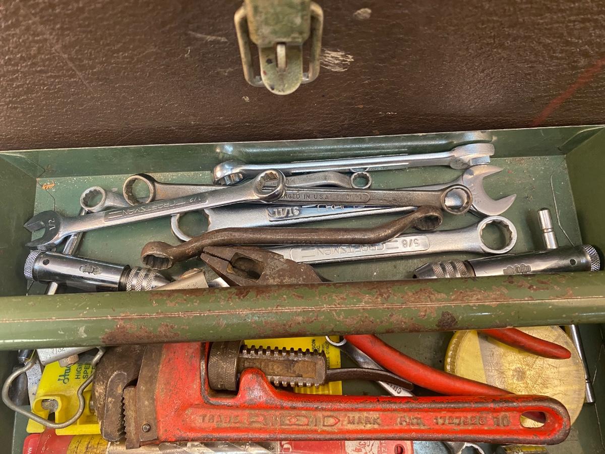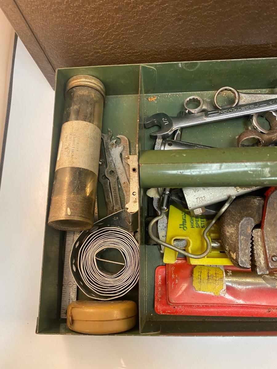 Vintage Kennedy Metal Toolbox with Miscellaneous Hand Tools Included. In good vintage condition. Various hand tools included some are Craftsman brand.