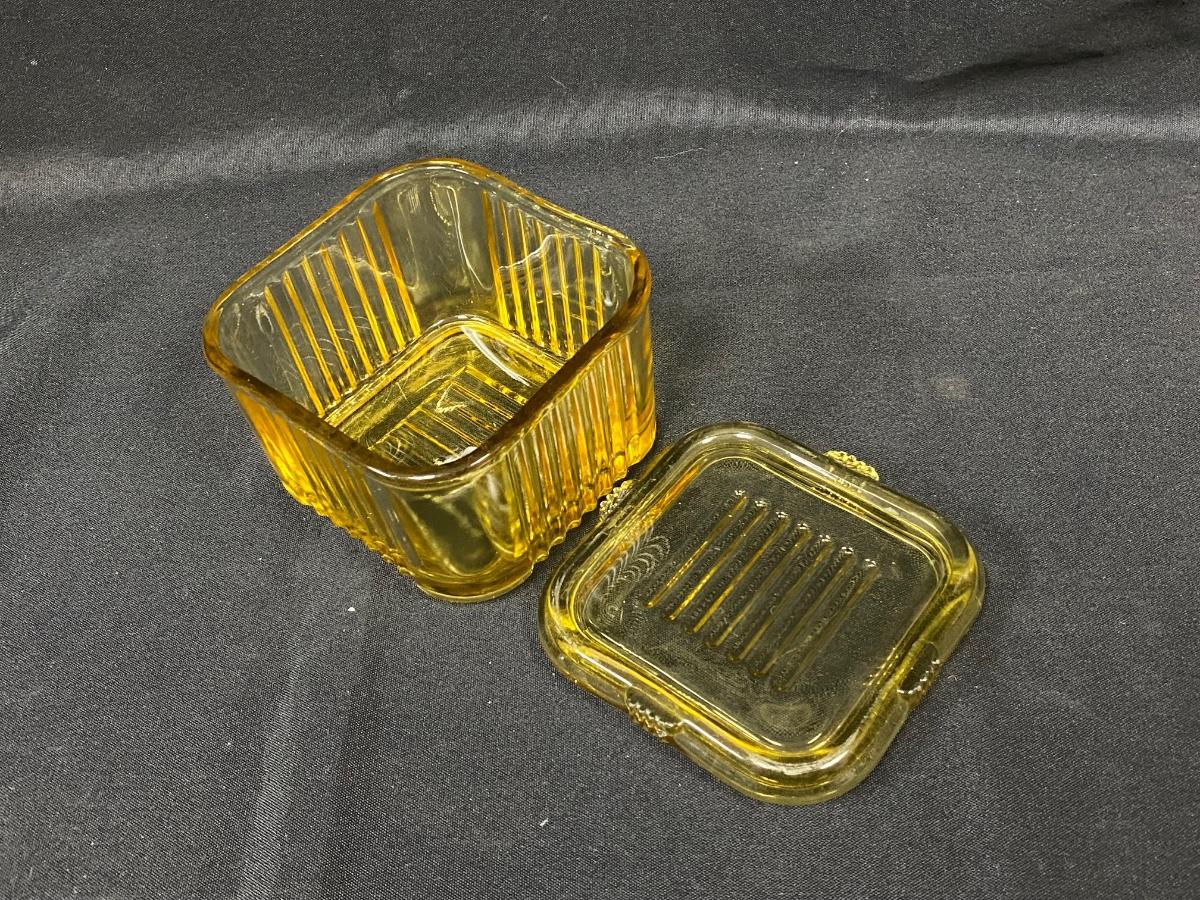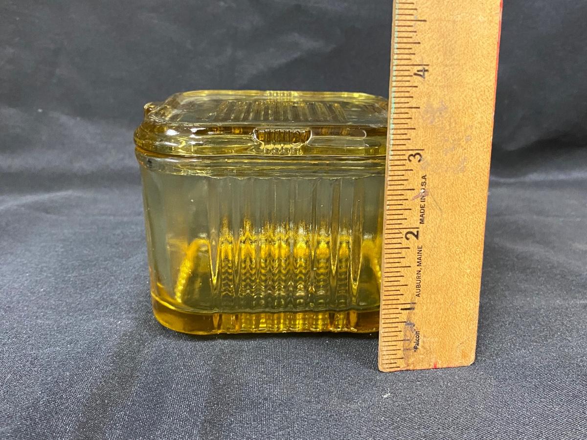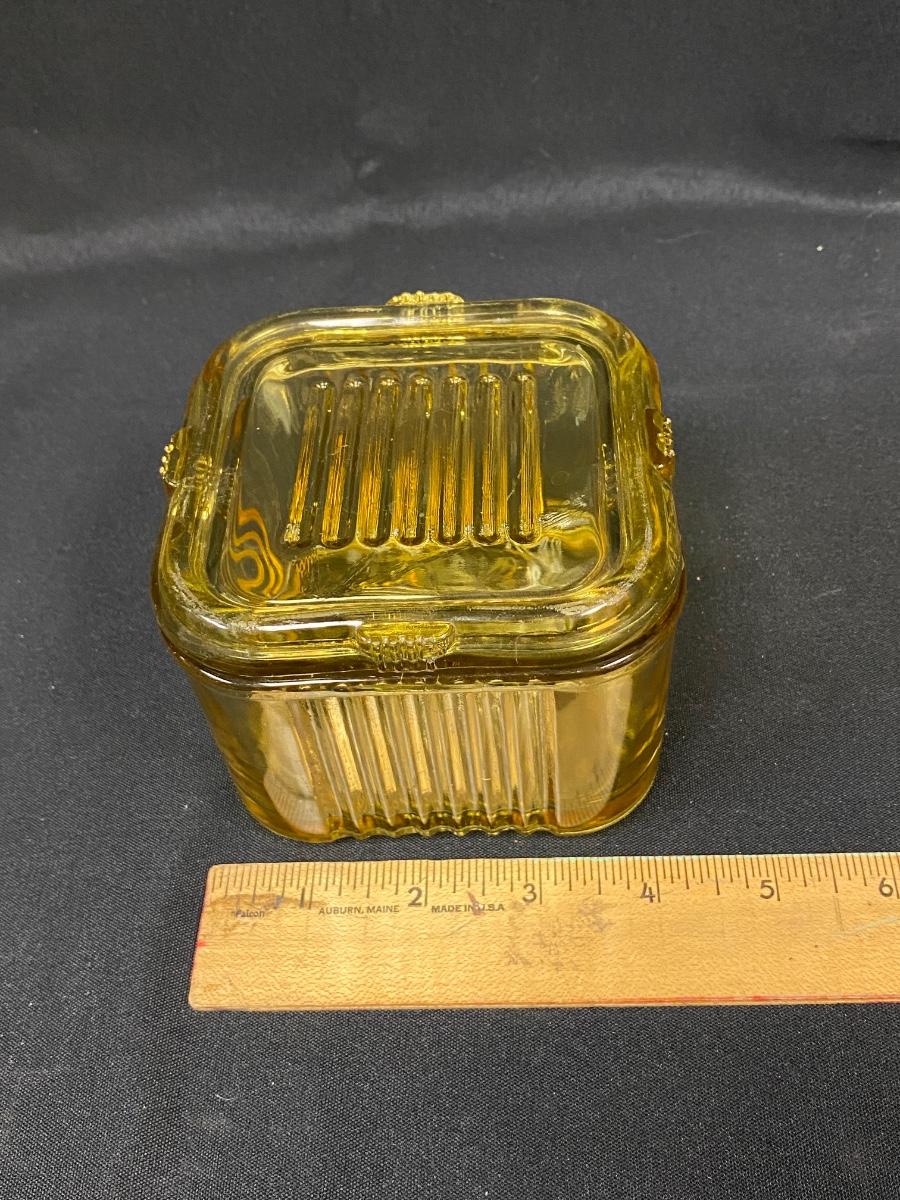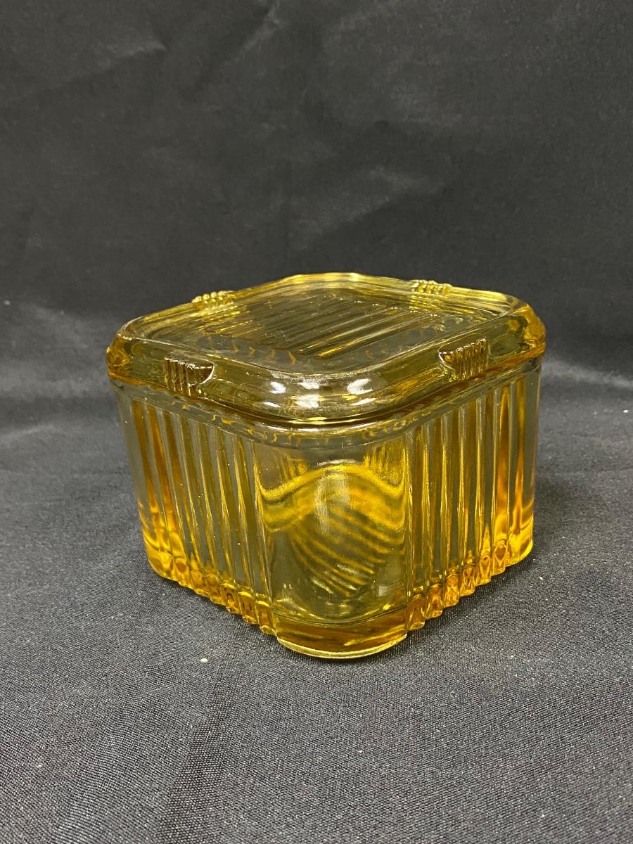 Vintage Yellow Gold Lidded Ribbed Glass Refrigerator Food Storage Container. Beautiful color. In good condition, no chips. About 4" size.