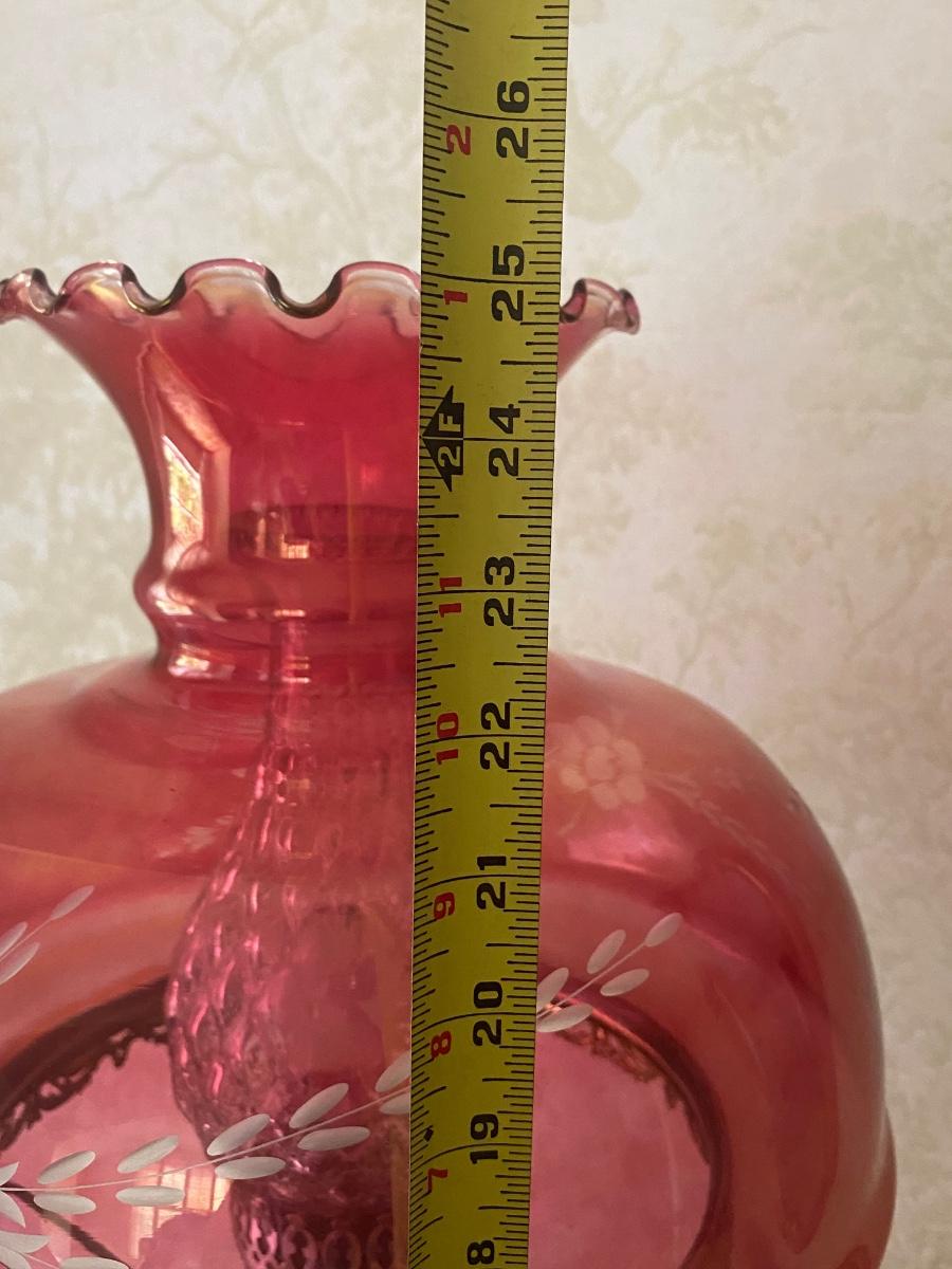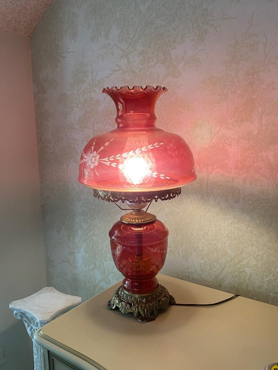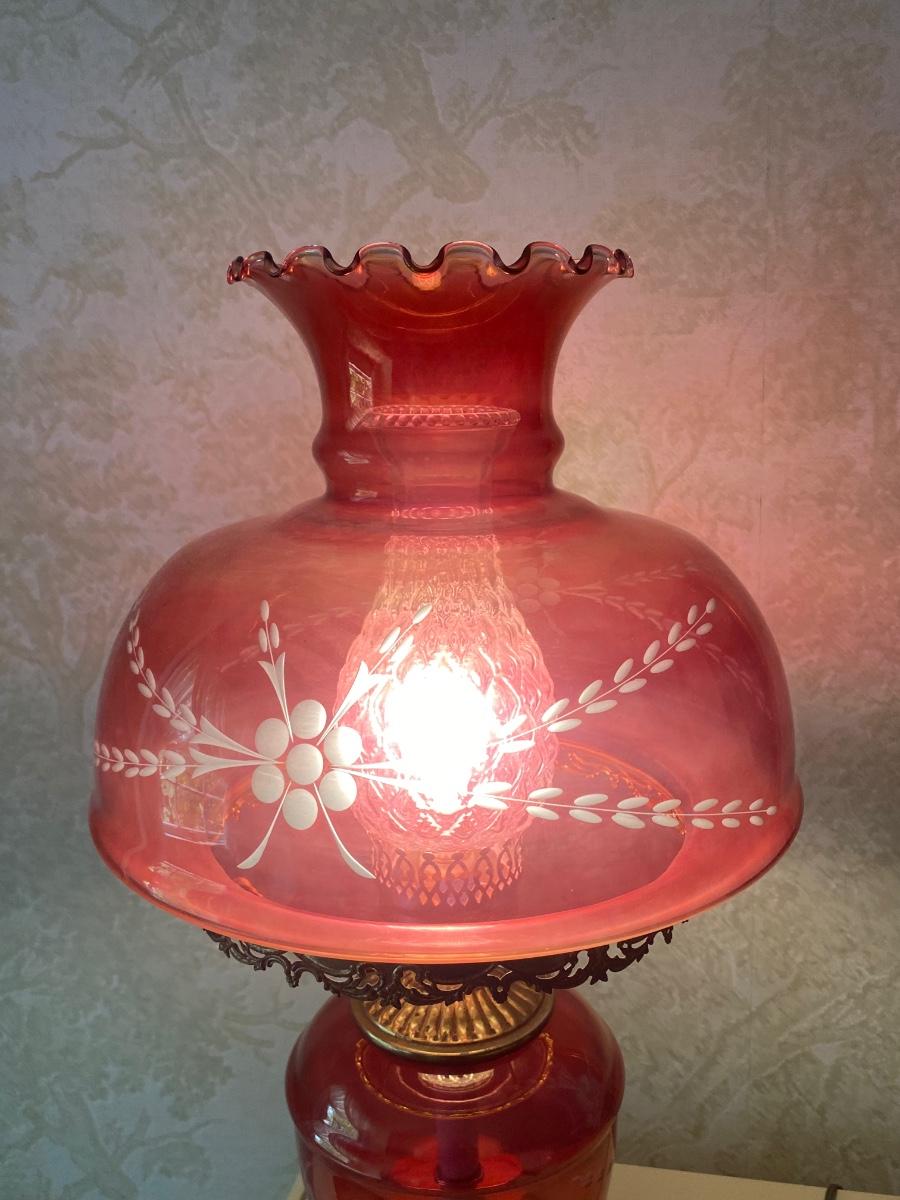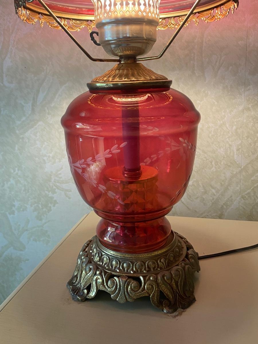 Vintage Antique Victorian Parlor Lamp Cranberry Cut to Clear Glass Globe & Base