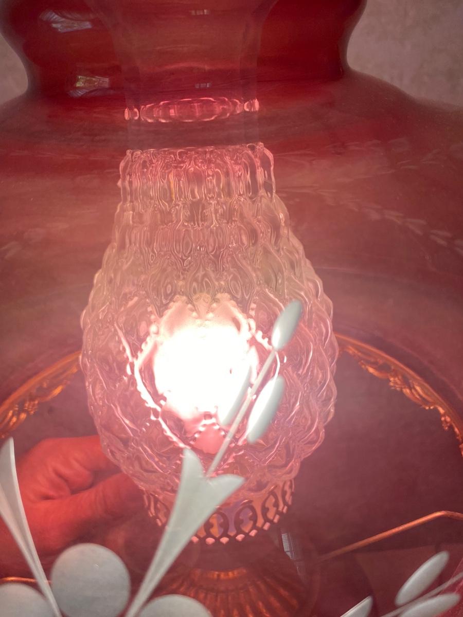 Vintage Antique Victorian Parlor Lamp Cranberry Cut to Clear Glass Globe & Base. In beautiful condition. Not sure if there should be a lower light but upper bulb works. Hurricane inside has a quilted look to it.