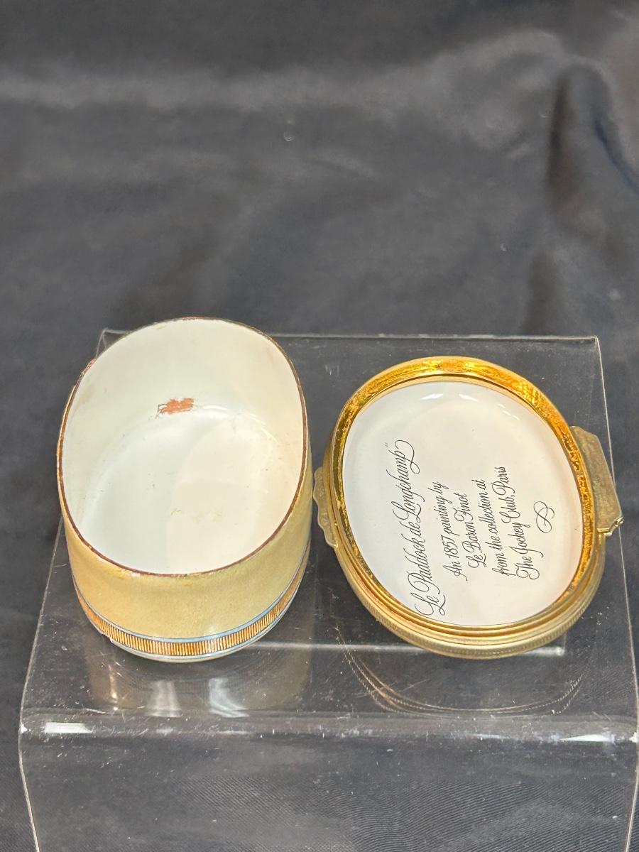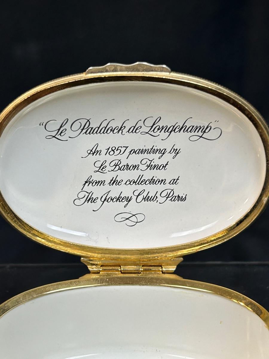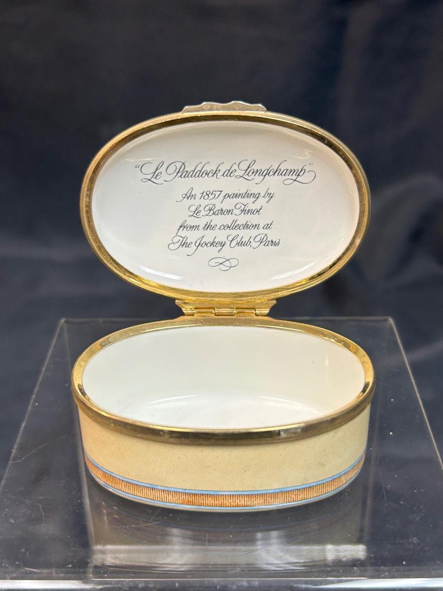 Vintage Horse Racing Jockey Club Themed Trinket Box Halcyon Days Enamels. Displays good but there is damage to the back side bottom edge. The hinged lid bracket needs to be glued back into place also.