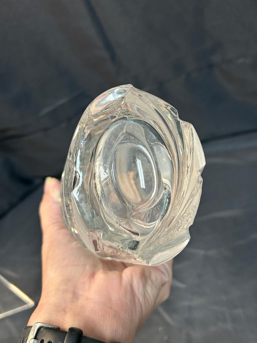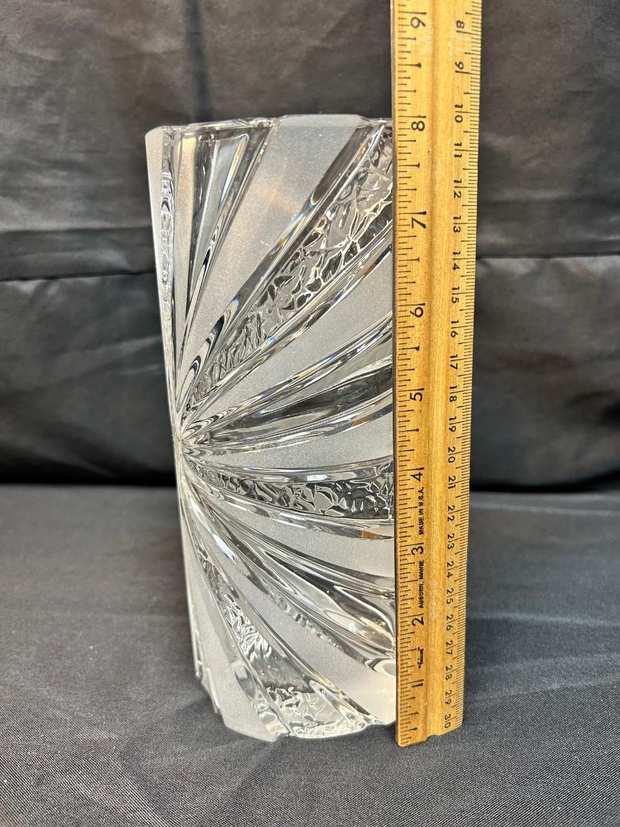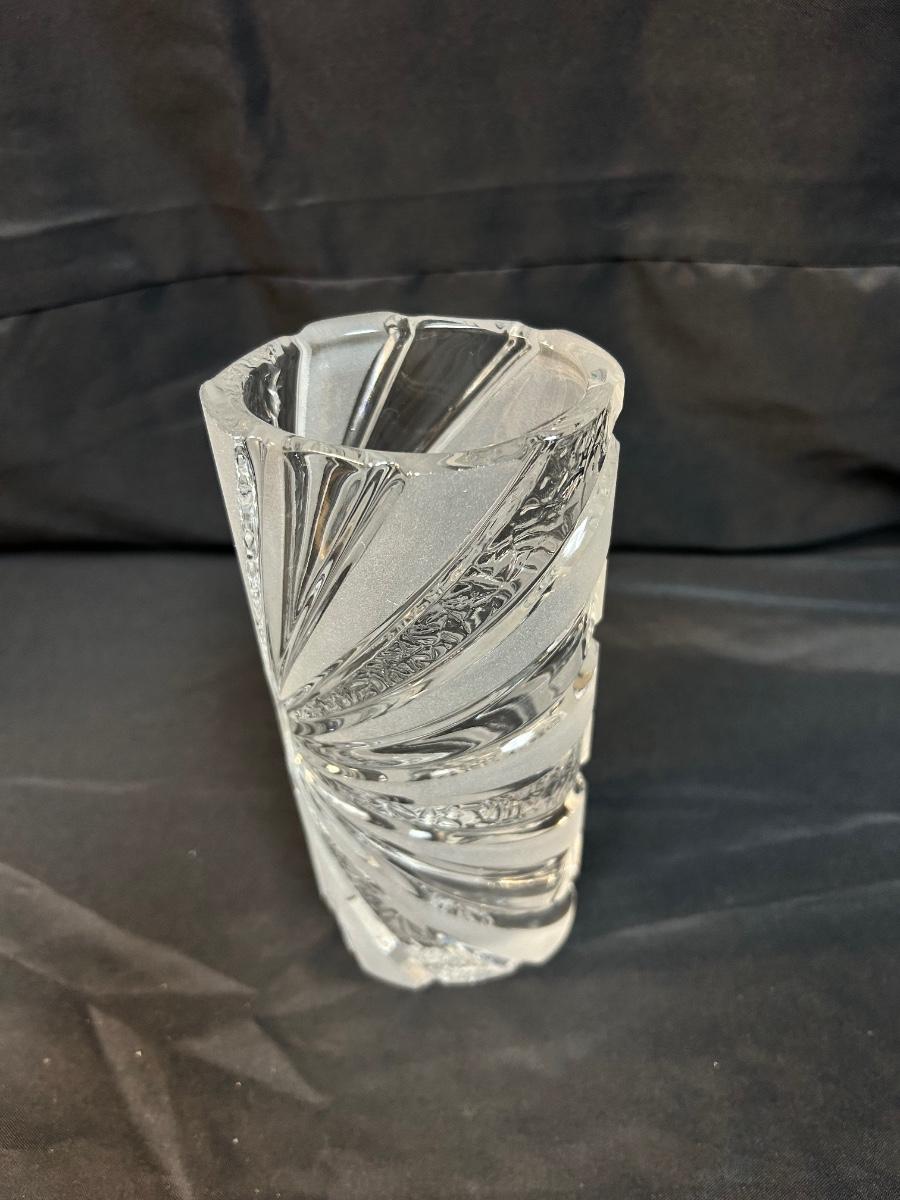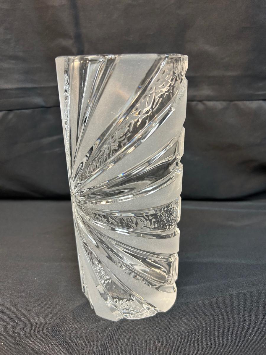 Thick Heavy Crystal Glass Frosted Swirl Flower Vase. In good condition. No hallmark found. About 8" size.