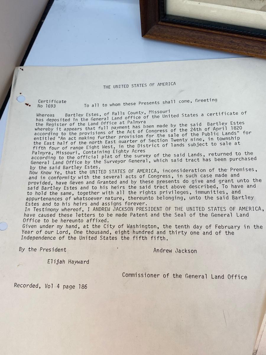 Antique 1831 United States Framed Land Document Missouri Signed by Pres. Andrew Jackson with Photocopy and Transcript. Document shows signs of age as expected. Comes with a photocopy of framed document and a transcript of what the document says. Document does not have a COA but looks to be real.