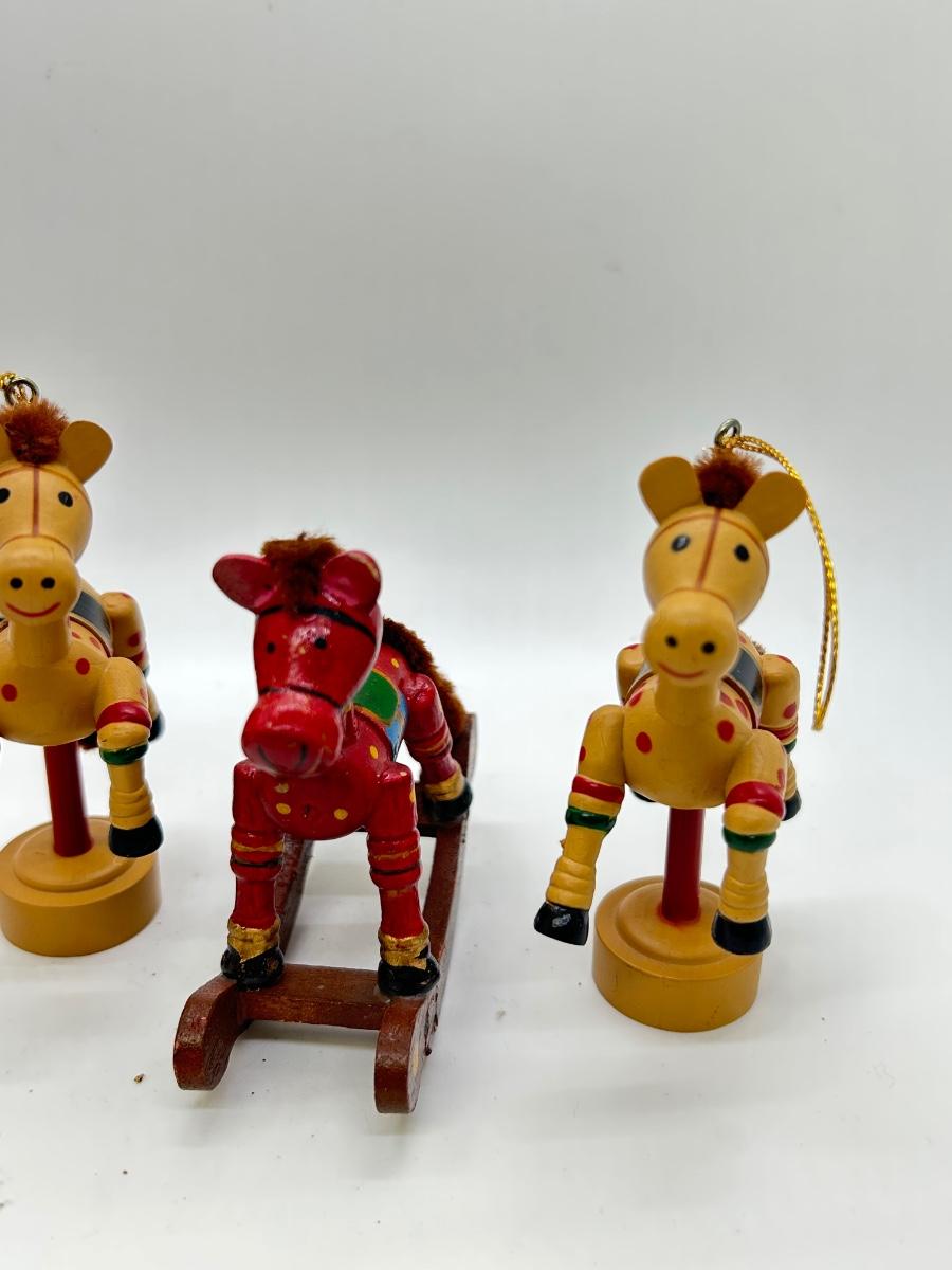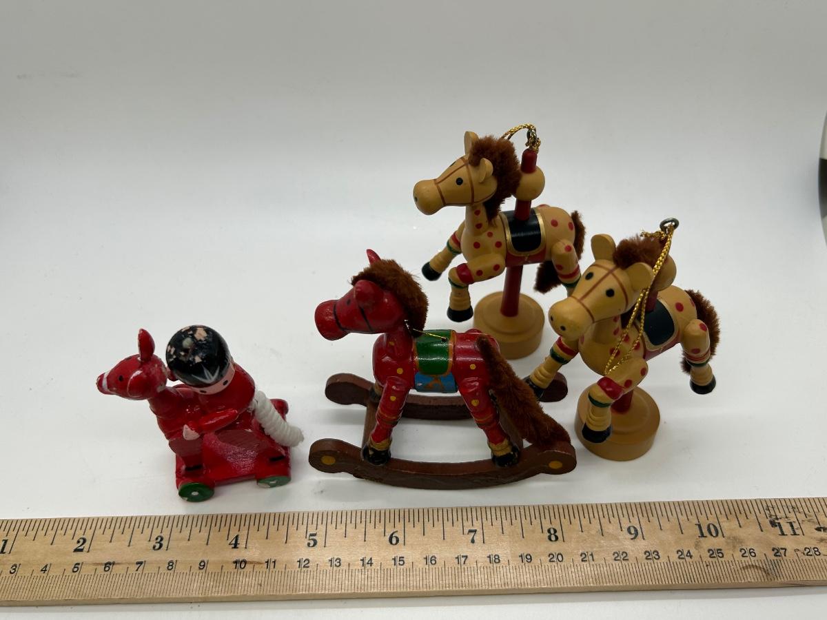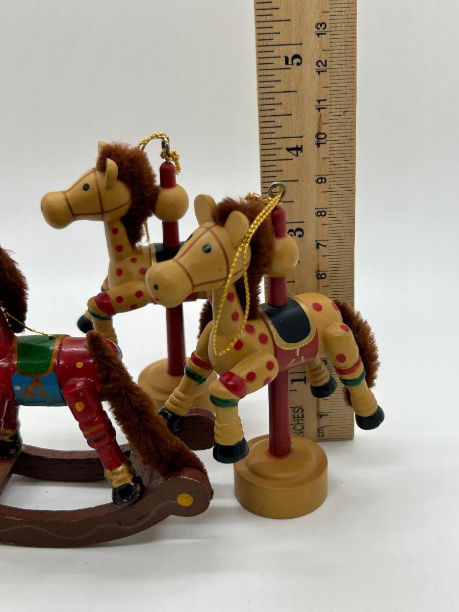 Wooden Christmas Holiday Rocking Horse Tree Ornaments. Lot of 4 painted wood ornaments in good previously displayed condition.
