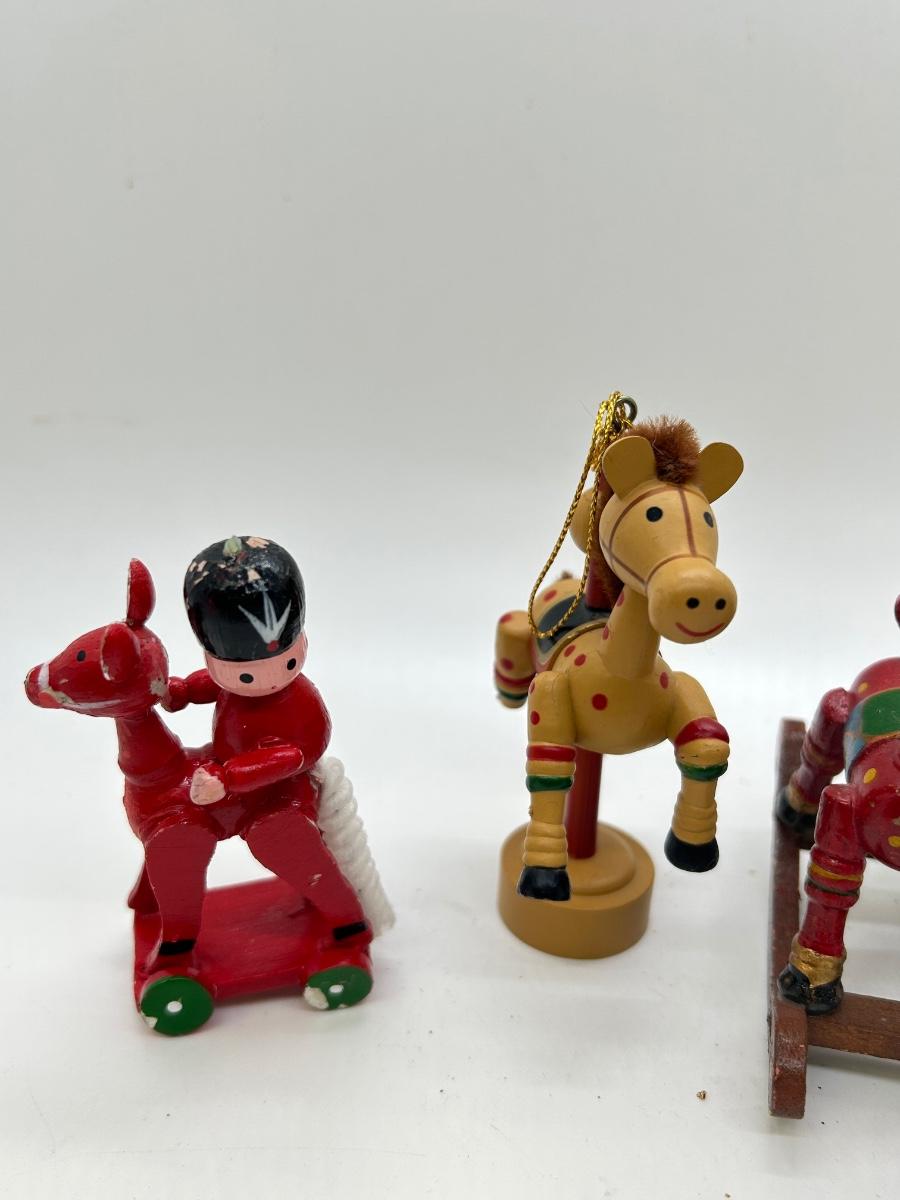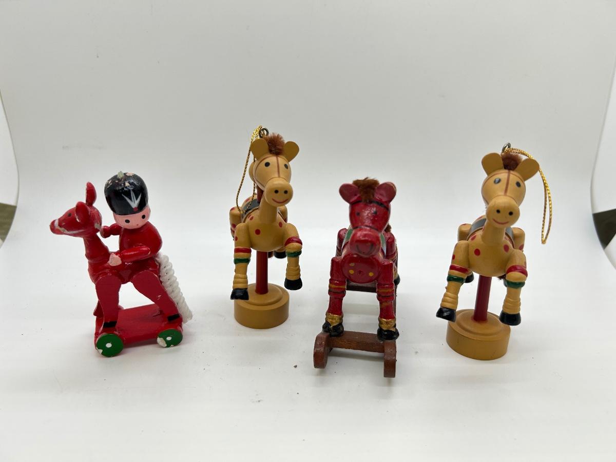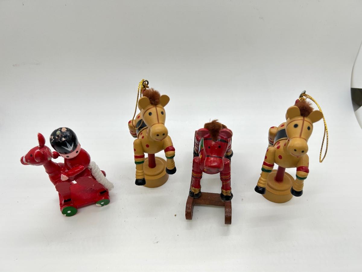 Wooden Christmas Holiday Rocking Horse Tree Ornaments. Lot of 4 painted wood ornaments in good previously displayed condition.