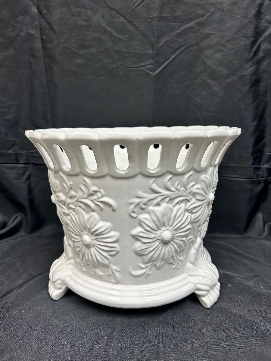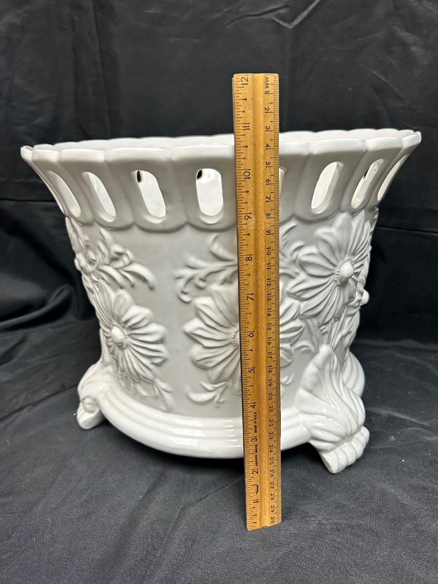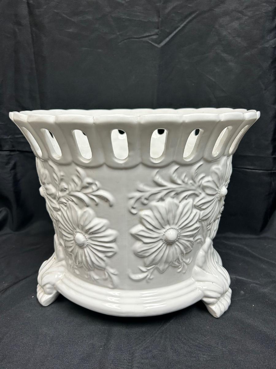 Large Flower Embossed Footed Ceramic Planter Pot. In good used condition. Fluted top, no holes. About 11" tall with 12" diameter.
