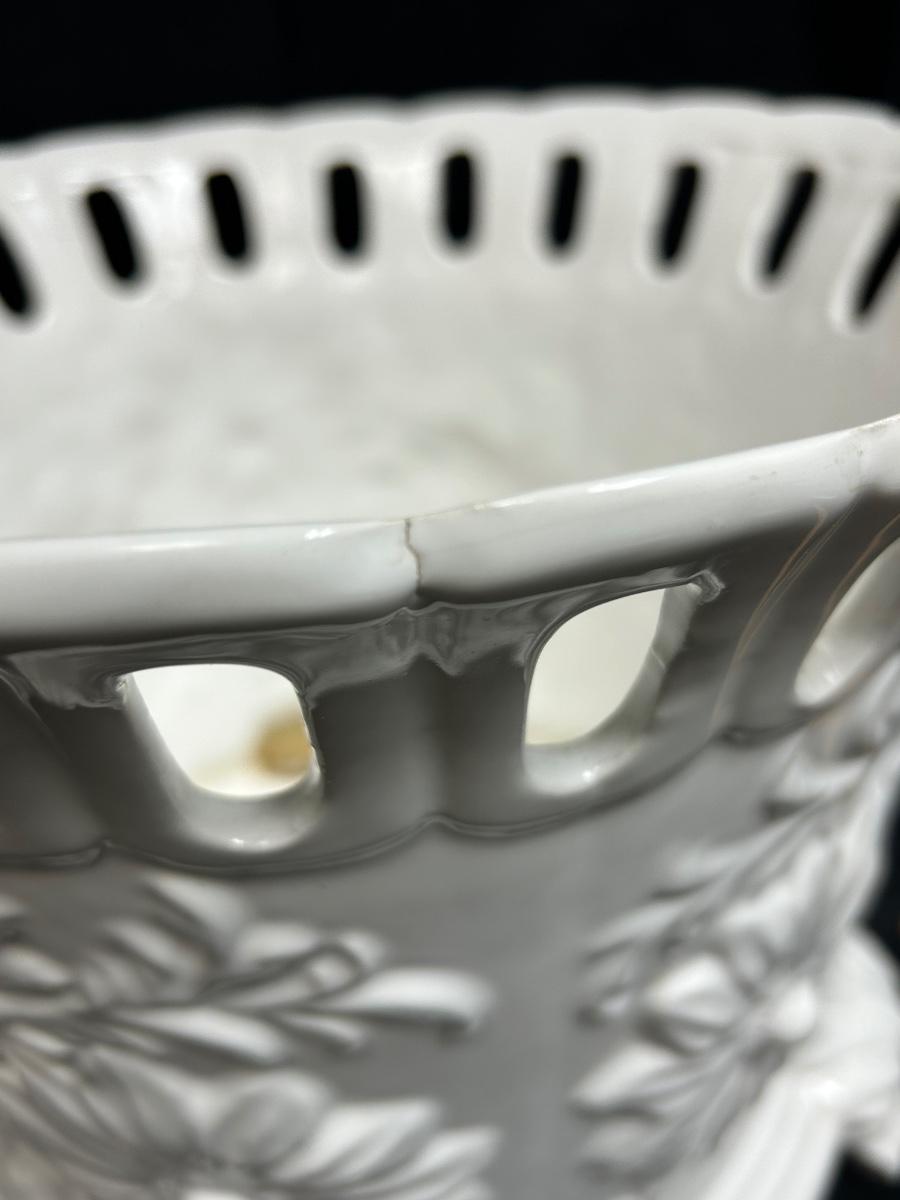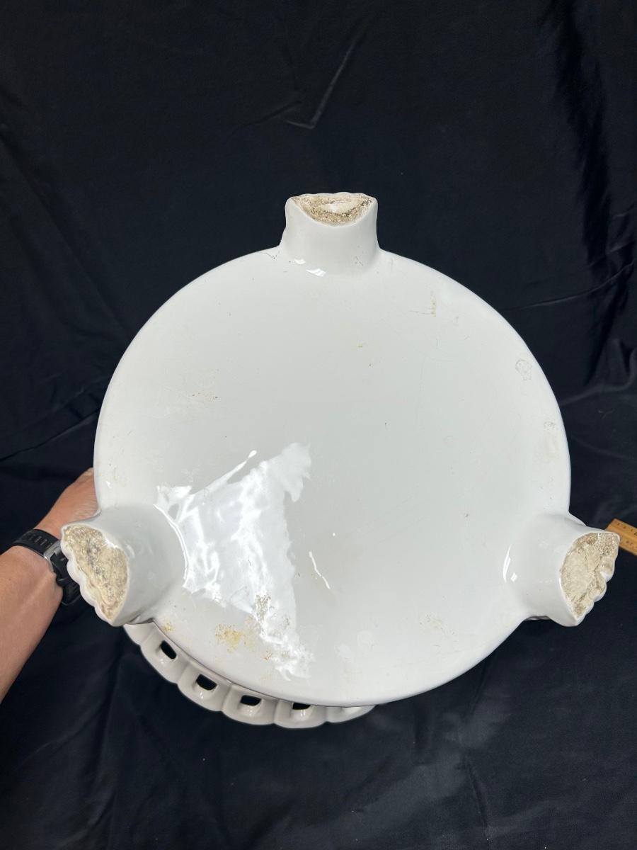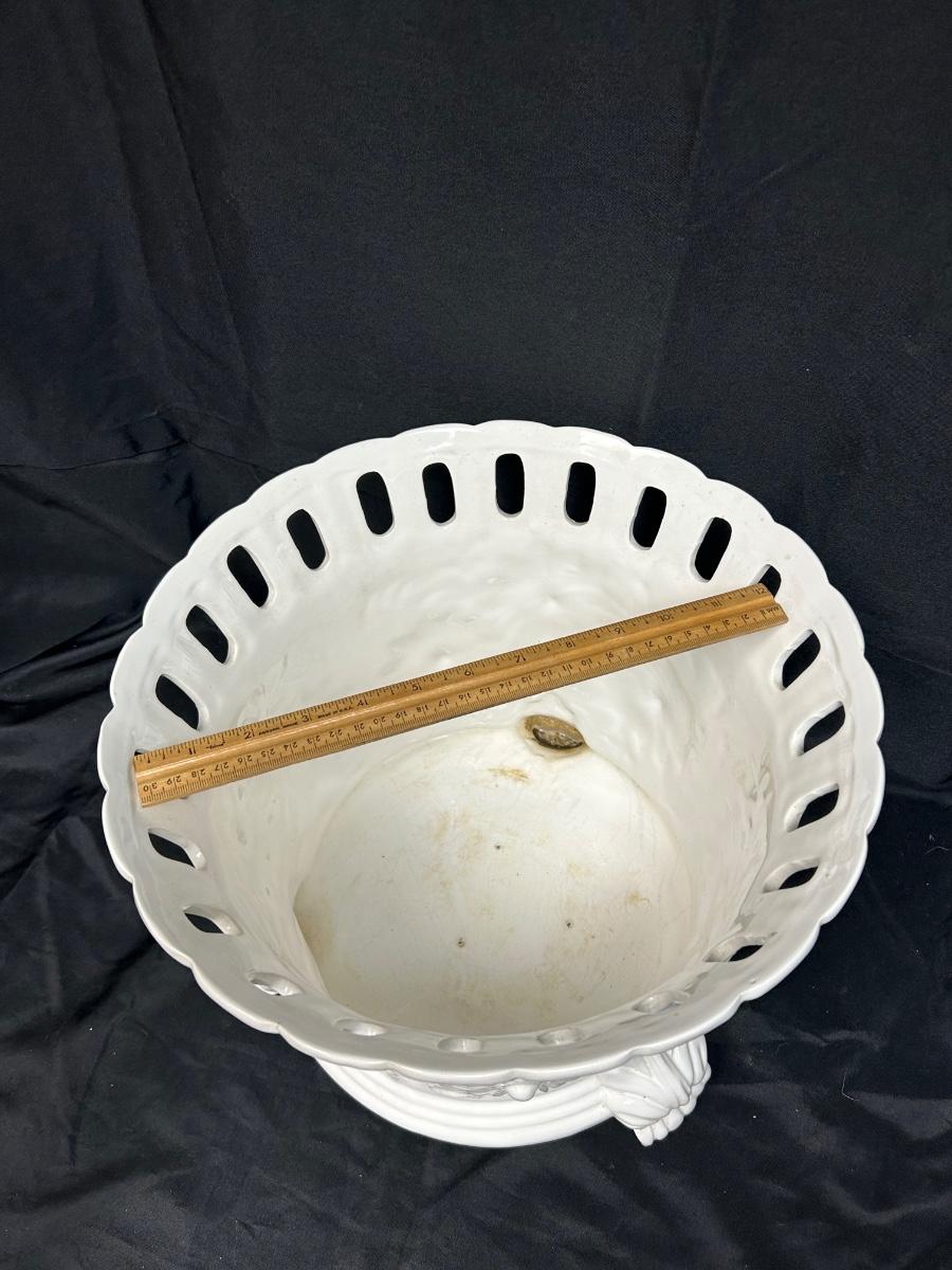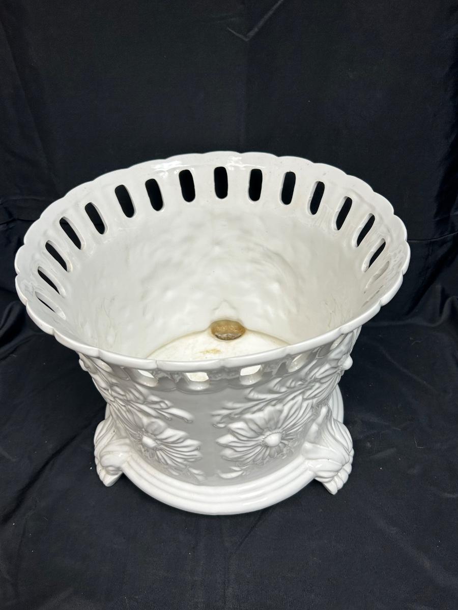 Large Flower Embossed Footed Ceramic Planter Pot. In good used condition. Fluted top, no holes. About 11" tall with 12" diameter.