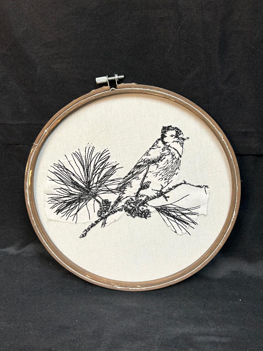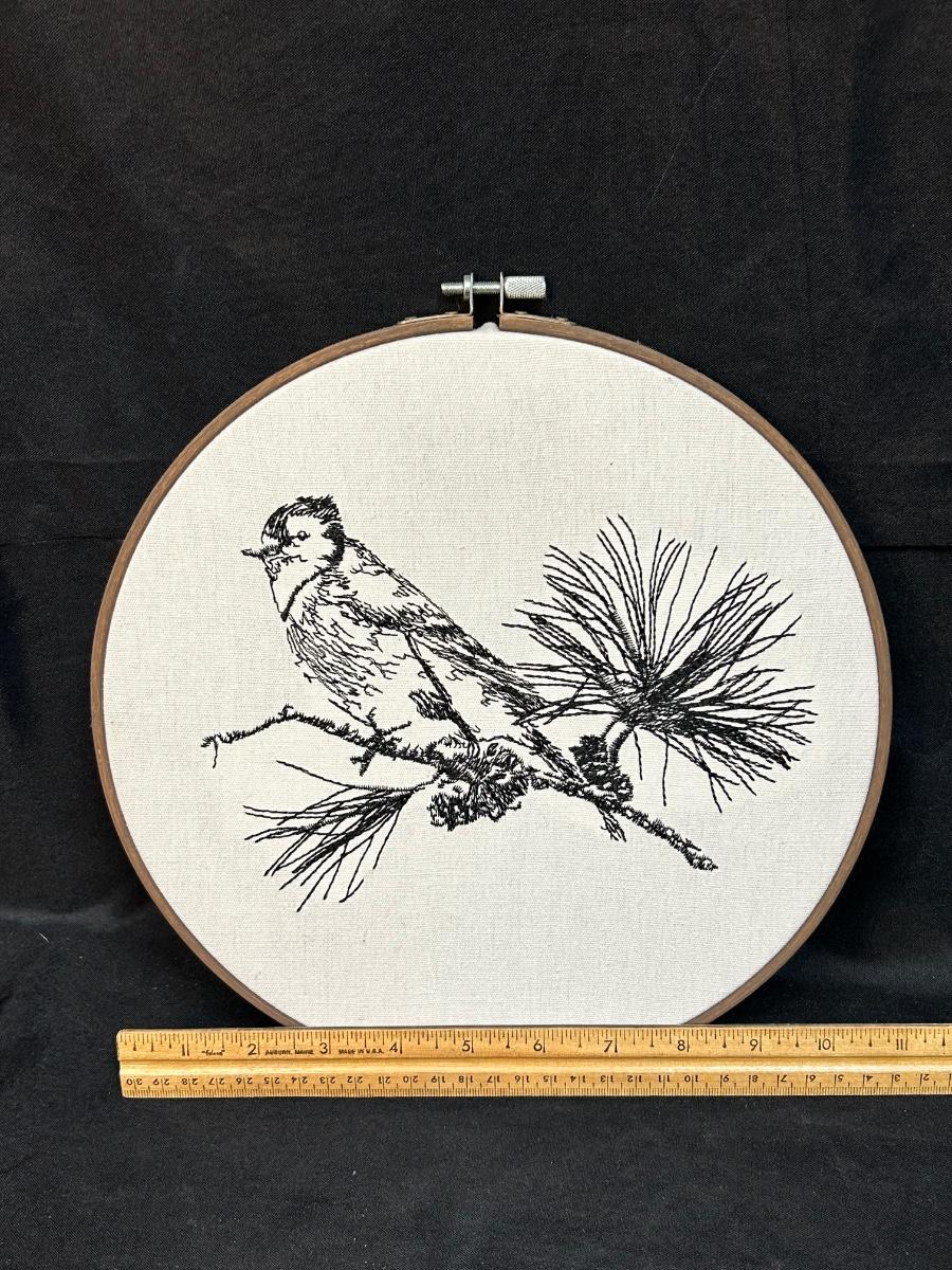 Hand Stitched Cardinal Bird on Pine Branch Black Floss Embroidery Wall Art. In good condition. About 10" diameter.