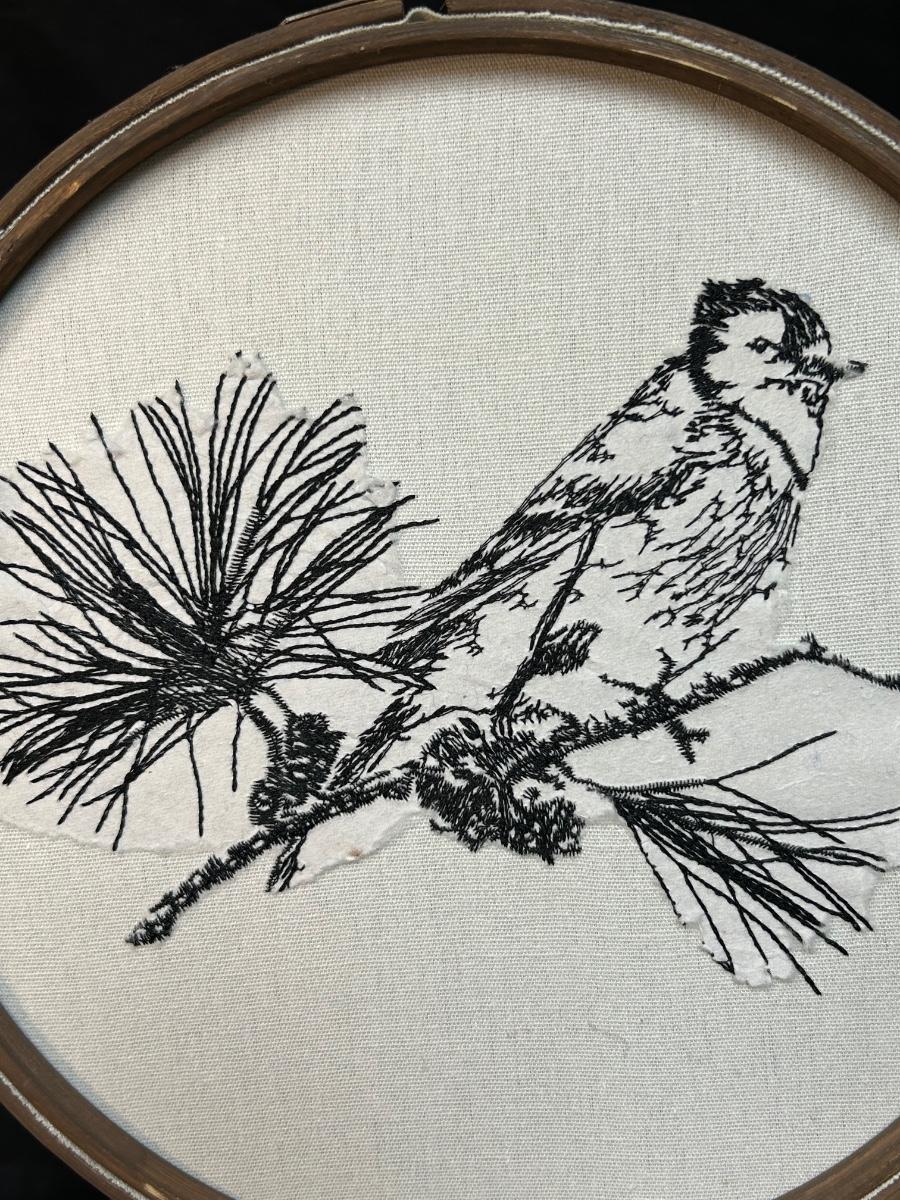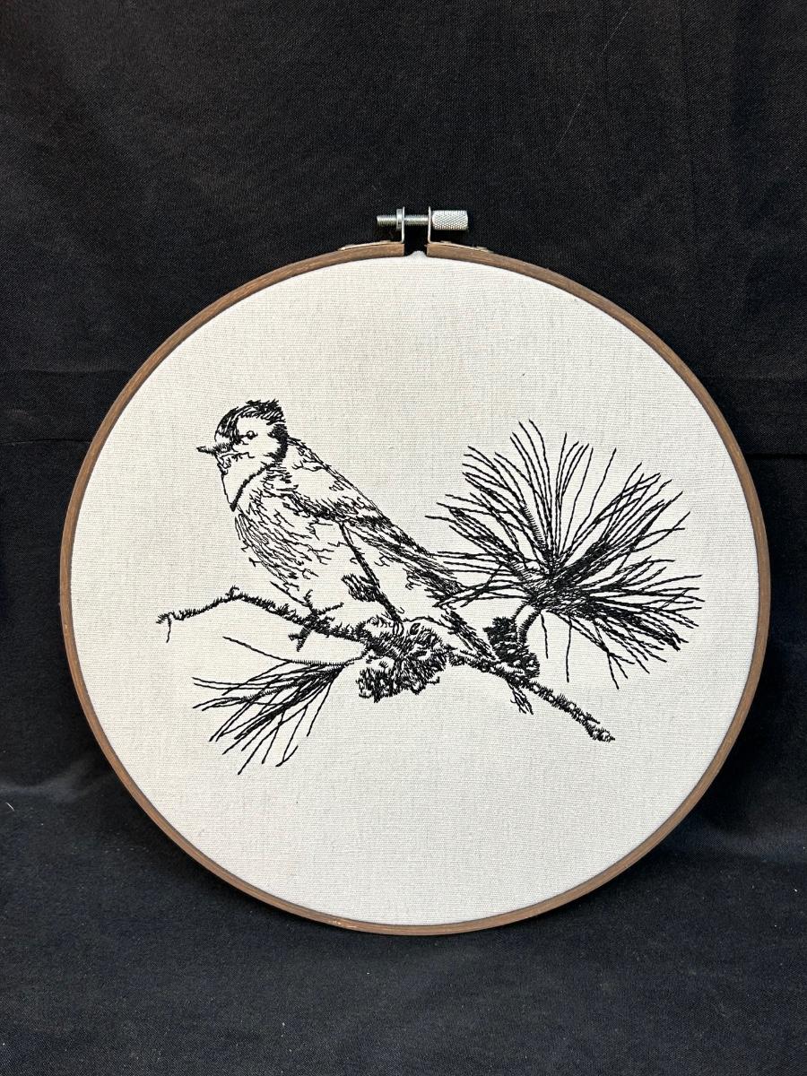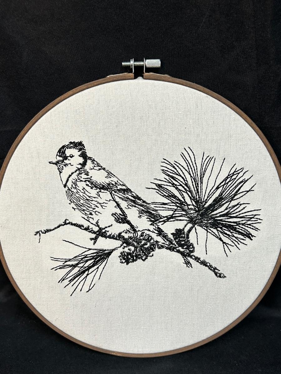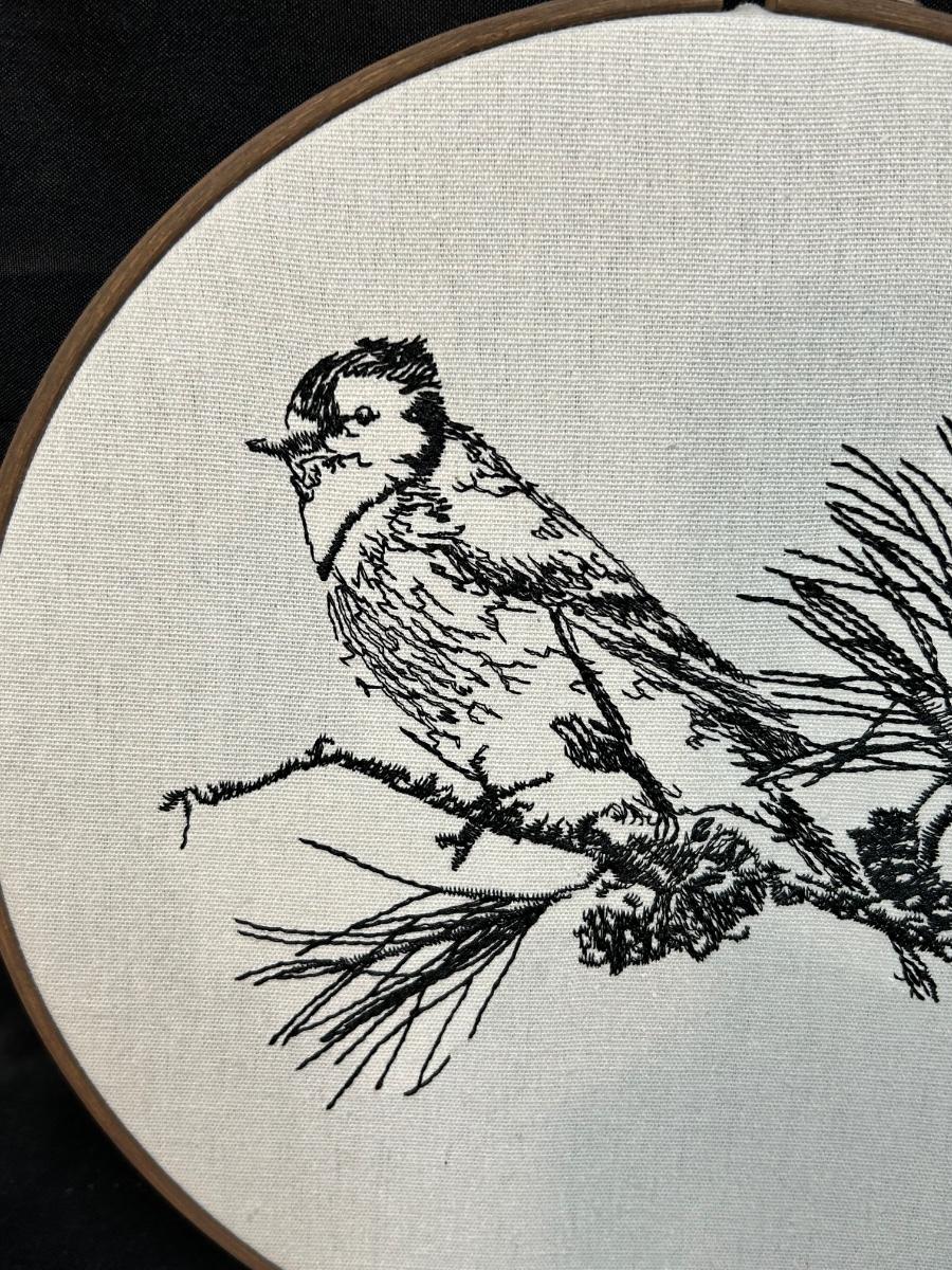 Hand Stitched Cardinal Bird on Pine Branch Black Floss Embroidery Wall Art