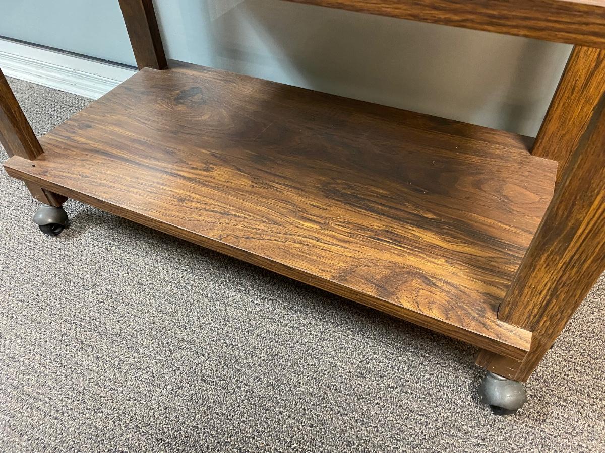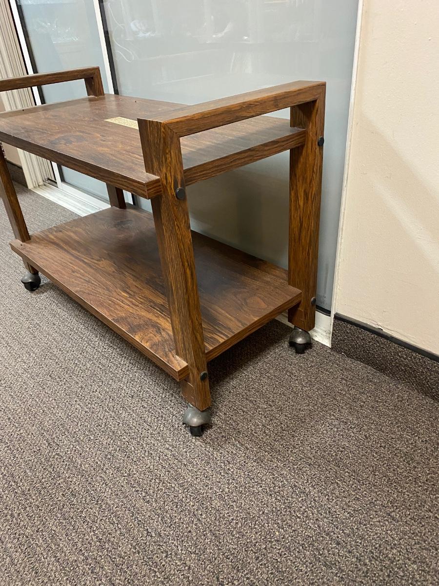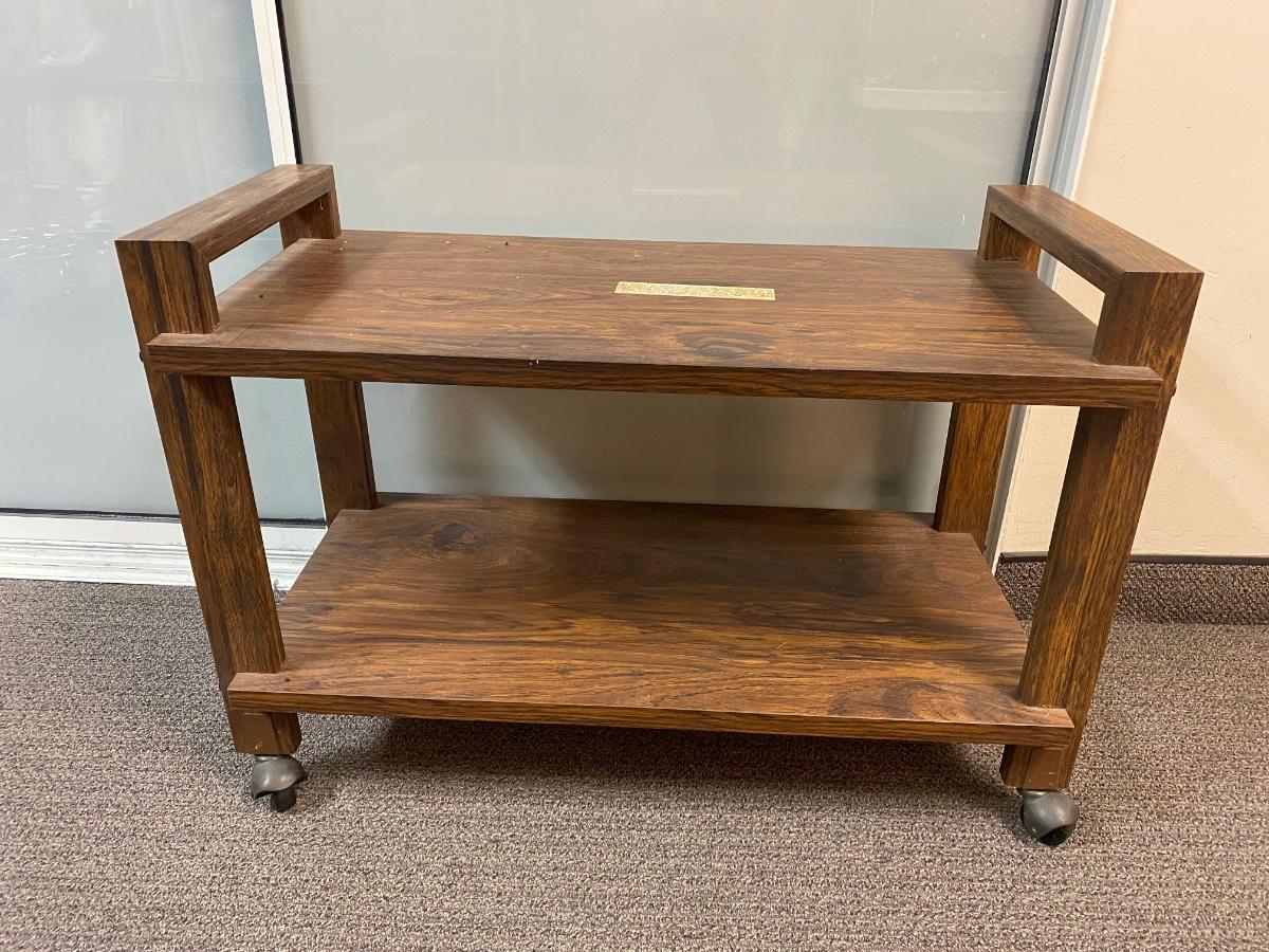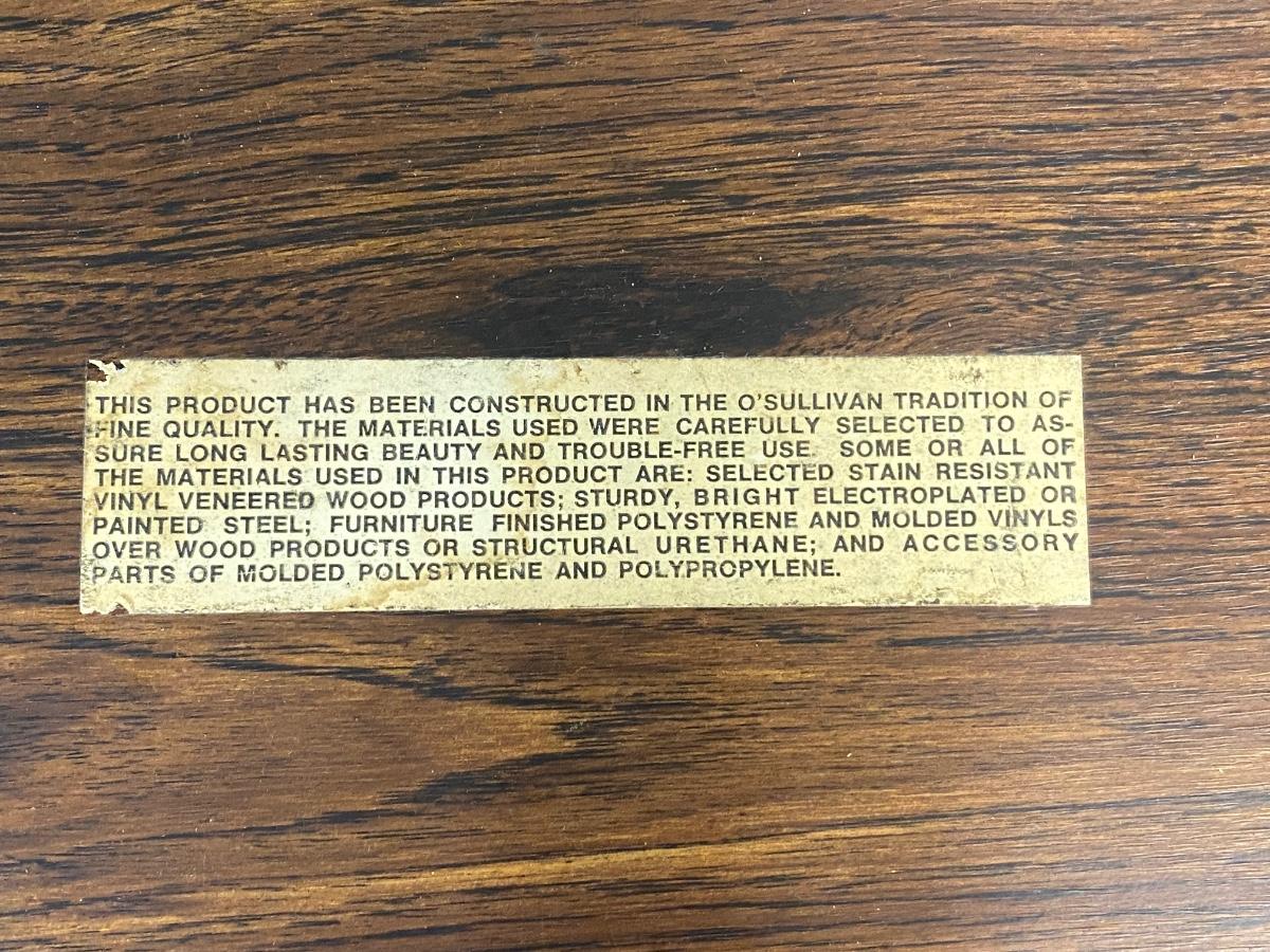 Vintage O'Sullivan Vinyl Veneered Wood Rolling TV Media Cart Table. There is a sticker on the surface that would probably come off pretty easy with cleaner. In good vintage condition. Vinyl veneer is in good condition. Cap covered screws could use a tightening up, rolls well.