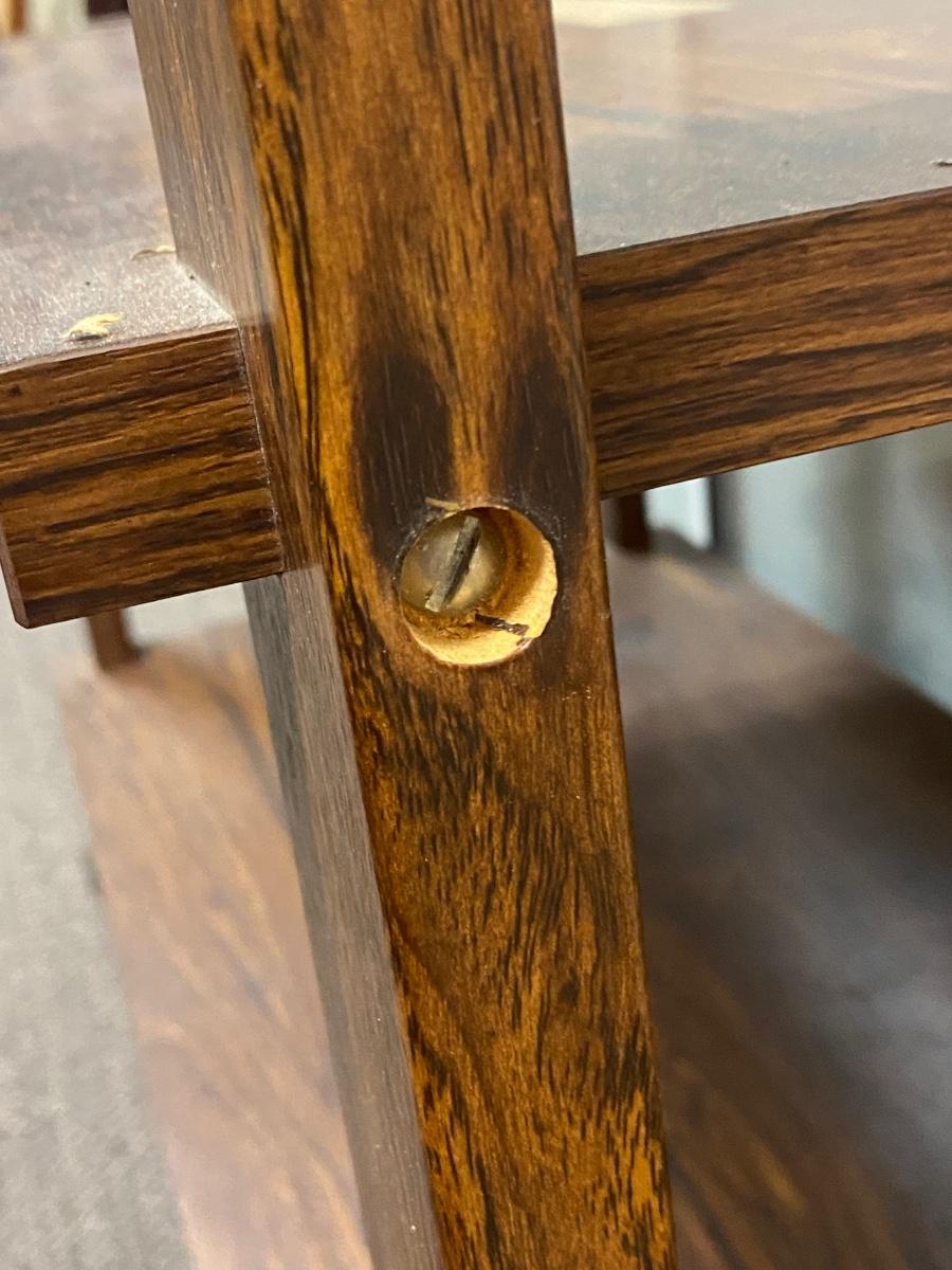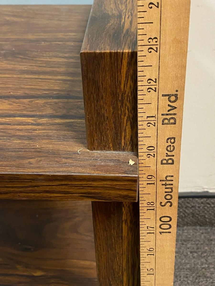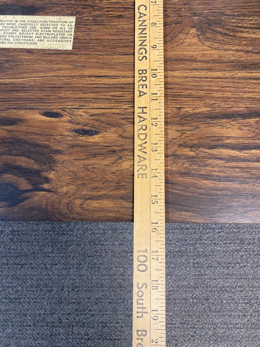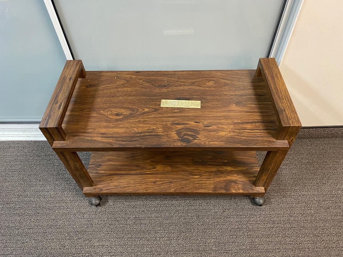 Vintage O'Sullivan Vinyl Veneered Wood Rolling TV Media Cart Table. There is a sticker on the surface that would probably come off pretty easy with cleaner. In good vintage condition. Vinyl veneer is in good condition. Cap covered screws could use a tightening up, rolls well.