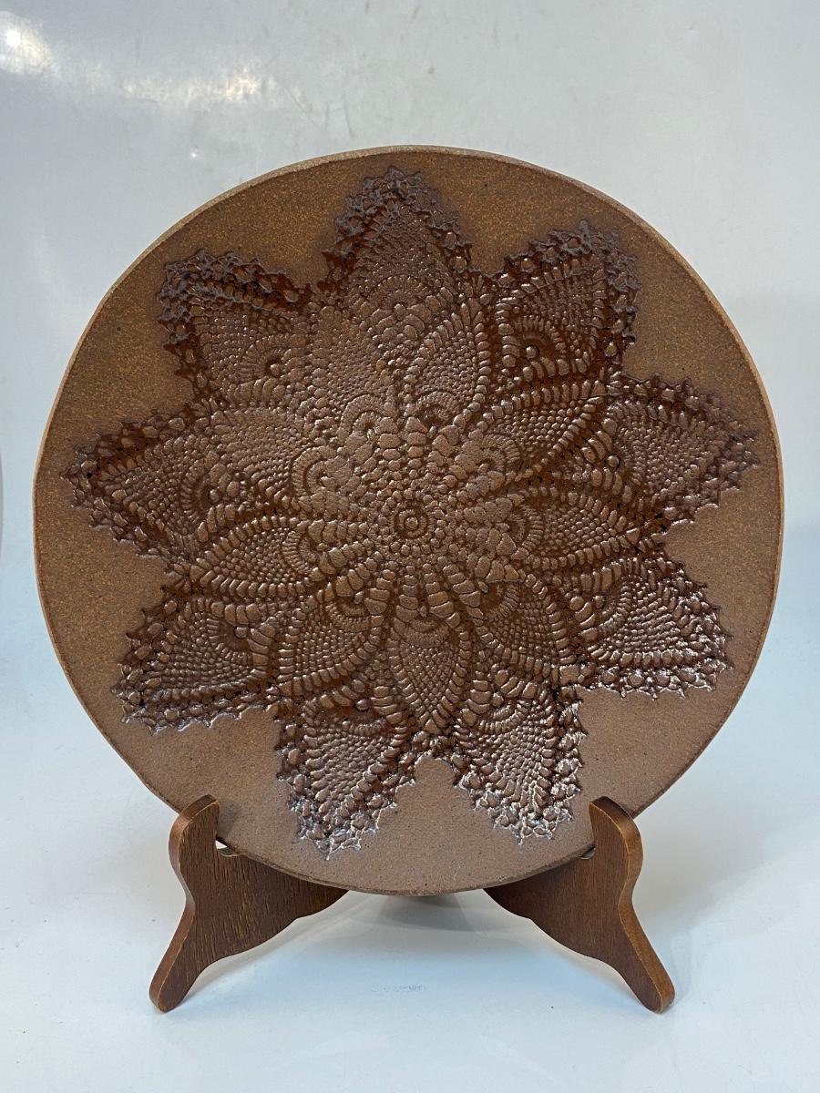 Vintage Retro Mandala Flower Stamped Stoneware Brown Clay Pottery Plate Medallion Console Dish