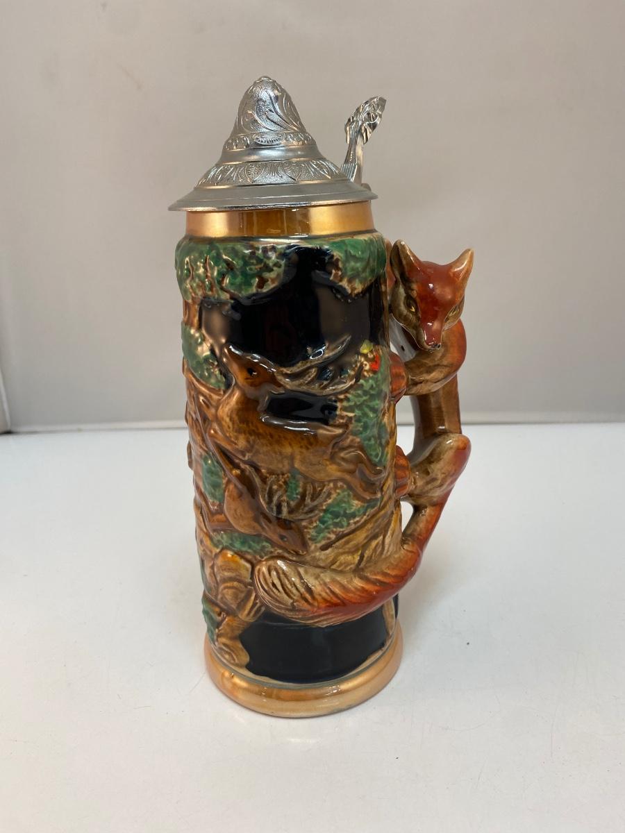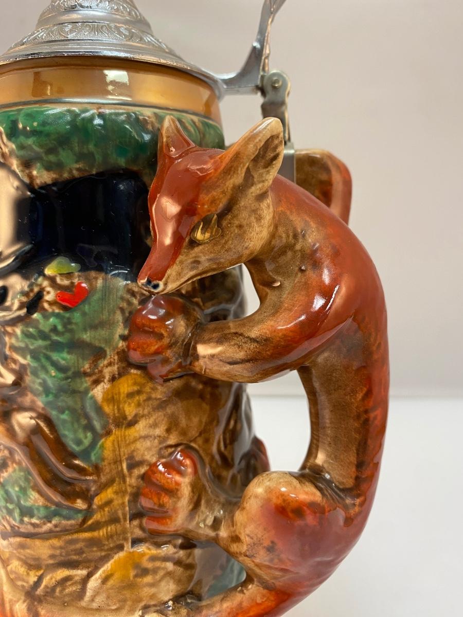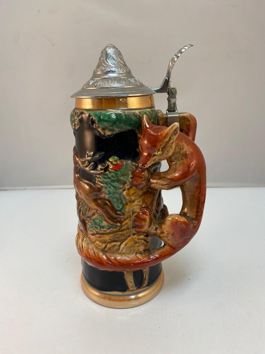 Vintage German Hunter Beer Stein Medieval Style Fox with Lid Musical music box