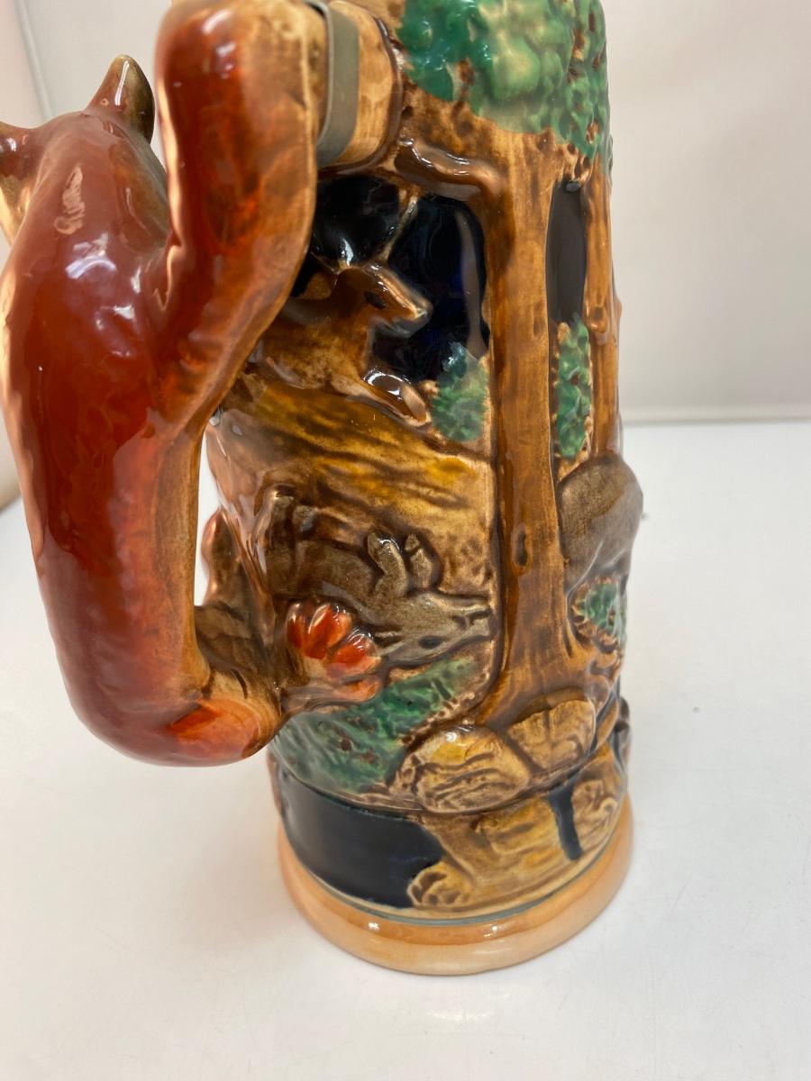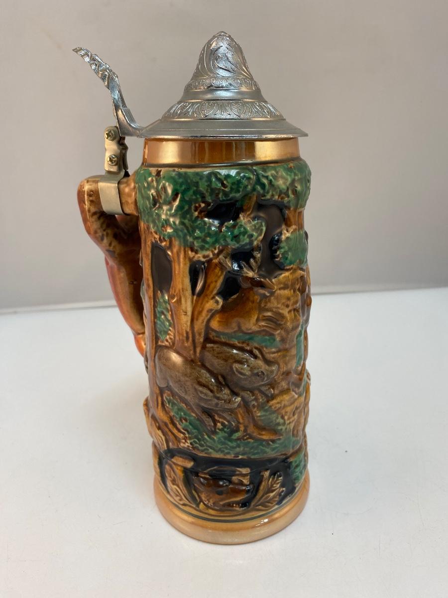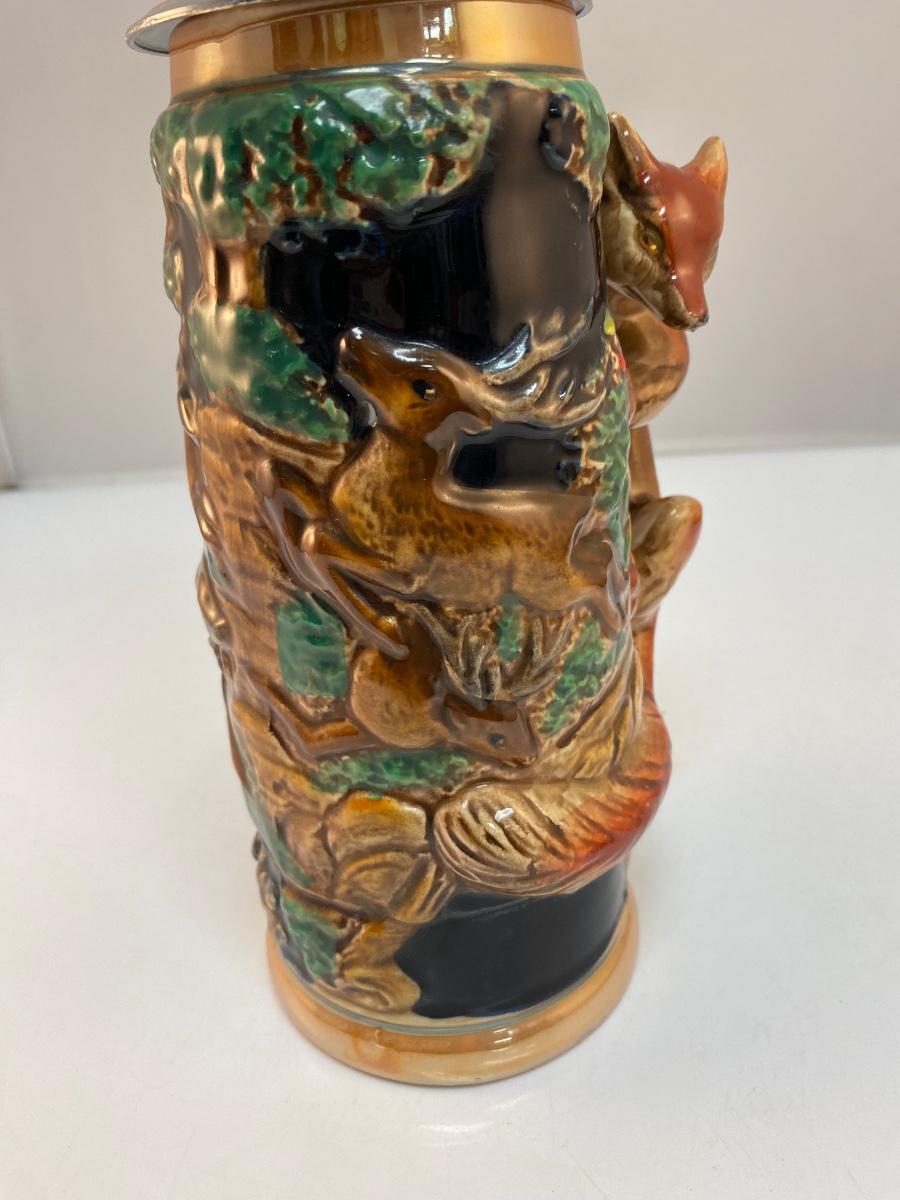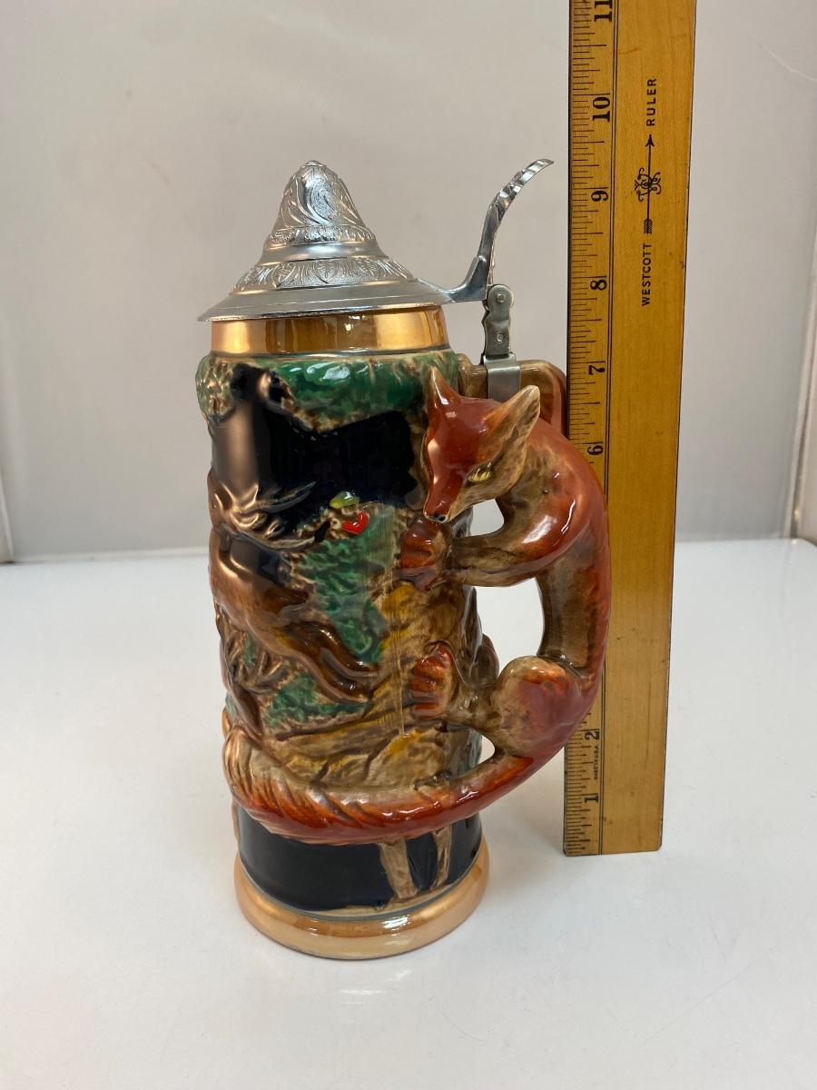 Vintage German Hunter Beer Stein Medieval Style Fox with Lid Musical music box