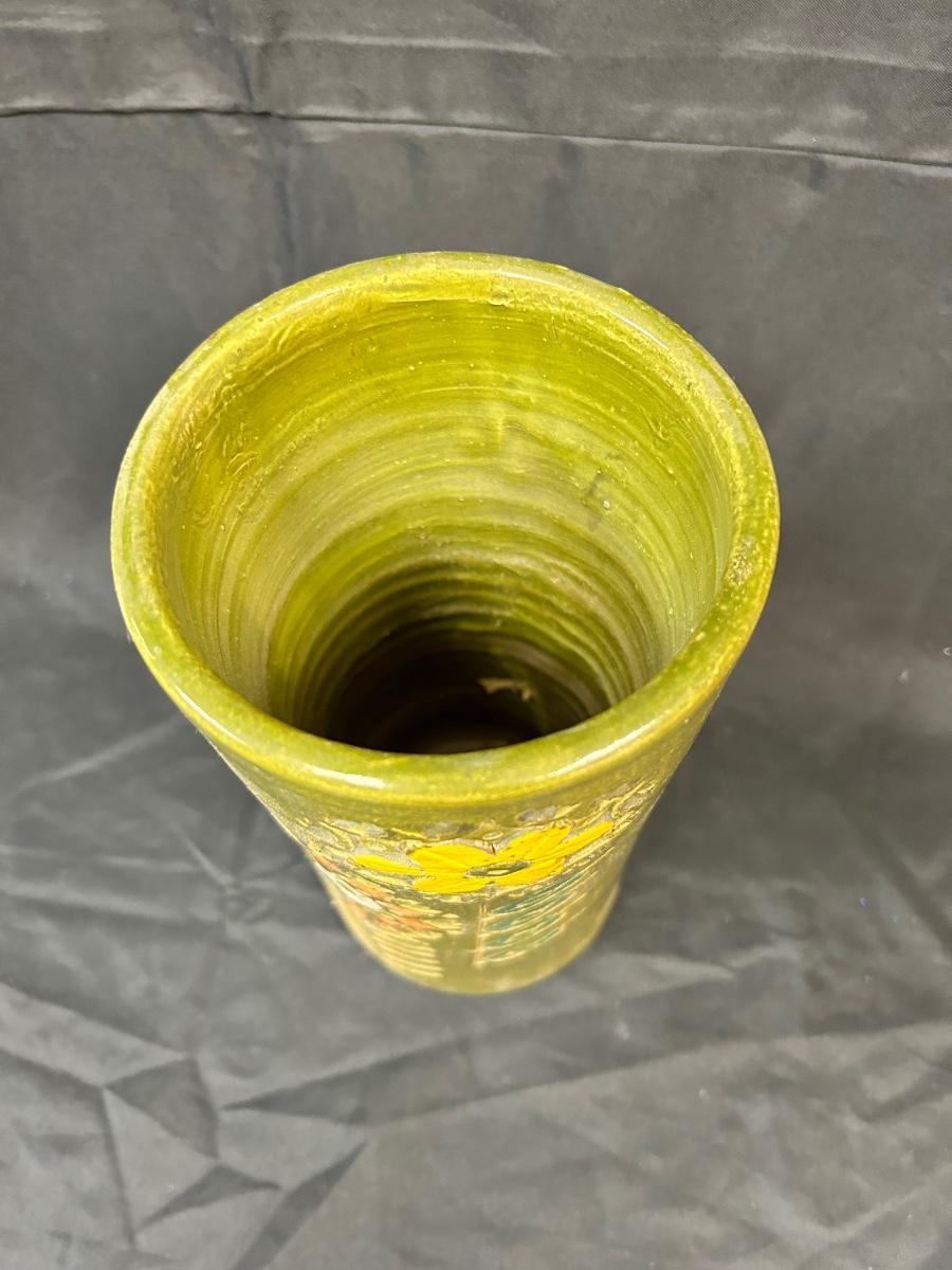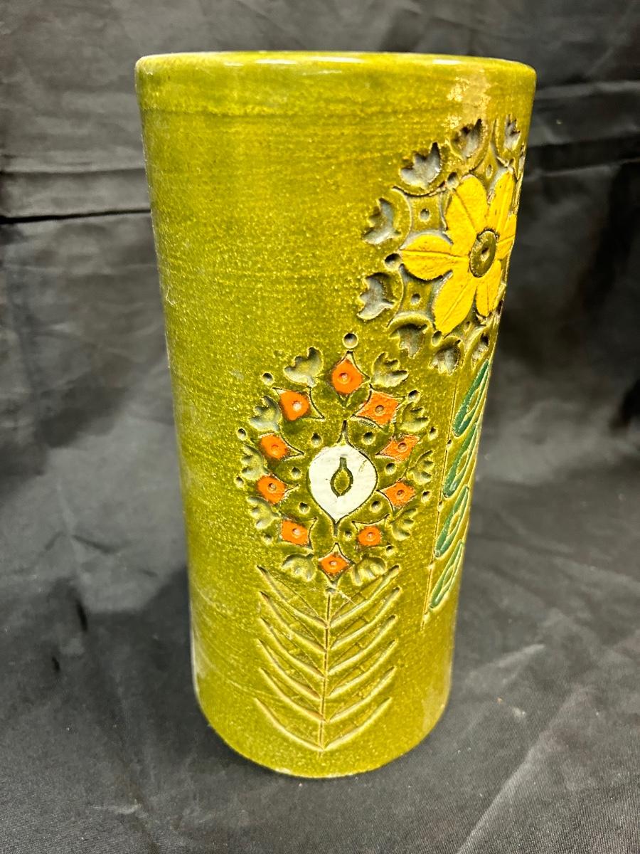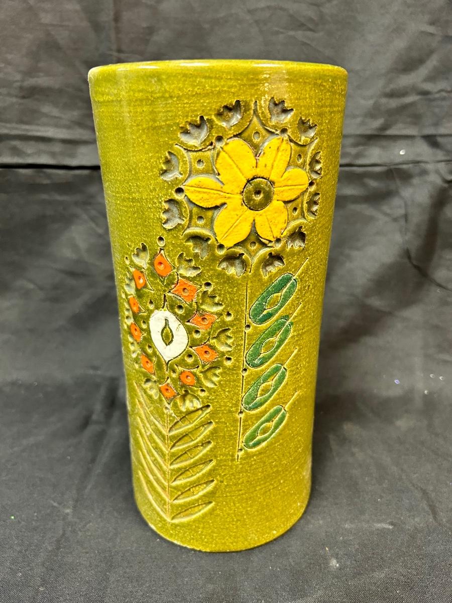 Vintage Floral Stamped Hand-Crafted Painted Pottery Vase Numbered. In good condition. Flower pattern stamped and painted on opposite sides. About 10" size. Numbered on the bottom and looks to be signed Italy.