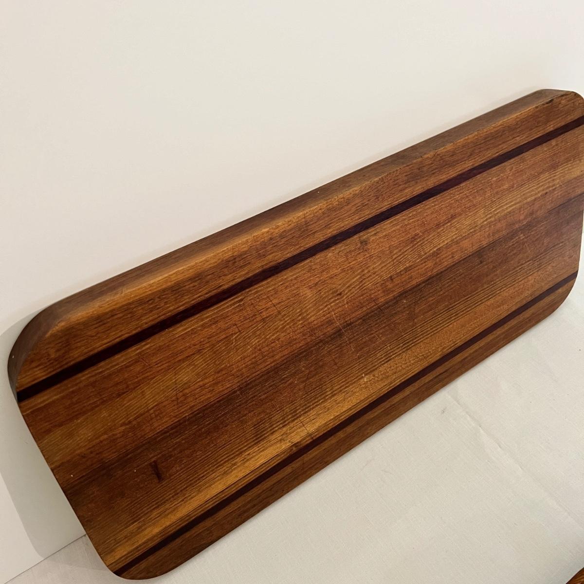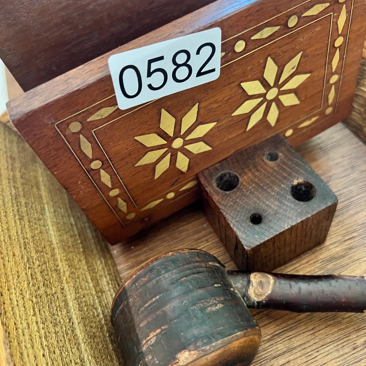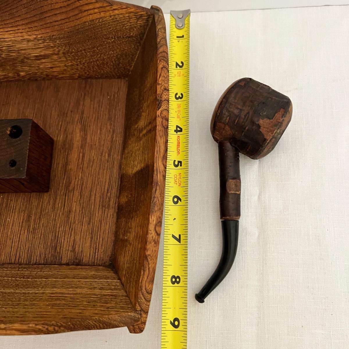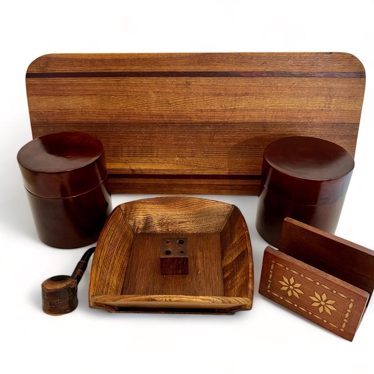 Great quality thick cutting board, 2 round wood canisters, brass inlaid napkin holder, primitive tray? and pipe.