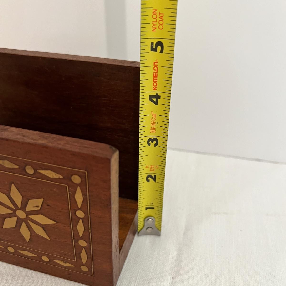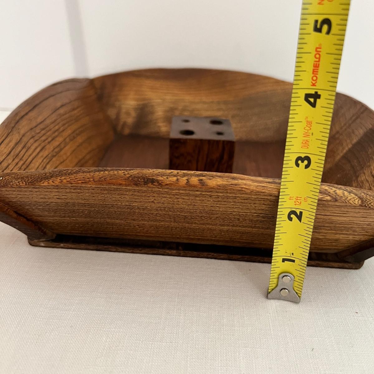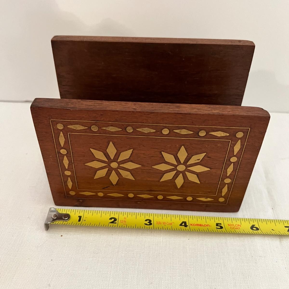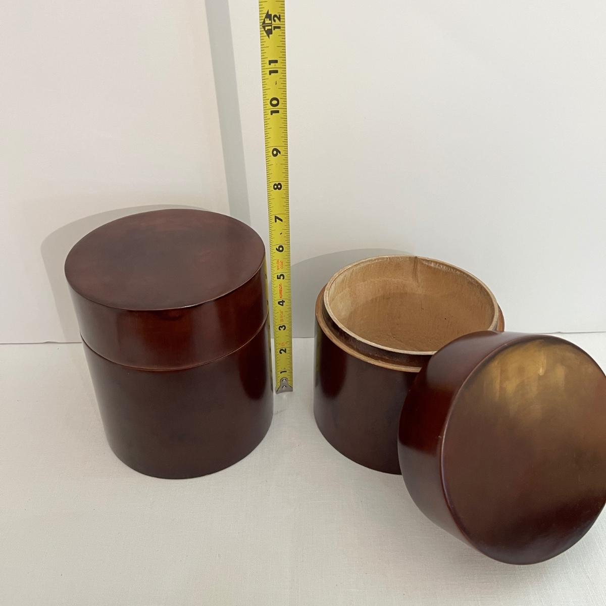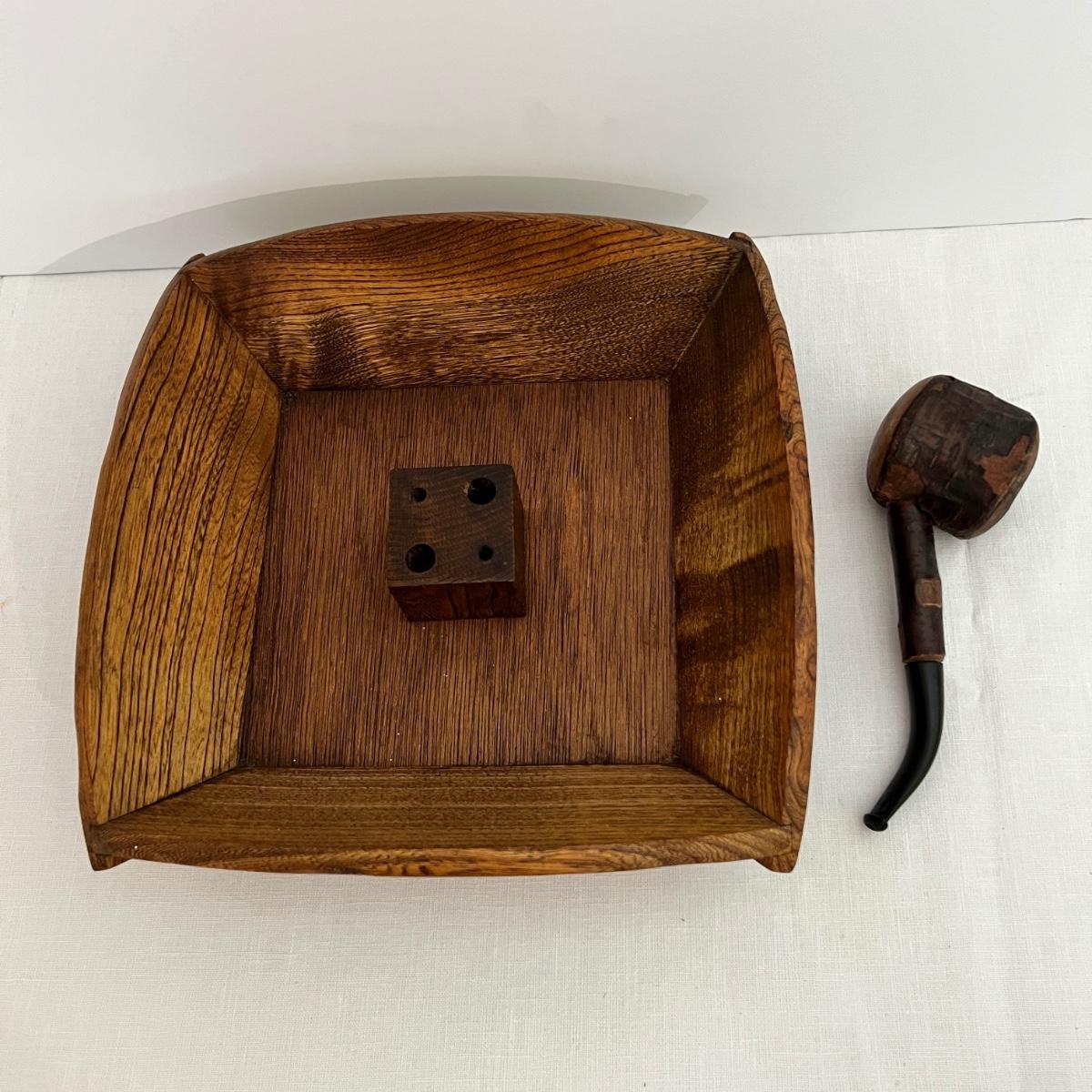 Great quality thick cutting board, 2 round wood canisters, brass inlaid napkin holder, primitive tray? and pipe.