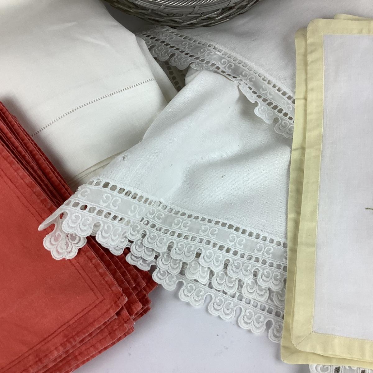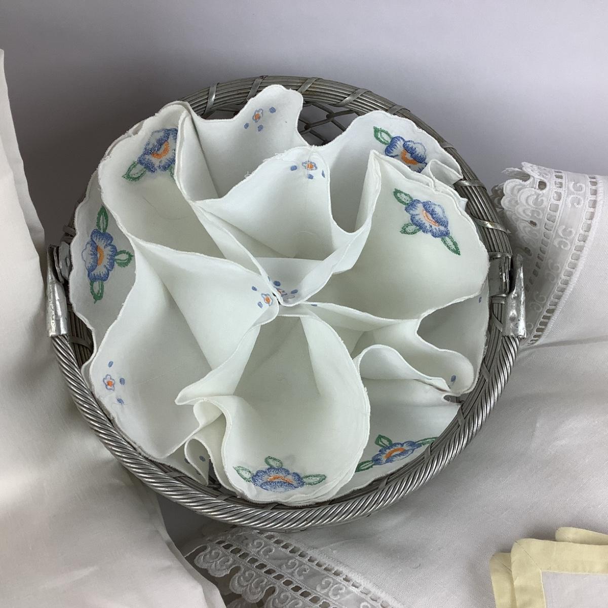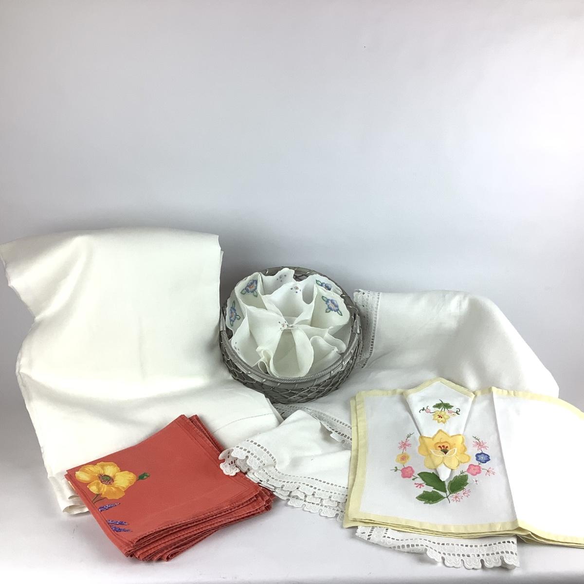 HC728 Large White Linen Tablecloth with Floral Embroidered Placemats and Basket Doily
