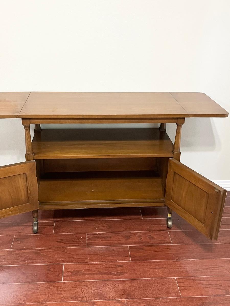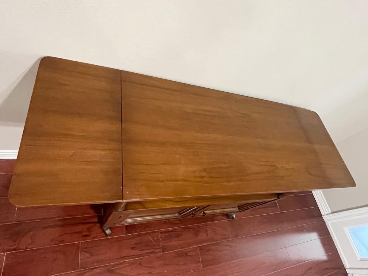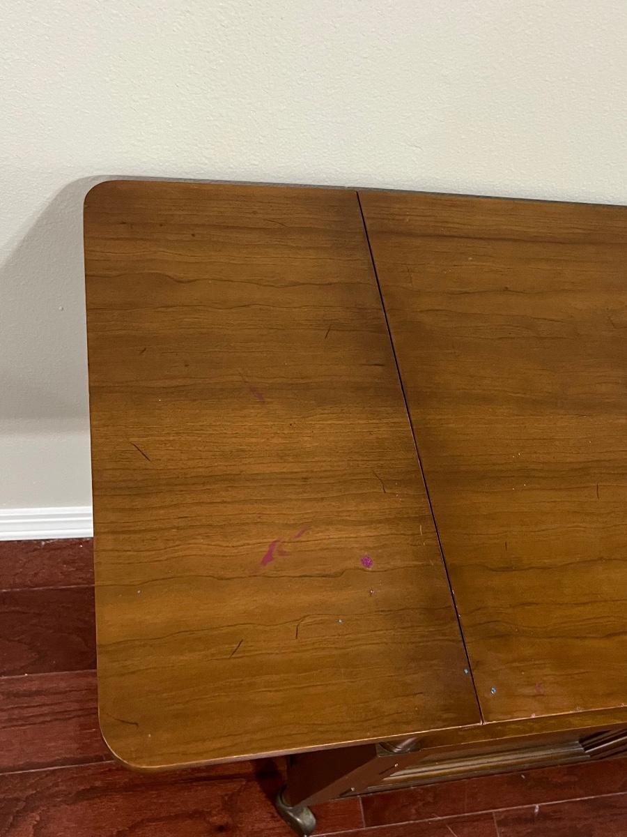 30” H x 53” W x 18” D with leaves up ~ minor scratches ~ minor wear & tear ~ one leaf has some finger nail polish on it ~ no brand name found