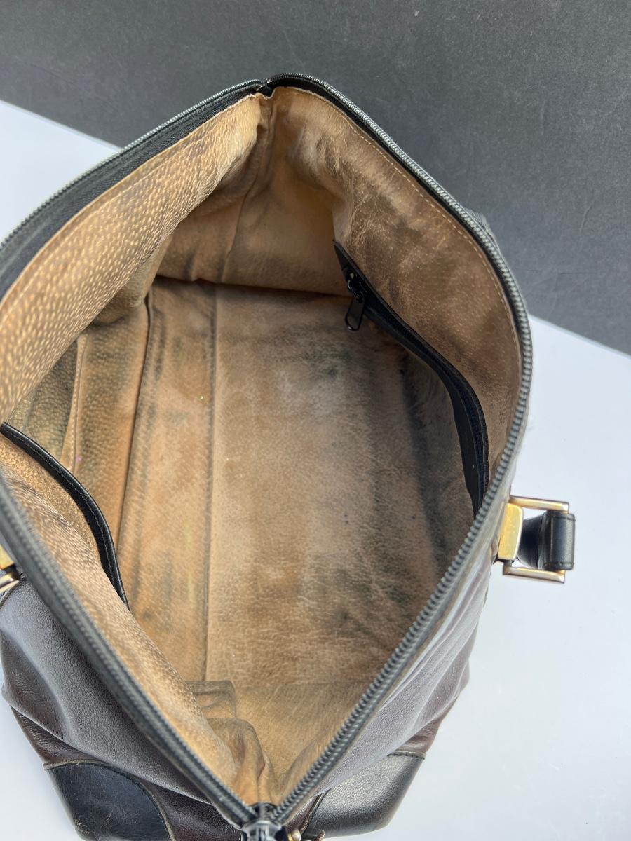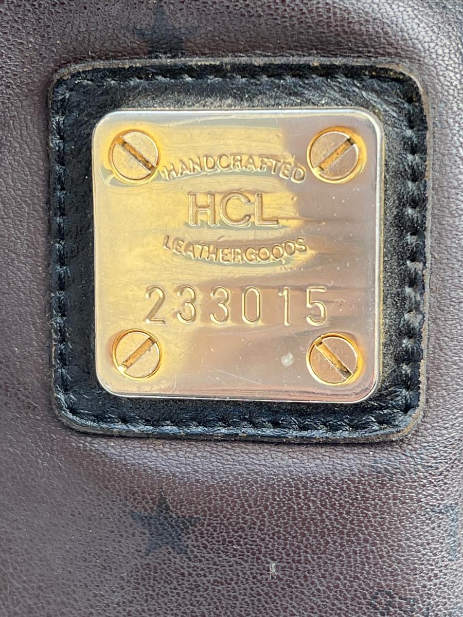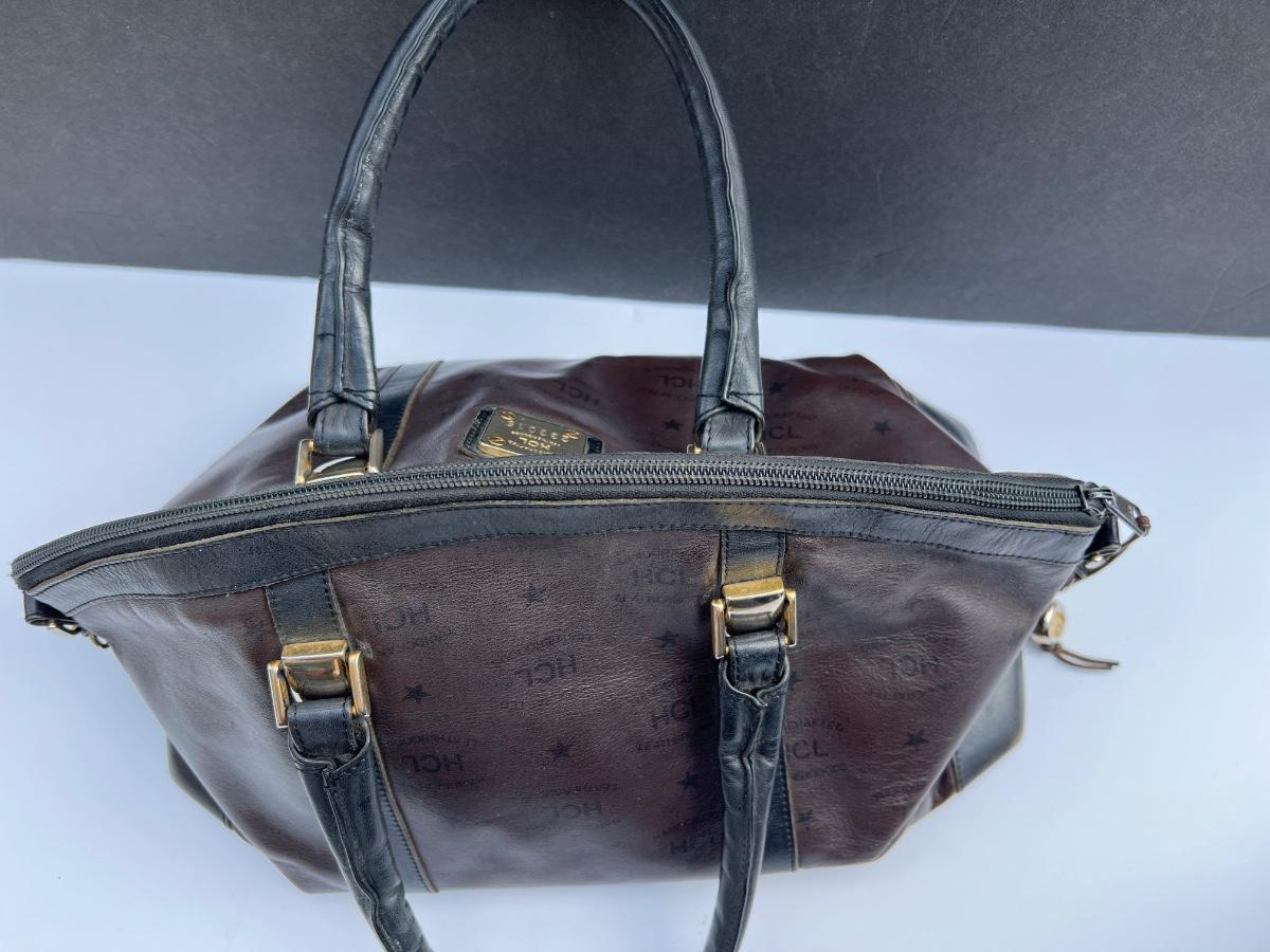 Handcrafted genuine leather HCL #233015 Brown Handbag with handles. HCL leather stamp on inside of purse. Zipper enclosure and zippered pocket inside. This is a vintage bag with minimal wear on outside and soiling to the suede on the inside. 13” x 8.5”