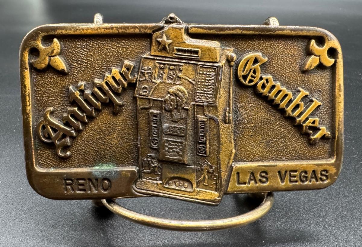 Antique Gambler Large Brass Belt Buckle - Reno Las Vegas
