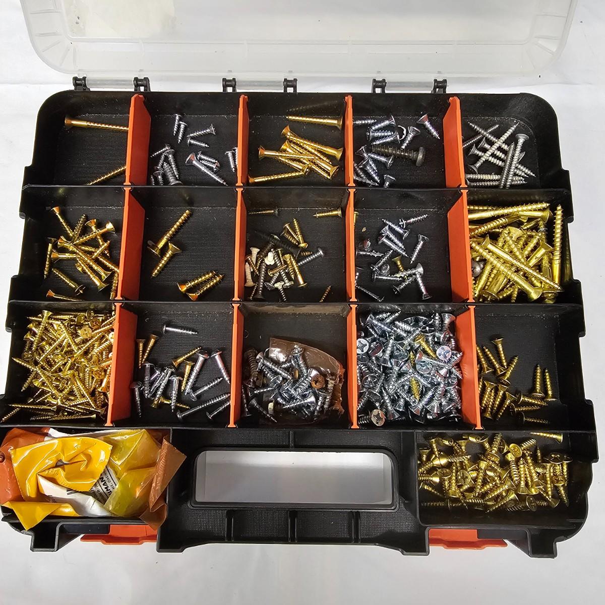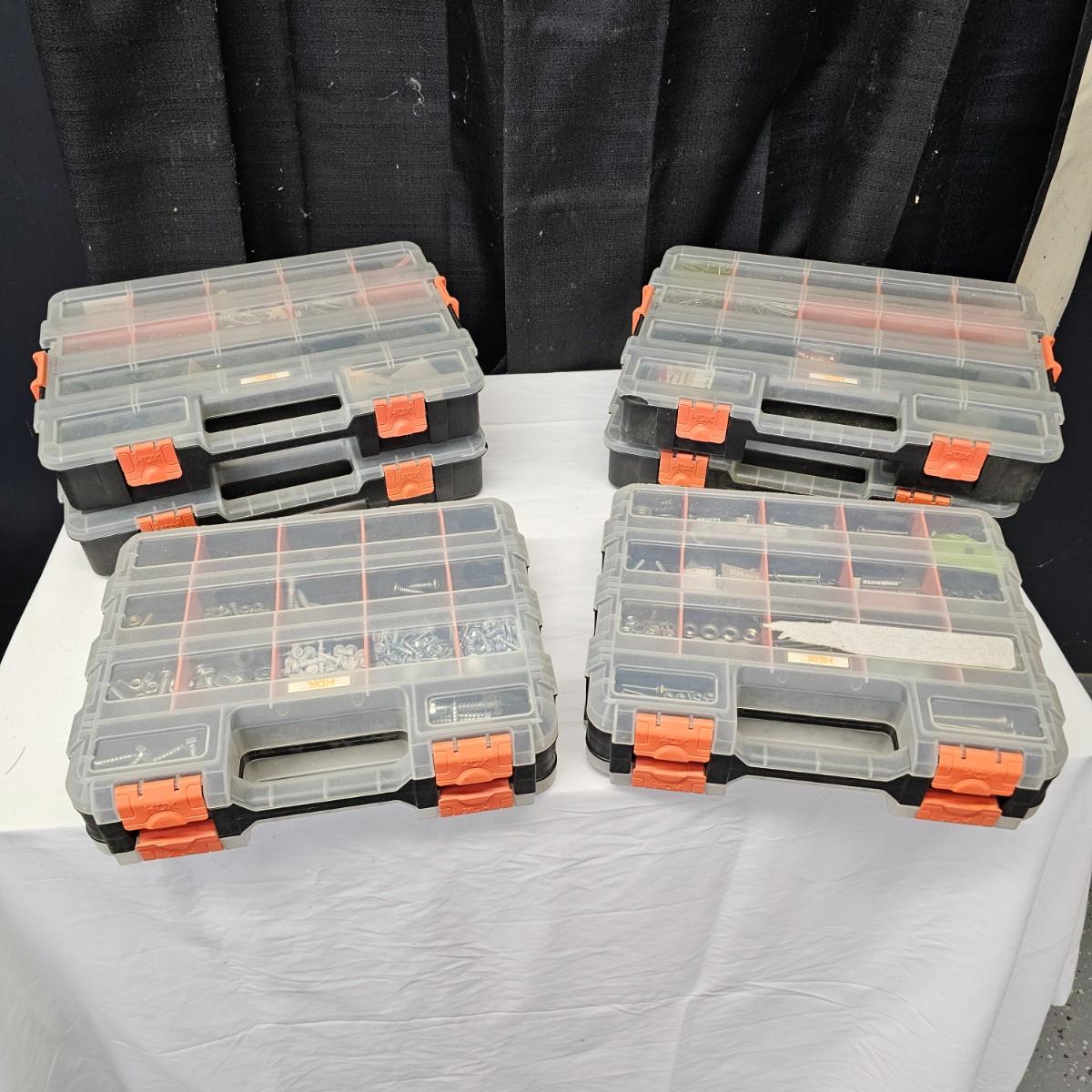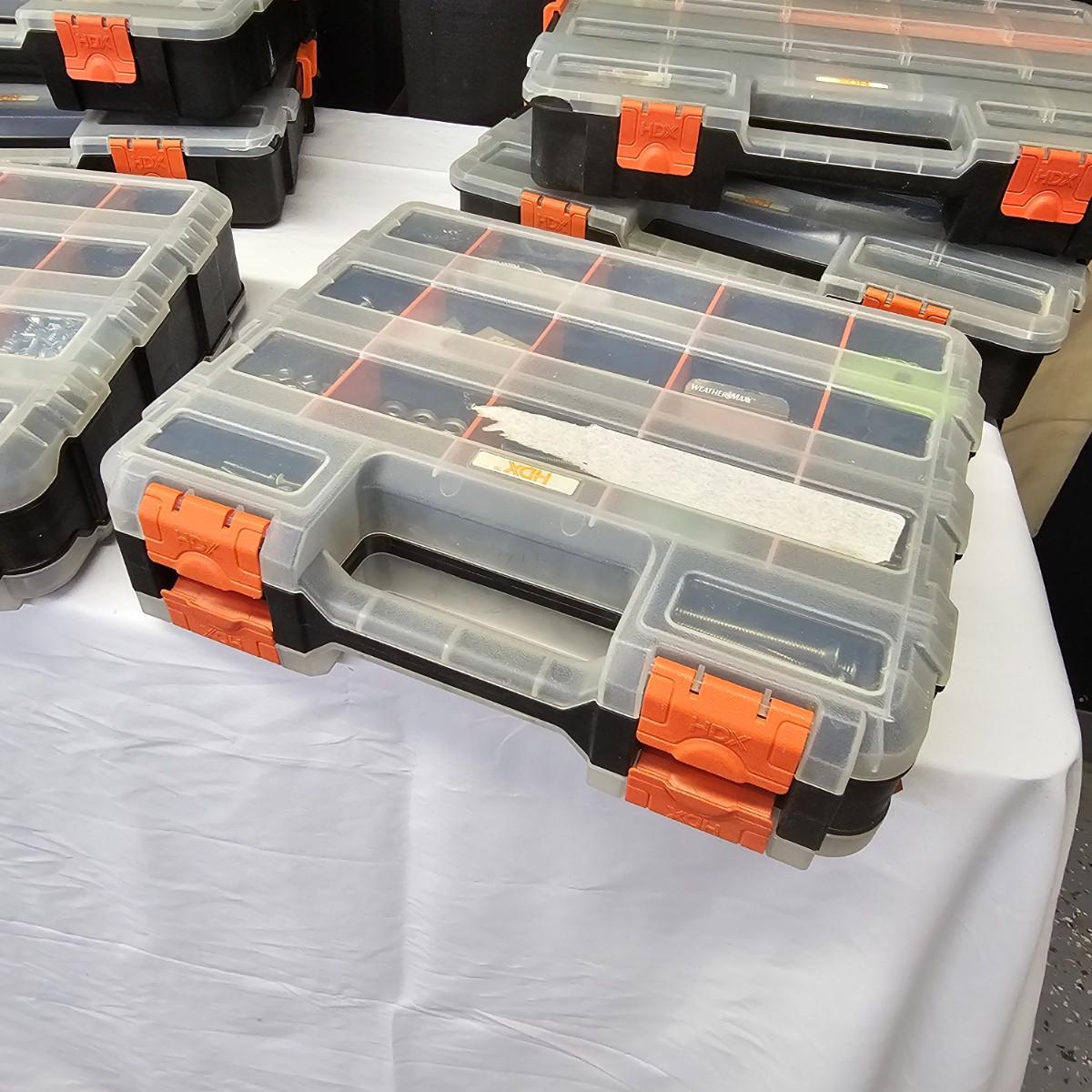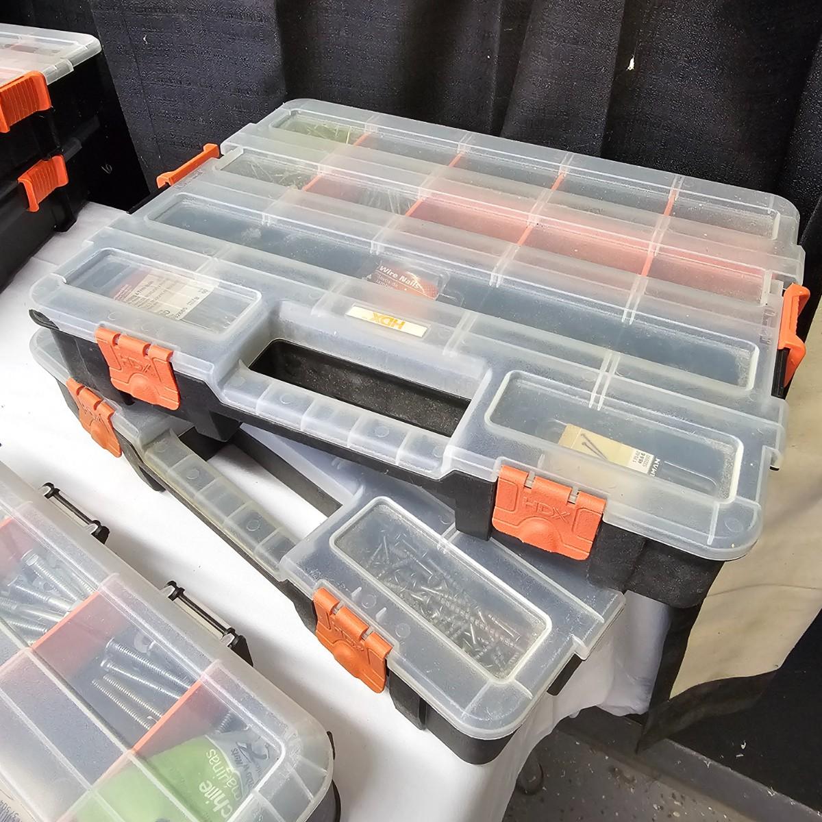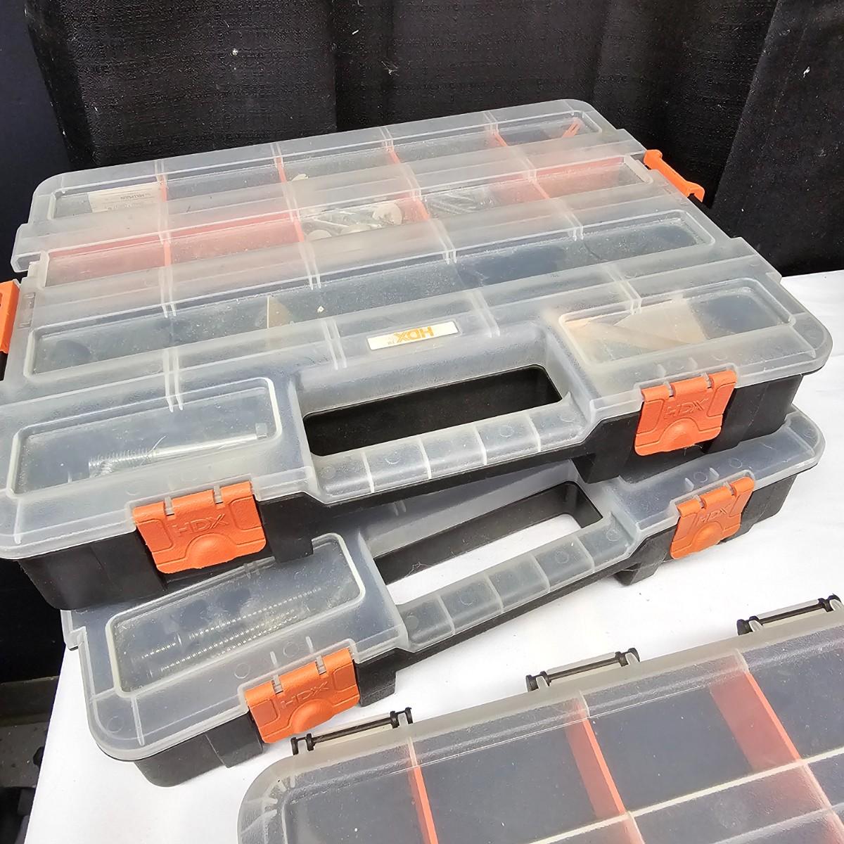 Solid locking plastic boxes by HDX full of all sorts of hardware including screws, nails and more. Many compartments with brass items in them.two different sizes, larger are 14.5" x 11.5" x 2.5"H and are single sided, four total. The two smaller boxes are double sided and measure 12.5" x 11" x 3"H. All items stack. Also includes another long set of drawers with miscellaneous hardware items in them. This box is 19" x 6" x 9"H. See photos for details. Local pickup only.