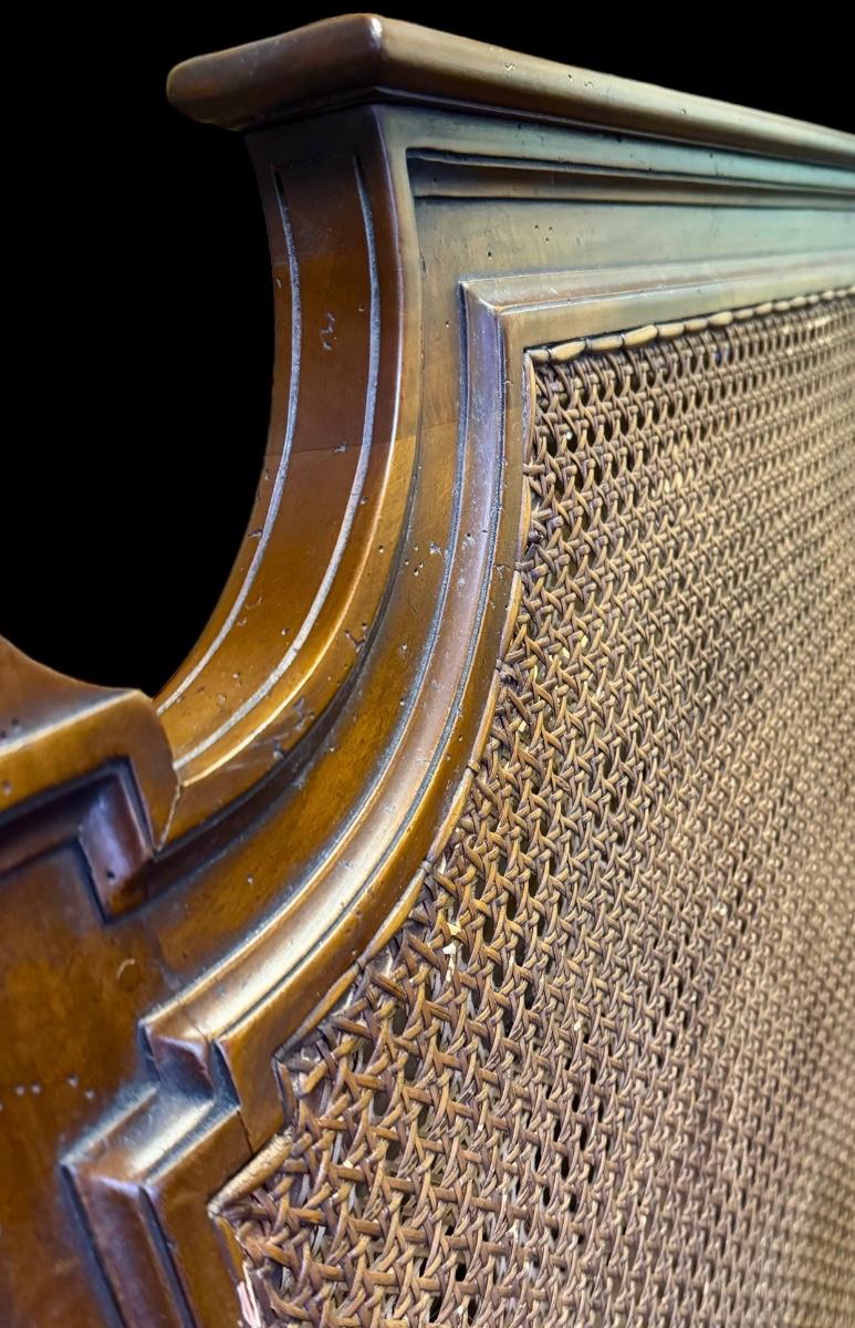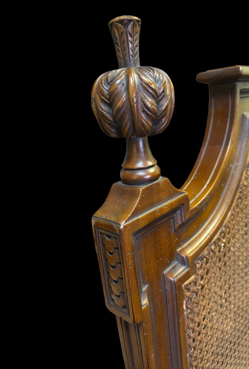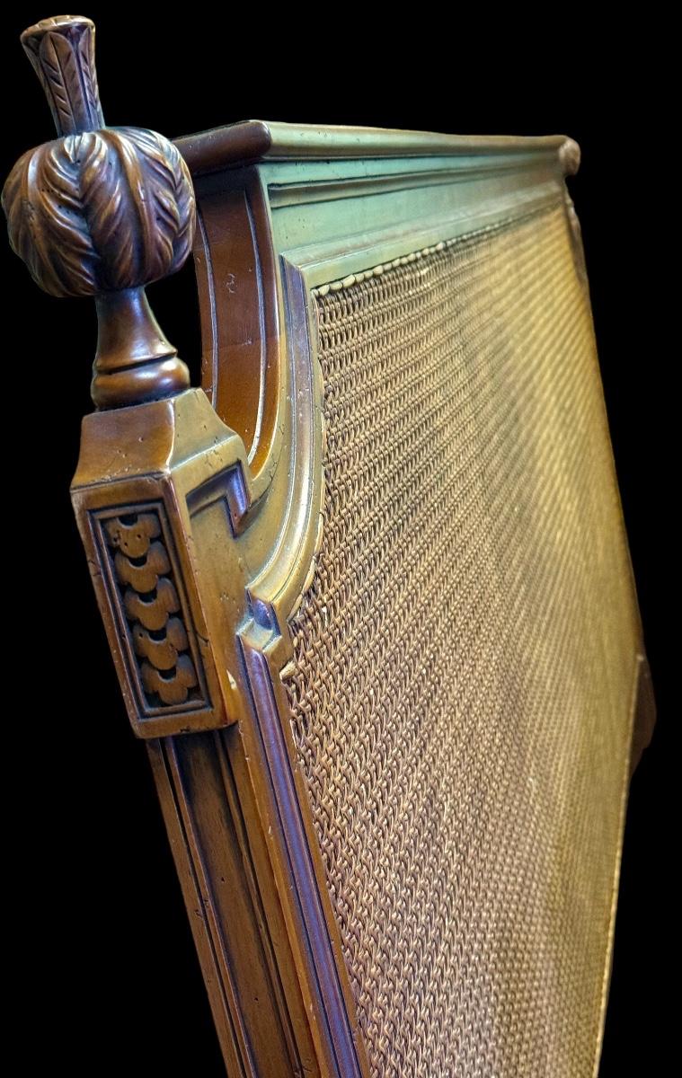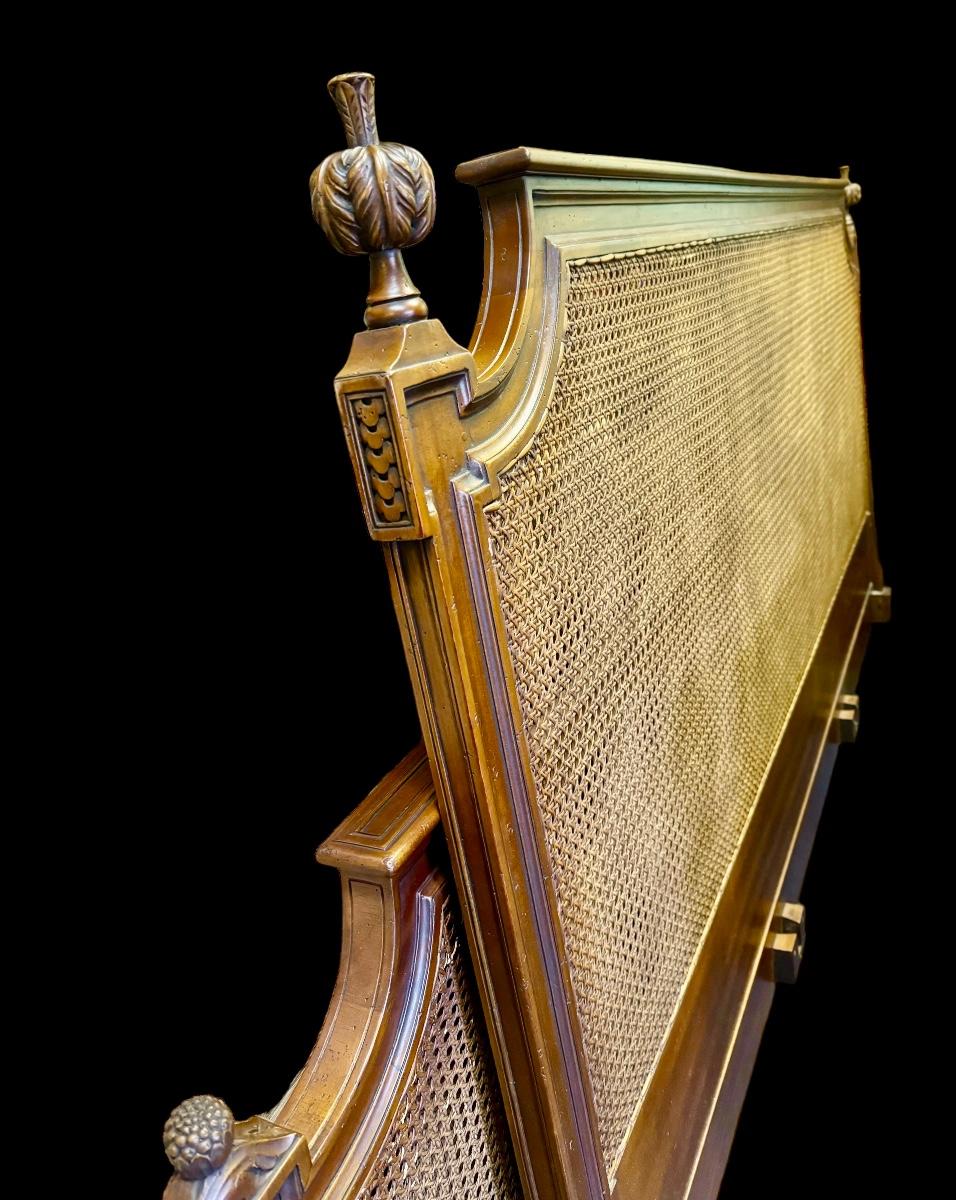 This beautiful bed has lovely details - carved finials and a nice rich patina ( possibly fruitwood ) along with the vintage caned back.