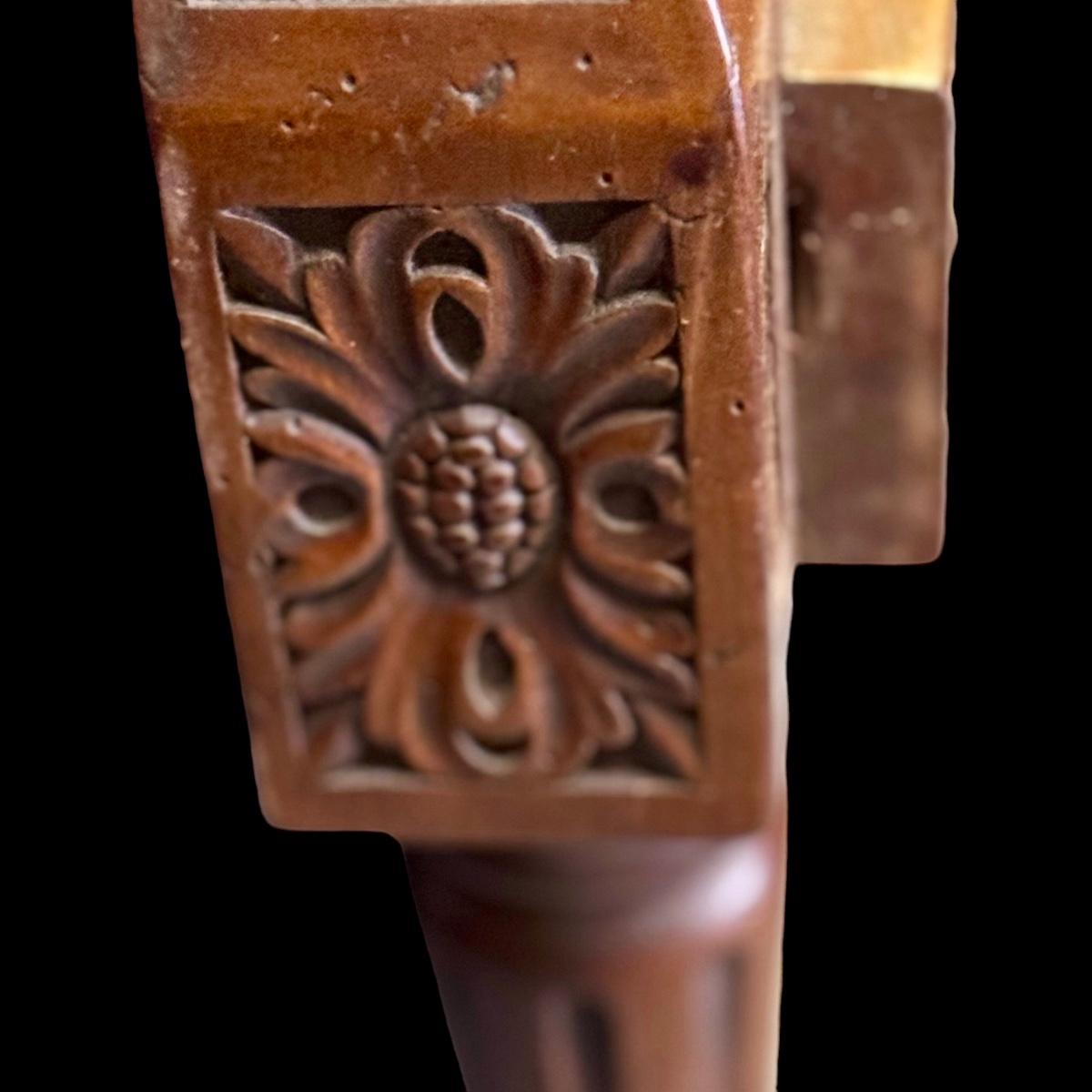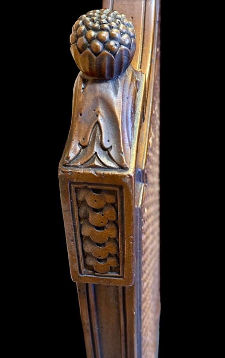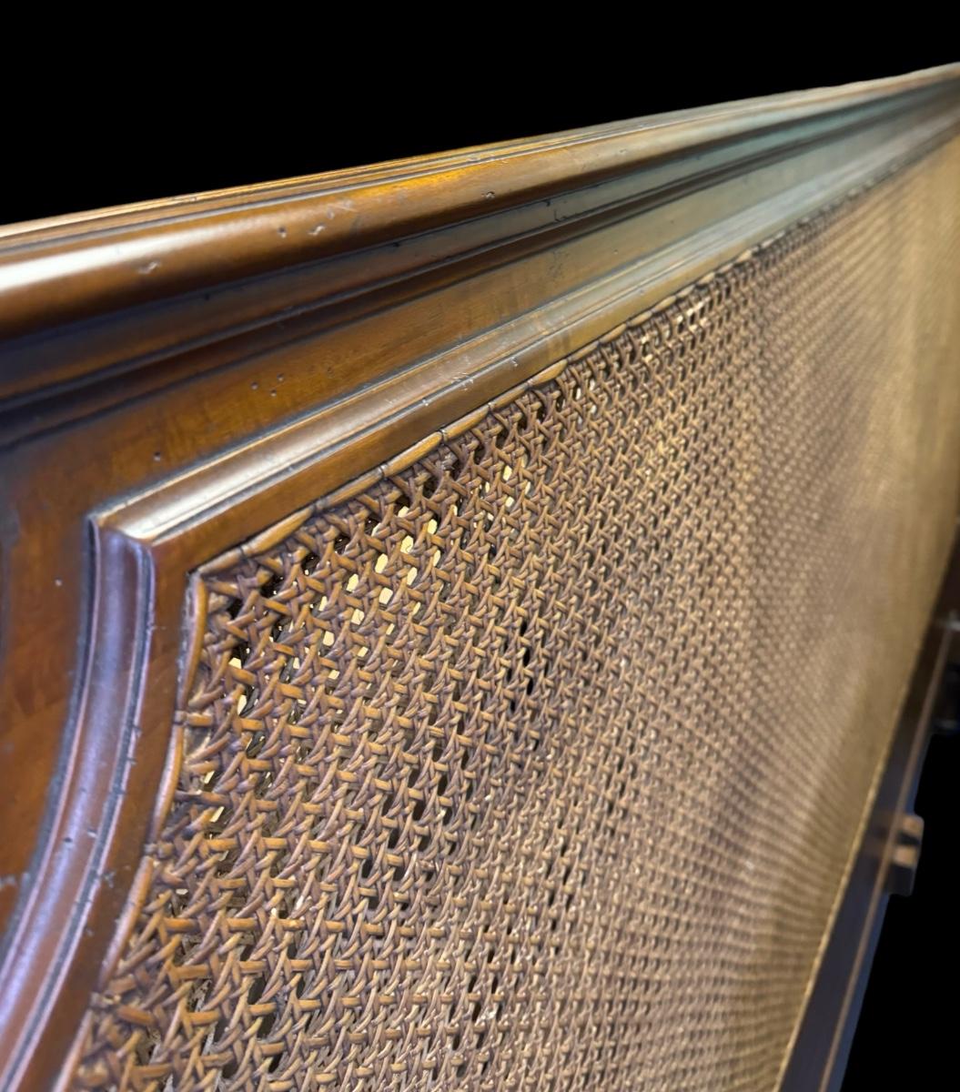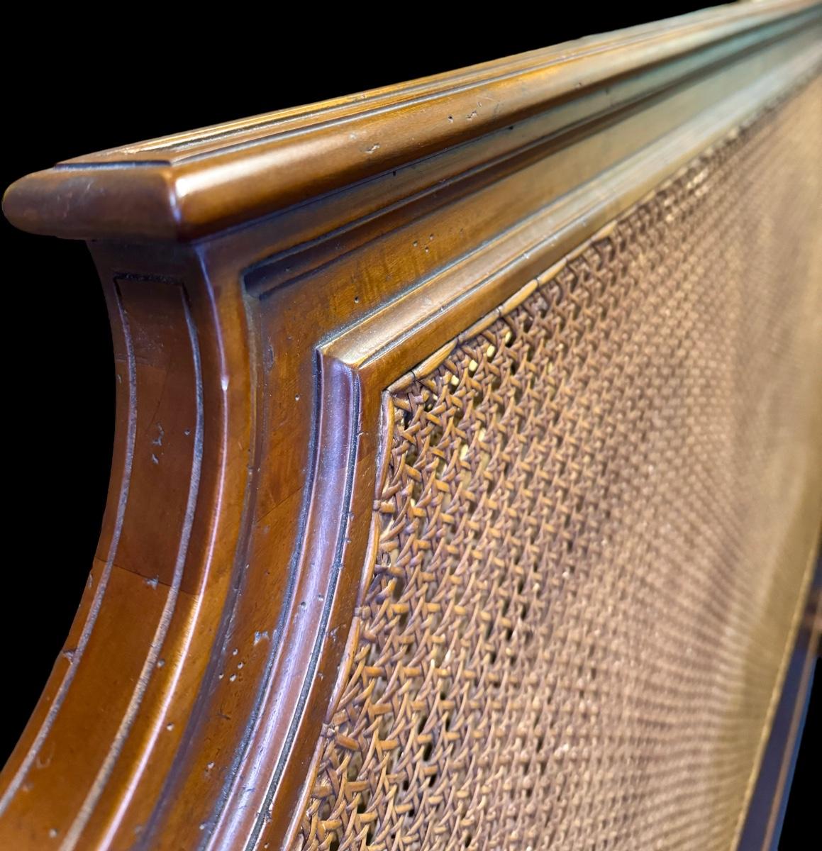 This beautiful bed has lovely details - carved finials and a nice rich patina ( possibly fruitwood ) along with the vintage caned back.