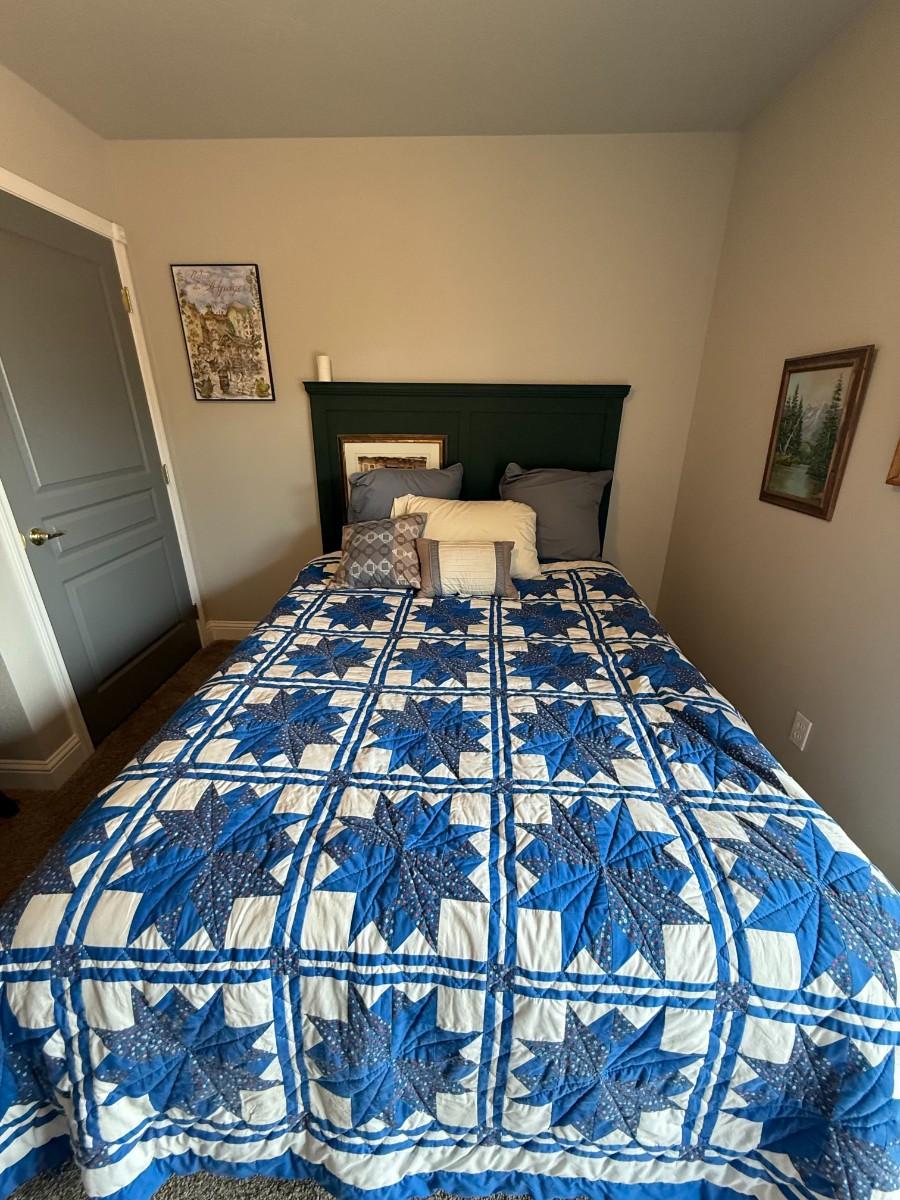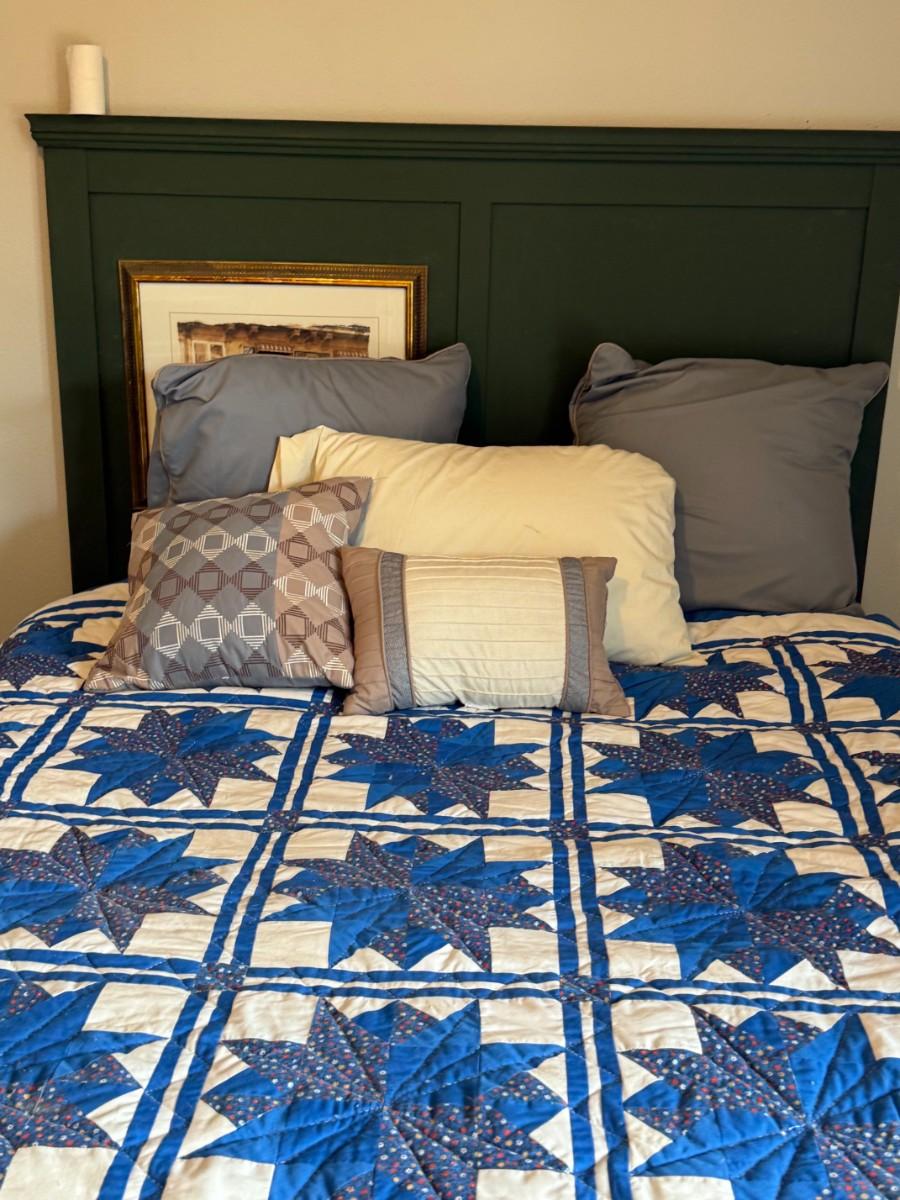 Green headboard, mattress (no weird stains) Beautiful handcrafted quilt featuring blue starburst patterns on white. Clean, vibrant, and perfect for cozy cottage or Americana decor.