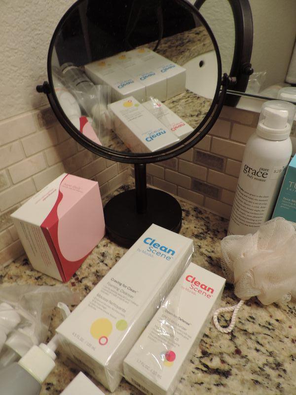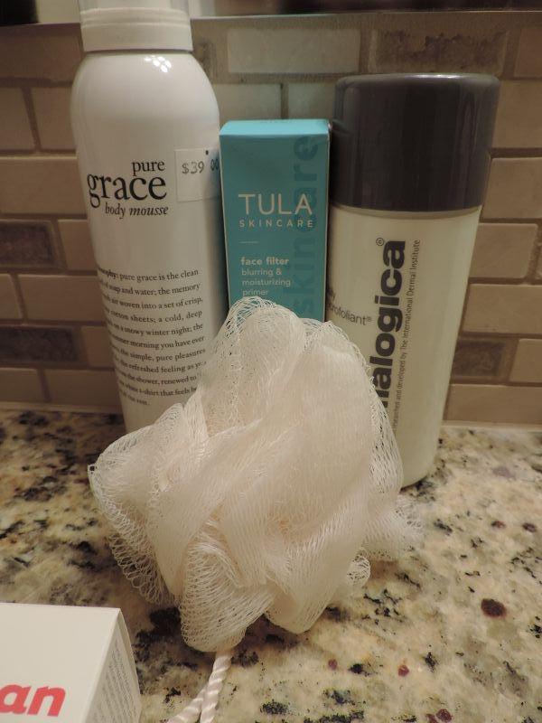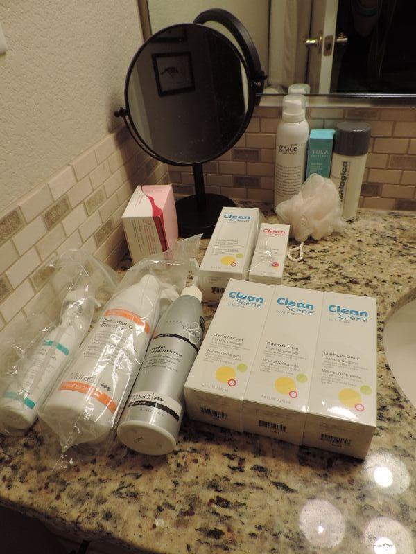 COUNTER 2 WAY MIRROR. SKIN CLEANSER AND EXFOLIATING BY MURAD, GRACE BODY MOUSSE, TULA FACE FILTER, AND MORE