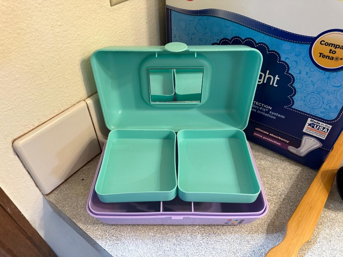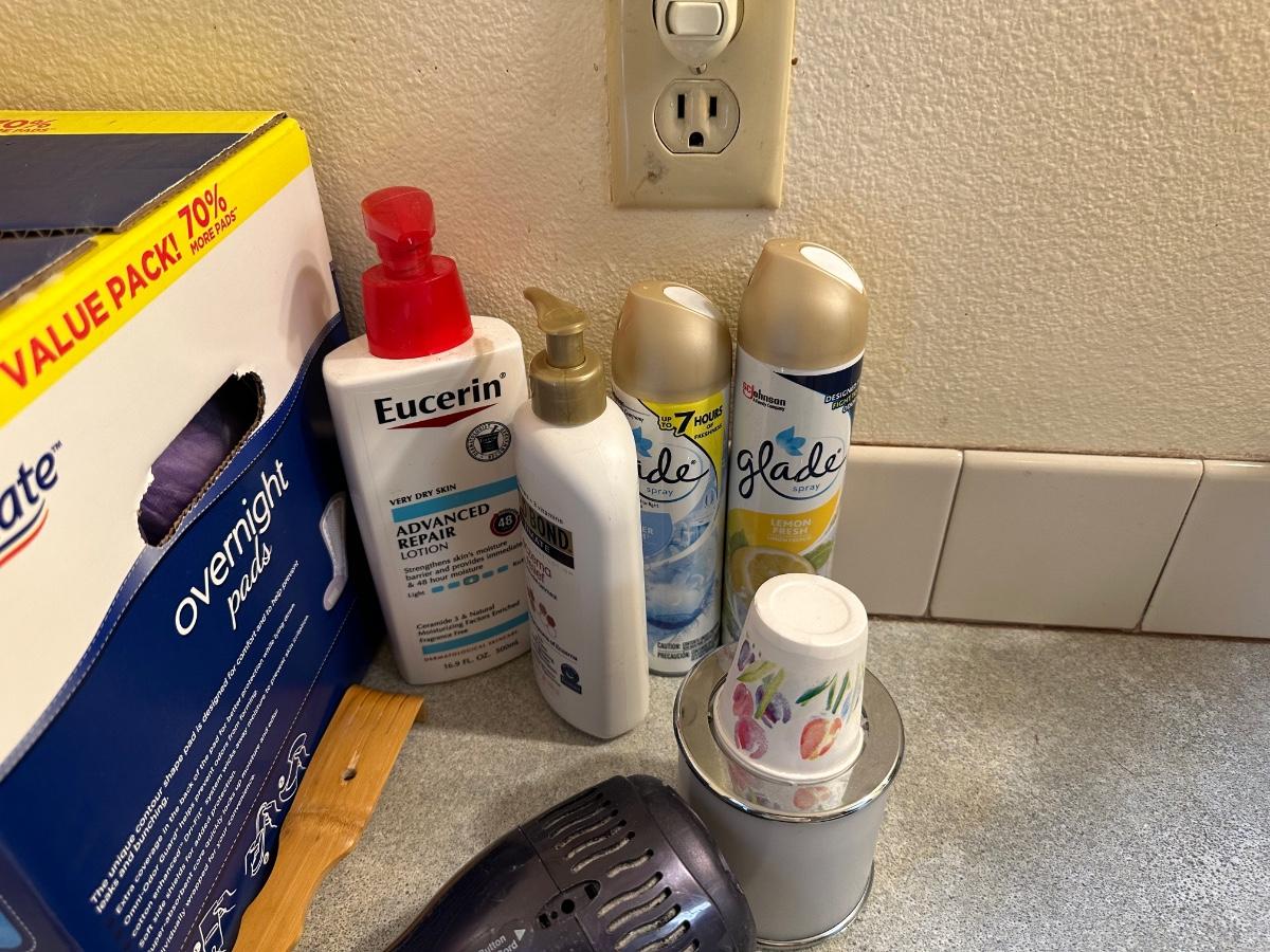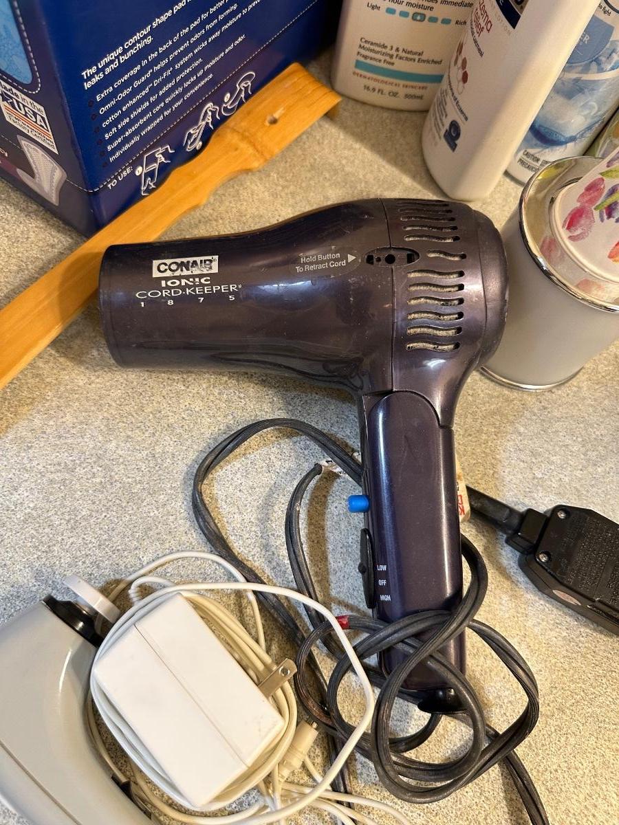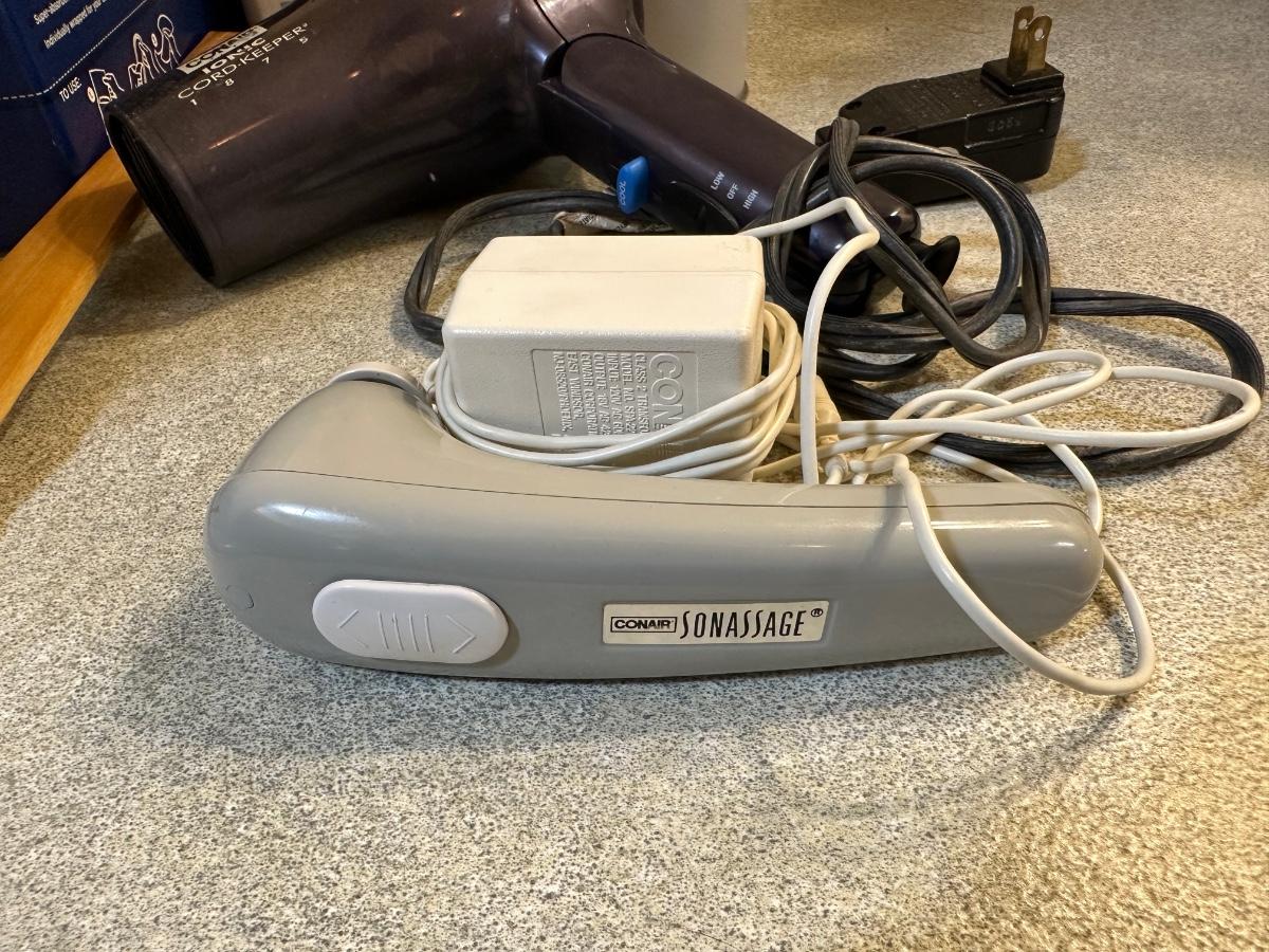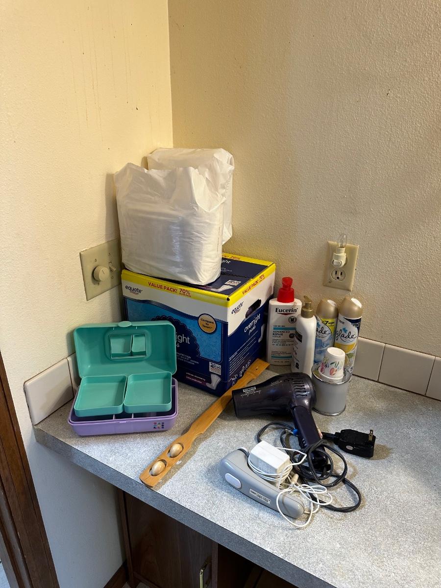 Lotions, blow dryer, Conair Sonassage, plastic Organizer and more.