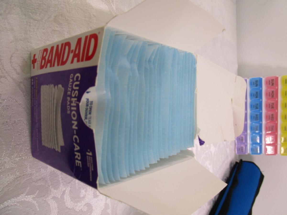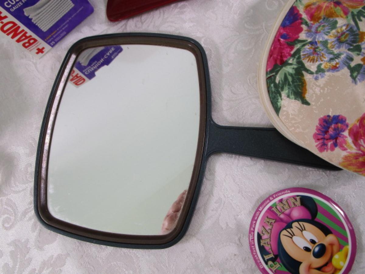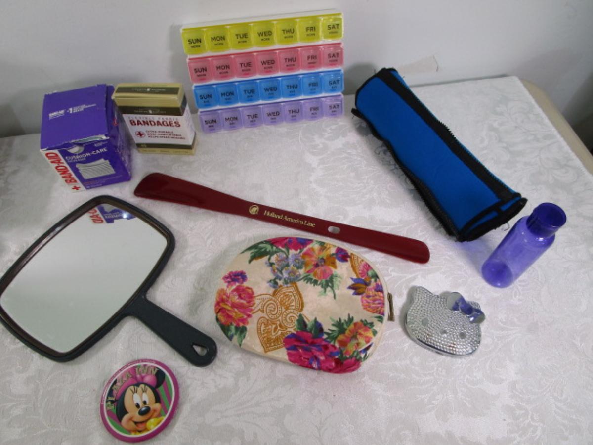 Box gauze pads, bandages, pill organizer, stomach wrap up to 39", shoe horn, mirror, makeup bag, Hello Kitty compact mirror, 3 oz travel bottle, Minnie Mouse pin